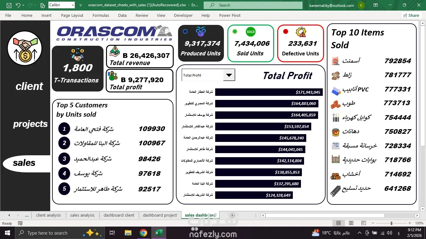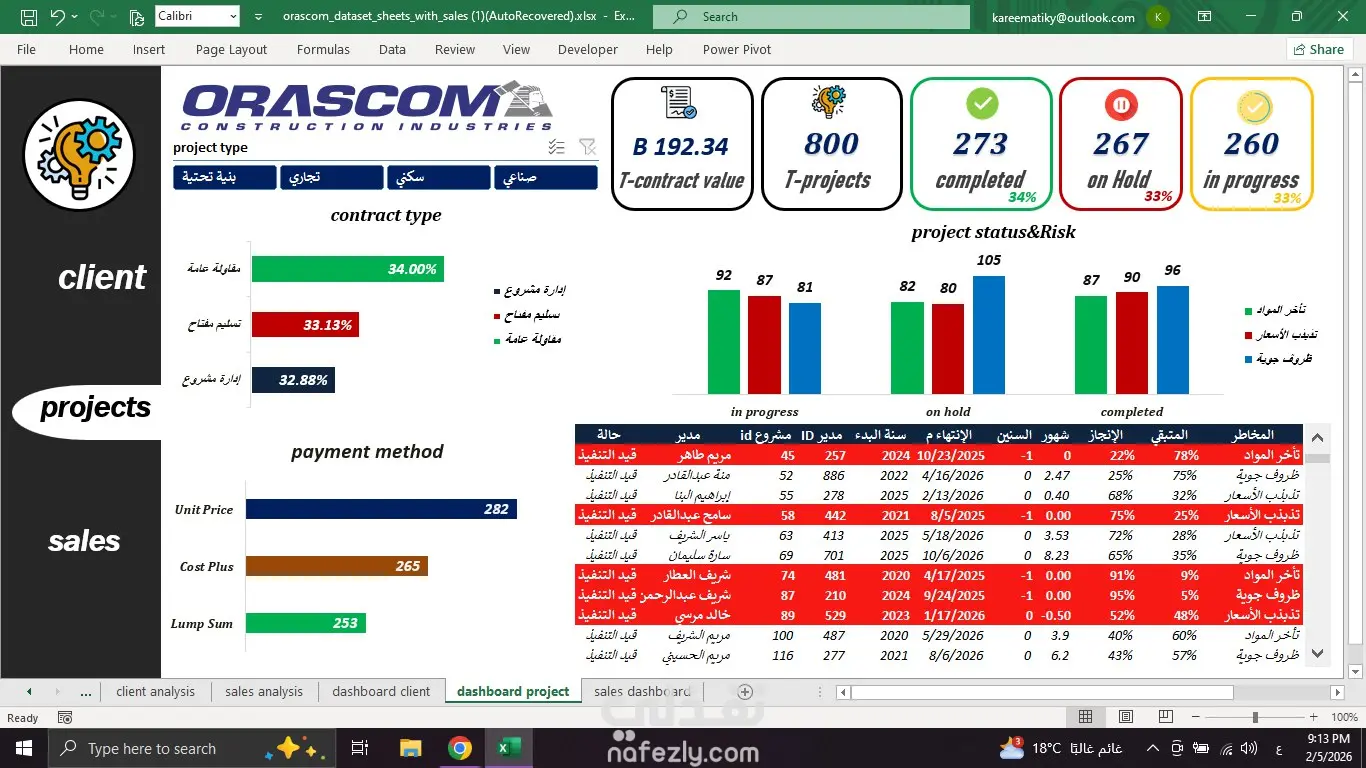 يستعرض هذا المشروع نظاماً تحليلياً شاملاً (Full Data Cycle) يهدف إلى تحويل بيانات المشاريع والعملاء والمبيعات المعقدة إلى رؤى بصرية سهلة الفهم، مما يساعد الإدارة العليا على مراقبة الأداء العام وتحديد المخاطر بدقة. المحاور الرئيسية للمشروع: 1. لوحة تحكم المبيعات والأداء المالي (Sales Dashboard): مراقبة الإنتاجية: تتبع إجمالي الوحدات المنتجة (أكثر من 9 مليون وحدة) ومقارنتها بالوحدات المباعة والوحدات التالفة لضبط الجودة. تحليل الربحية: عرض إجمالي الإيرادات والأرباح، مع تصنيف العملاء الأكثر شراءً والمواد الإنشائية الأكثر مبيعاً (مثل الأسمنت والزلط وأنابيب الـ PVC). هرم الأرباح: تحليل الشركات التابعة أو العملاء الذين حققوا أعلى هوامش ربح للشركة. 2. لوحة إدارة المشاريع والمخاطر (Project Dashboard): حالة المشاريع: متابعة لحظية لعدد المشاريع (800 مشروع) مقسمة بين (قيد التنفيذ، منتهية، ومتوقفة مؤقتاً). تقييم المخاطر: جدول تفصيلي يربط كل مشروع بمديره، ونسبة الإنجاز، وأهم المخاطر التي تواجهه (مثل تأخر المواد، تذبذب الأسعار، أو الظروف الجوية). تحليل التعاقدات: توضيح طرق الدفع المفضلة وتصنيف المشاريع حسب نوع العقد (إدارة مشروع، تسليم مفتاح، مقاولة عامة). 3. لوحة تحليل قاعدة العملاء (Client Dashboard): تصنيف العملاء: تقسيم العملاء إلى أفراد وشركات، مع مراقبة الحالة (نشط أو معلق). أولويات التواصل: تحليل العملاء بناءً على الأولوية (A, B, C) وتحديد قنوات التواصل المفضلة لكل فئة (واتساب، هاتف، إيميل) لضمان كفاءة خدمة العملاء. القيمة المضافة في تنفيذ المشروع: الربط الديناميكي: استخدام الـ Slicers والـ Timelines للتنقل بين السنوات (من 2018 إلى 2024) وتحديث كافة الأرقام فورياً. التنبيه المبكر: استخدام الألوان (الأخضر، الأصفر، الأحمر) في مؤشرات الأداء للإشارة إلى مناطق الخطر في المشاريع المتوقفة أو الوحدات التالفة. واجهة مستخدم احترافية: تصميم عصري يعتمد على نظام "التبويبات" (Tabs) الجانبية للتنقل السهل بين أقسام المشروع (Client, Projects, Sales)