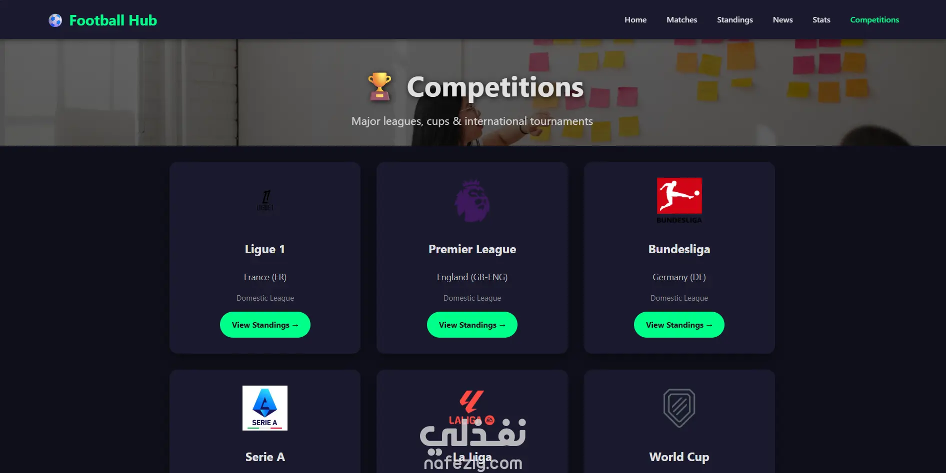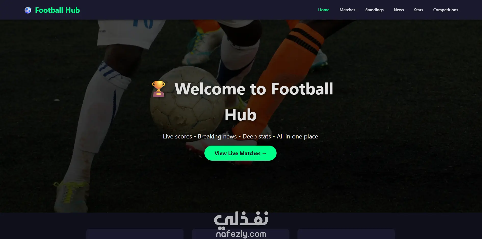 قمت بتصميم وتطوير موقع "Football Hub"، وهو واجهة ويب متكاملة (Front-End) تهدف لعشاق كرة القدم. يوفر الموقع تجربة مستخدم سلسة لمتابعة جداول المباريات، ترتيب الدوريات العالمية (مثل الدوري الإنجليزي والإسباني)، وآخر أخبار الانتقالات.