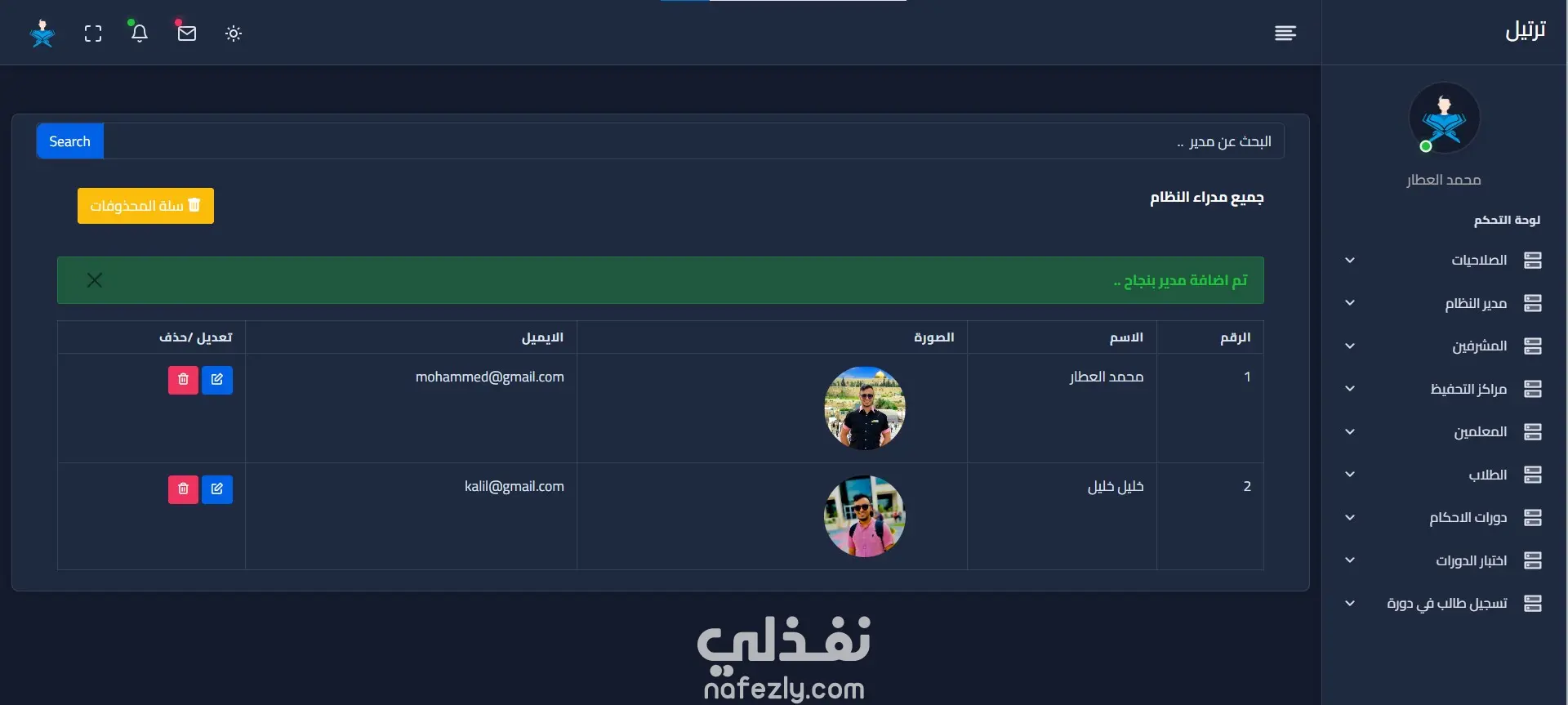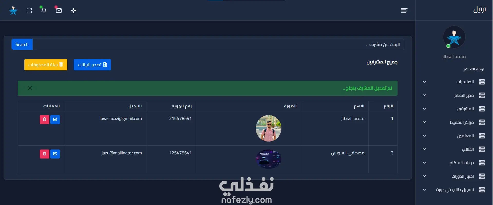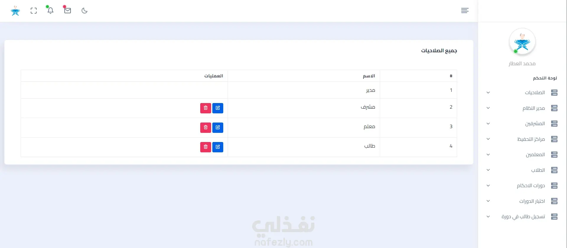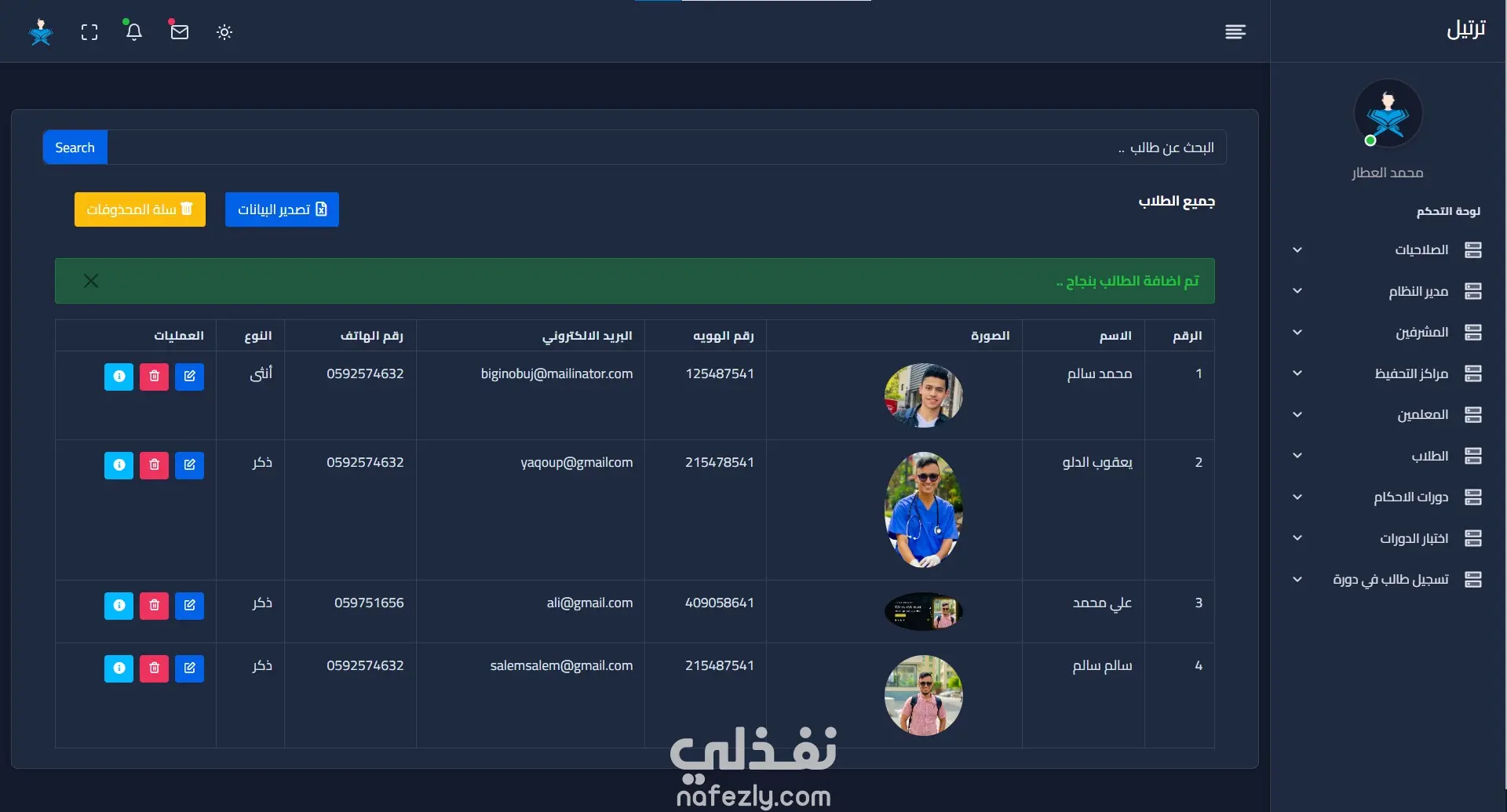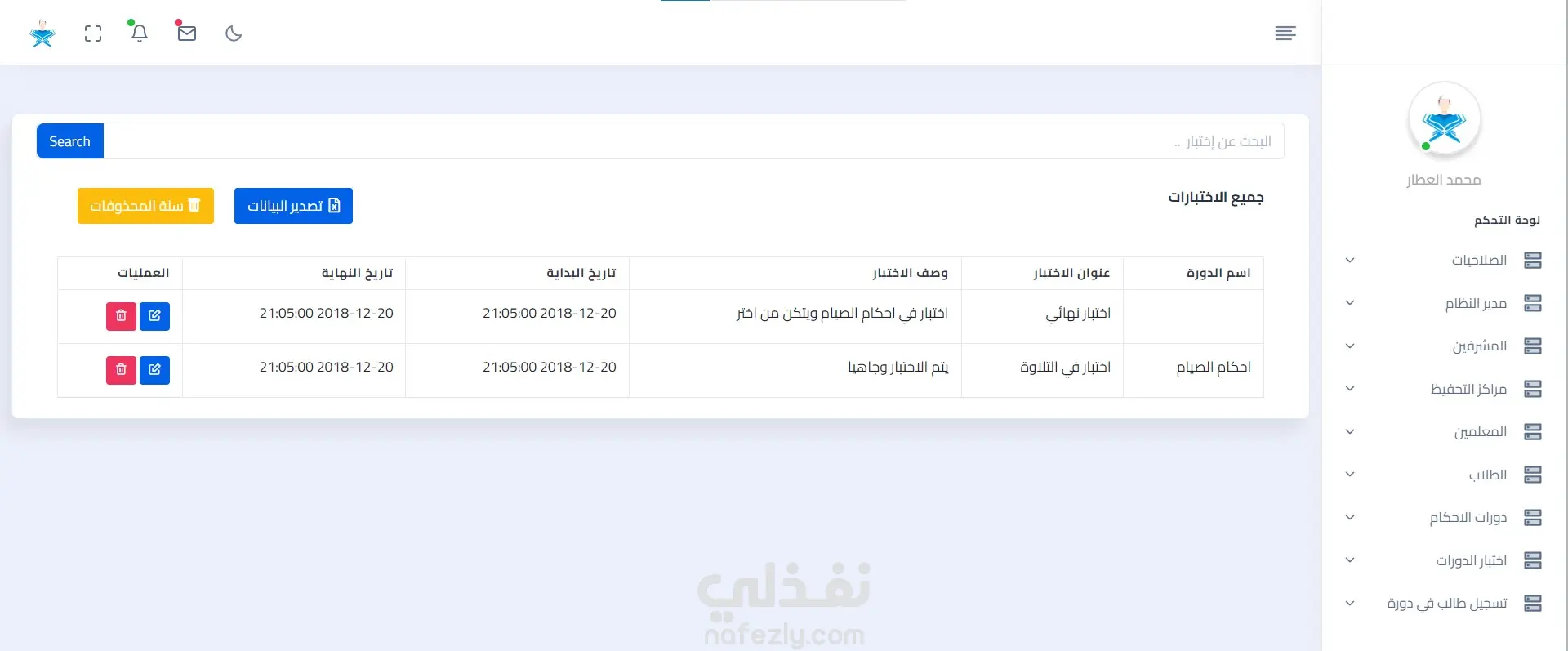 *****مشروع إدارة الدورات في دار القرآن الكريم******* تنظيم الدورات التعليمية لتحفيظ القرآن الكريم. يهدف مشروع إدارة الدورات إلى تسهيل وتحسين عملية إدارة هذهالدورات التعليمية وتحقيق أقصى استفادة منها. يساعد المشروع على تنظيم الجداول وتتبع تقدم المتدربين وإدارة الموارد المتاحة بشكل أفضل. مكونات المشروع: نظام قاعدة بيانات مركزية لتخزين معلومات المتدربين والمدرسين ومراكز التحفيظ والدورات واجهة مستخدم سهلة الاستخدام لتسجيل المتدربين والمعلمين والمشرفين والدورات فيمكنني من خلال المشروع ⭐️تسجيل الدخول كطالب جديد حيث عندما يتم تسجيل دخول جديد يتم ارسال رسالة الي الايميل لتفعيل الحساب ⭐️تسجيل الدخول ⭐️ إدارة وإنشاء دورات للاحكام. ⭐️اضافة معلمين حيث المعلم يتبع لمركز واحد ⭐️اضافة مشرف للمعلم ⭐️اضافة طلاب ⭐️اضافة مدير للنظام (يمكن اضافة اكتر من مدير) ⭐️اضافة مركز تحفيظ ⭐️اضافة اختبار للدورة مع تحديد موعد الاختبار بحيث تظهر في واجهة الطالب موعد اختبار الدورة المسجل فيها ⭐️إضافة صلاحيات لكل من المدير والمشرف والمعلم والطالب. ⭐️تسجيل الطالب في دورة -- حيث يوجد في كل جدول تصدير للبيانات لملف excel وعمل soft delete ** اللغات المستخدمة : - php laravel - JavaScript - html - css - Bootstrap