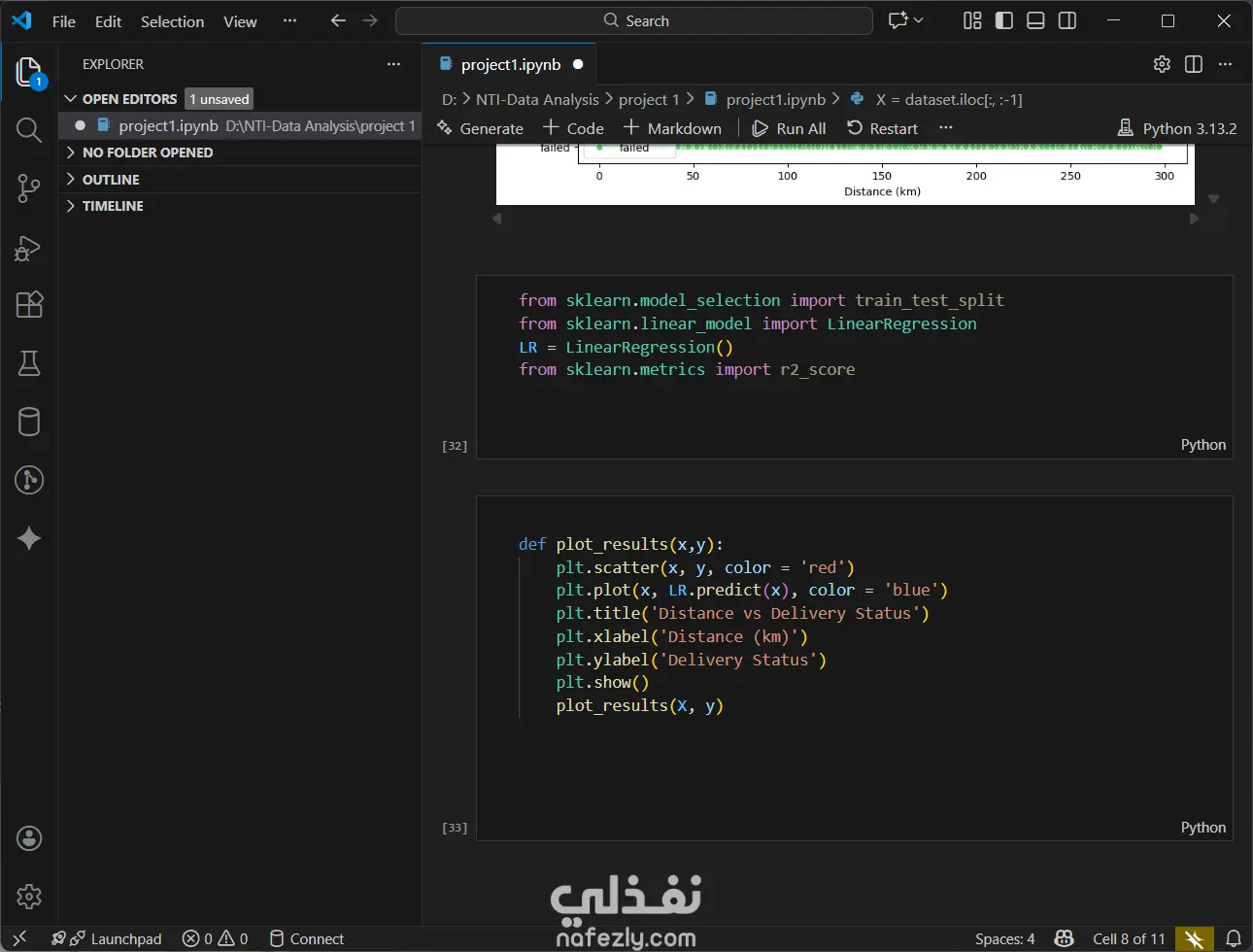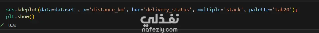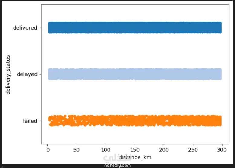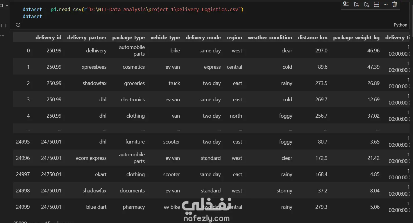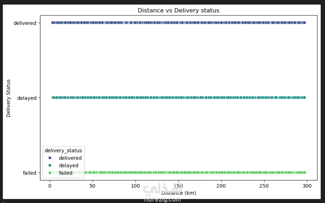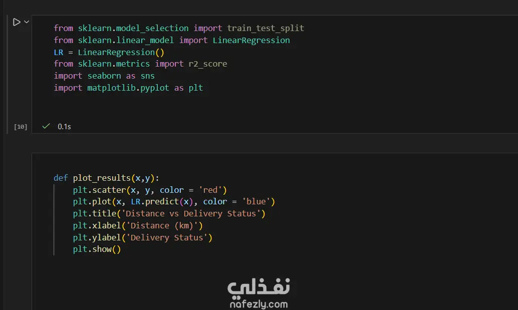 1. إعداد البيئة واستيراد البيانات المكتبات المستخدمة: تبدأ الصور باستيراد المكتبات الأساسية لتحليل البيانات وتصورها مثل pandas للمعالجة، وnumpy للعمليات الحسابية، وmatplotlib وseaborn للرسم البياني. تحميل الملف: يتم قراءة ملف بيانات من نوع CSV باسم Delivery_Logistics.csv يحتوي على 25,000 صف و15 عموداً. 2. استكشاف البيانات (Exploratory Data Analysis) نظرة عامة: تظهر البيانات معلومات حول رقم الشحنة، شريك التوصيل، نوع المركبة، المسافة بالكيلومتر، الوزن، وحالة التوصيل. الإحصاء الوصفي: تم استخدام أمر dataset.describe() لإظهار القيم الإحصائية (المتوسط، الانحراف المعياري، القيم الصغرى والعظمى) للأعمدة الرقمية مثل المسافة والوزن وتكلفة التوصيل. تنظيف البيانات: تم التحقق من وجود صفوف مكررة باستخدام duplicated()، والتأكد من عدم وجود قيم فارغة (Null values) في كافة الأعمدة لضمان جودة البيانات. 3. التصور البياني (Data Visualization) تم إنشاء رسوم بيانية من نوع Scatter Plot (مخطط تشتت) لدراسة العلاقة بين المسافة بالكيلومتر وحالة التوصيل (ناجح، متأخر، فاشل). يظهر من الرسم توزيع نقاط البيانات بشكل خطي أفقي يمثل الحالات الثلاث المختلفة عبر مختلف المسافات. 4. النمذجة والتنبؤ (Machine Learning) بناء النموذج: تم استخدام مكتبة sklearn لاستيراد نموذج الارتباط الخطي (Linear Regression). دالة النتائج: تم كتابة دالة برمجة باسم plot_results تهدف إلى رسم البيانات الحقيقية كنقاط حمراء، ومقارنتها بخط التوقع الخاص بالنموذج باللون الأزرق.