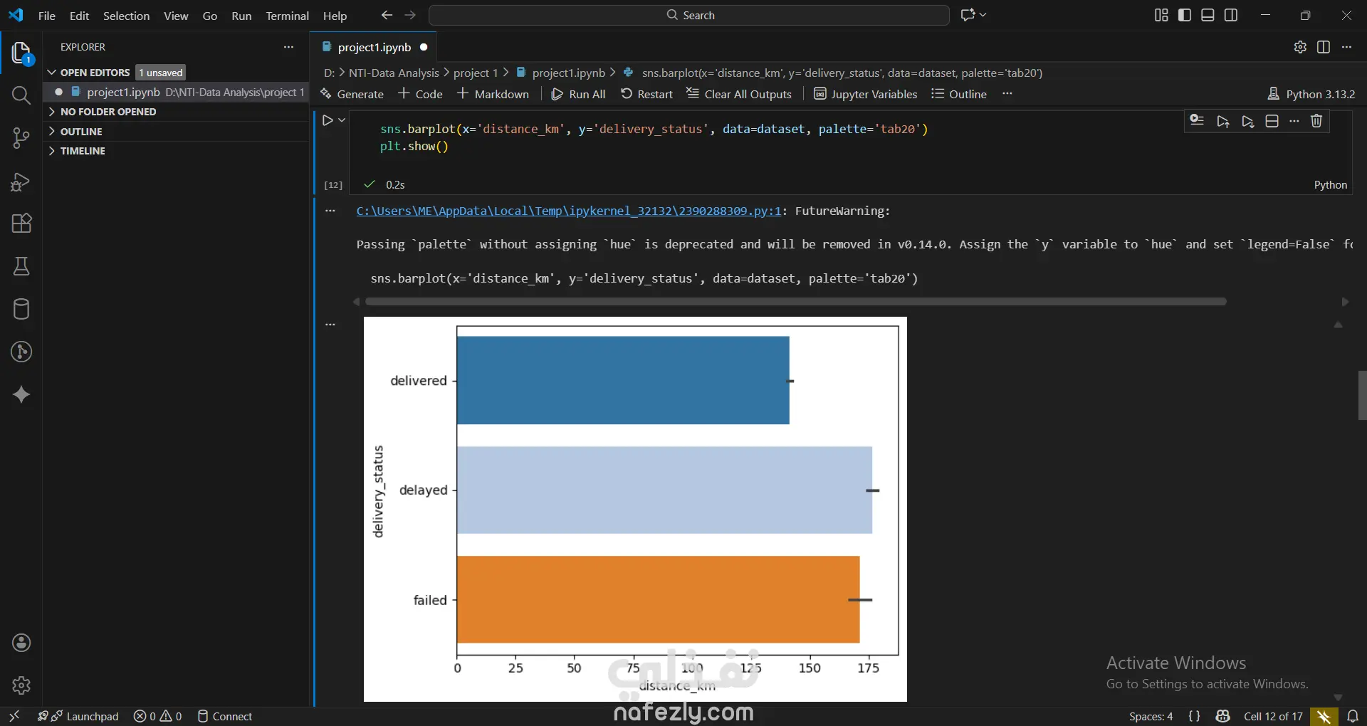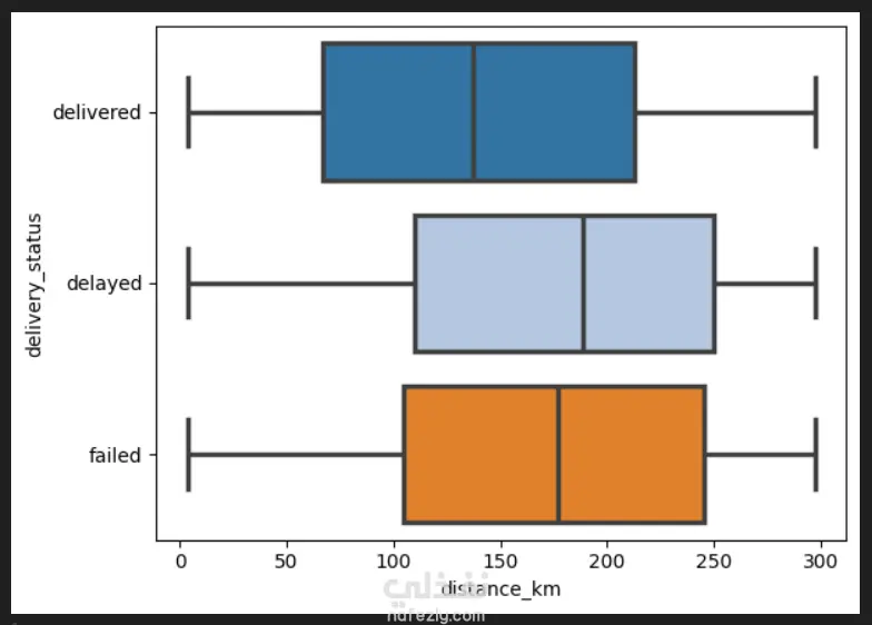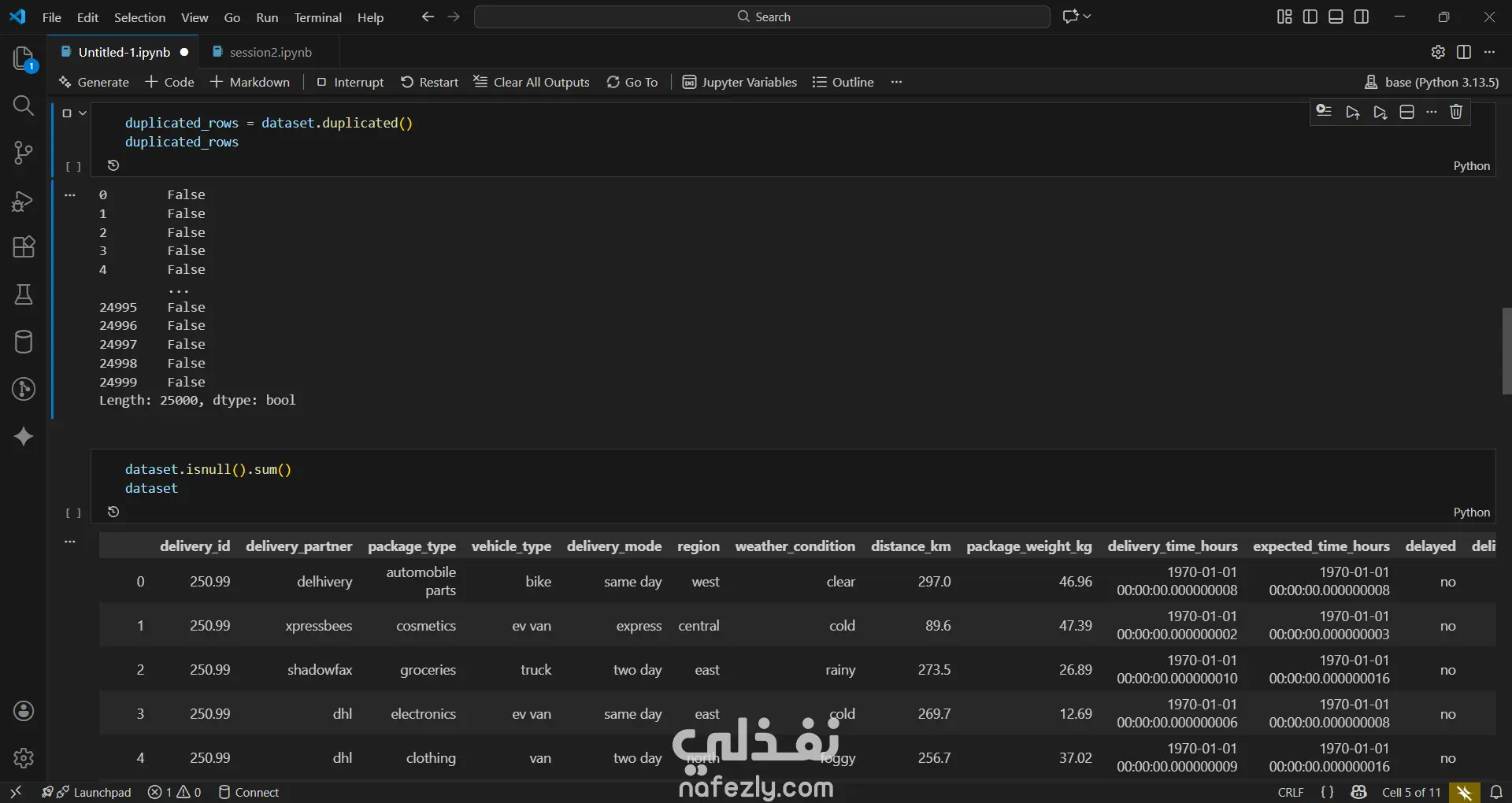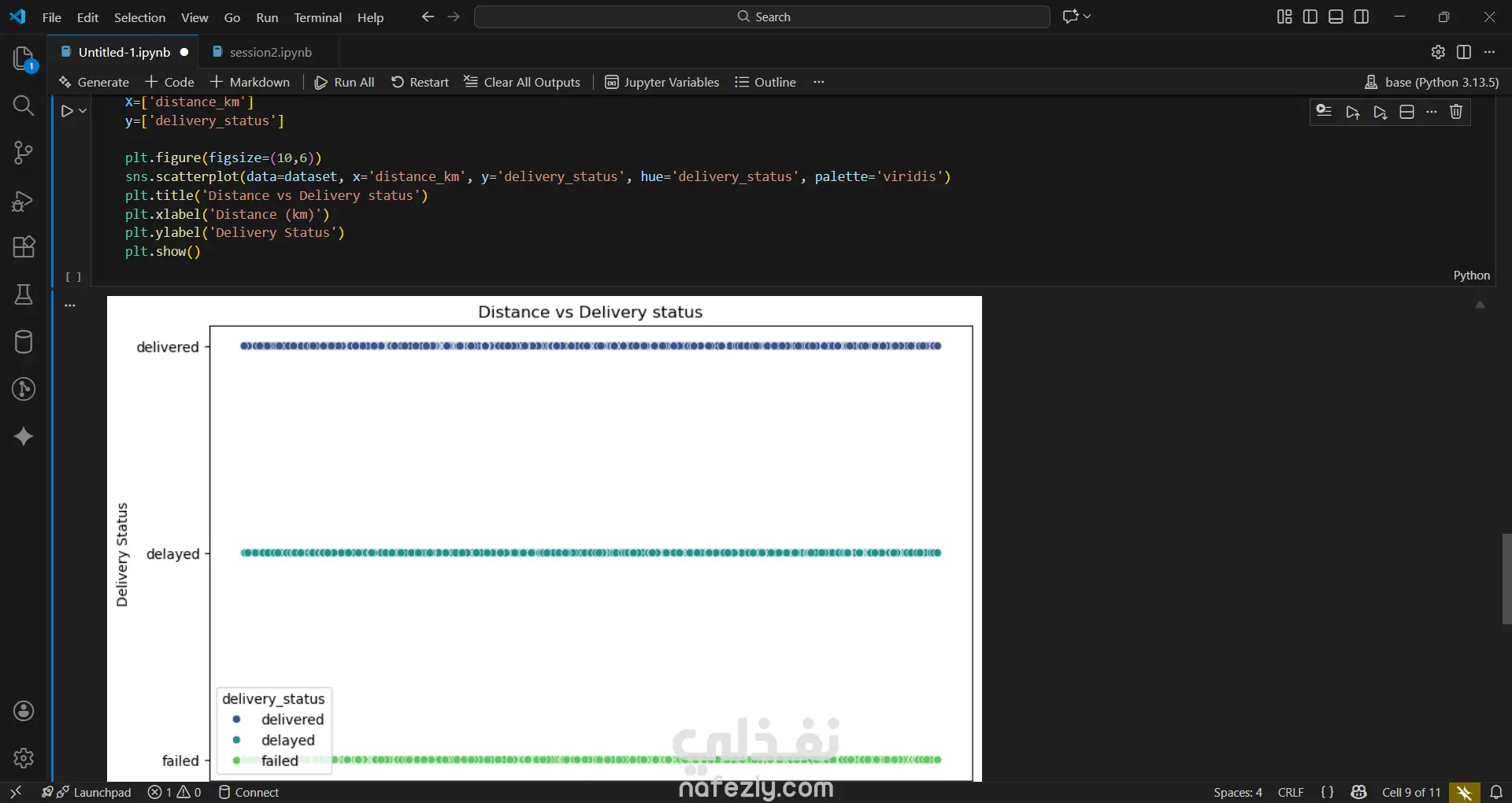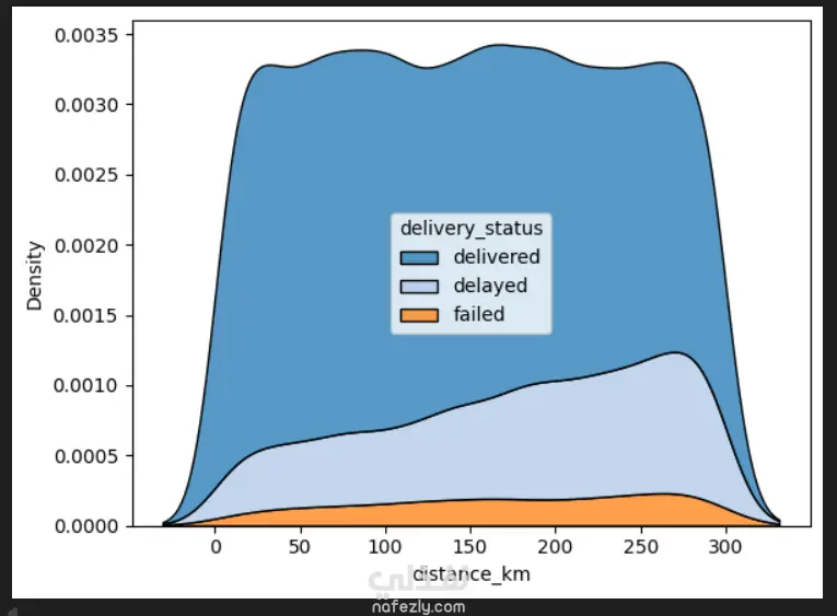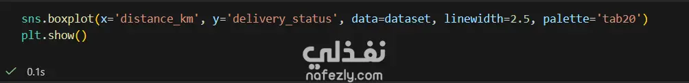 1. إعداد البيئة واستيراد البيانات المكتبات المستخدمة: تبدأ الصور باستيراد المكتبات الأساسية لتحليل البيانات وتصورها مثل pandas للمعالجة، وnumpy للعمليات الحسابية، وmatplotlib وseaborn للرسم البياني. تحميل الملف: يتم قراءة ملف بيانات من نوع CSV باسم Delivery_Logistics.csv يحتوي على 25,000 صف و15 عموداً. 2. استكشاف البيانات (Exploratory Data Analysis) نظرة عامة: تظهر البيانات معلومات حول رقم الشحنة، شريك التوصيل، نوع المركبة، المسافة بالكيلومتر، الوزن، وحالة التوصيل. الإحصاء الوصفي: تم استخدام أمر dataset.describe() لإظهار القيم الإحصائية (المتوسط، الانحراف المعياري، القيم الصغرى والعظمى) للأعمدة الرقمية مثل المسافة والوزن وتكلفة التوصيل. تنظيف البيانات: تم التحقق من وجود صفوف مكررة باستخدام duplicated()، والتأكد من عدم وجود قيم فارغة (Null values) في كافة الأعمدة لضمان جودة البيانات. 3. التصور البياني (Data Visualization) تم إنشاء رسوم بيانية من نوع Scatter Plot (مخطط تشتت) لدراسة العلاقة بين المسافة بالكيلومتر وحالة التوصيل (ناجح، متأخر، فاشل). يظهر من الرسم توزيع نقاط البيانات بشكل خطي أفقي يمثل الحالات الثلاث المختلفة عبر مختلف المسافات. 4. النمذجة والتنبؤ (Machine Learning) بناء النموذج: تم استخدام مكتبة sklearn لاستيراد نموذج الارتباط الخطي (Linear Regression). دالة النتائج: تم كتابة دالة برمجة باسم plot_results تهدف إلى رسم البيانات الحقيقية كنقاط حمراء، ومقارنتها بخط التوقع الخاص بالنموذج باللون الأزرق.