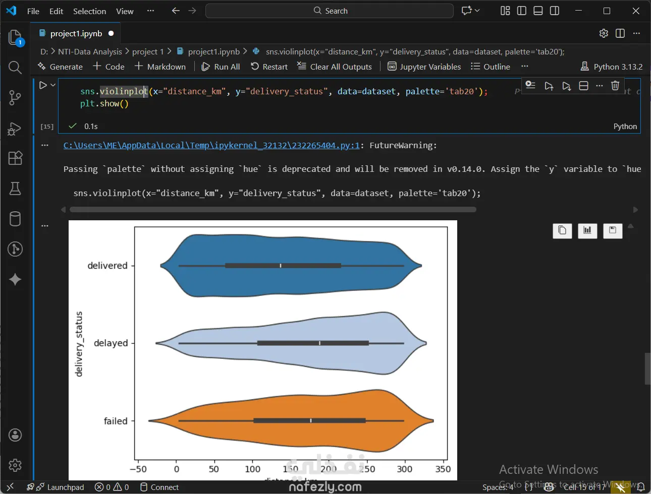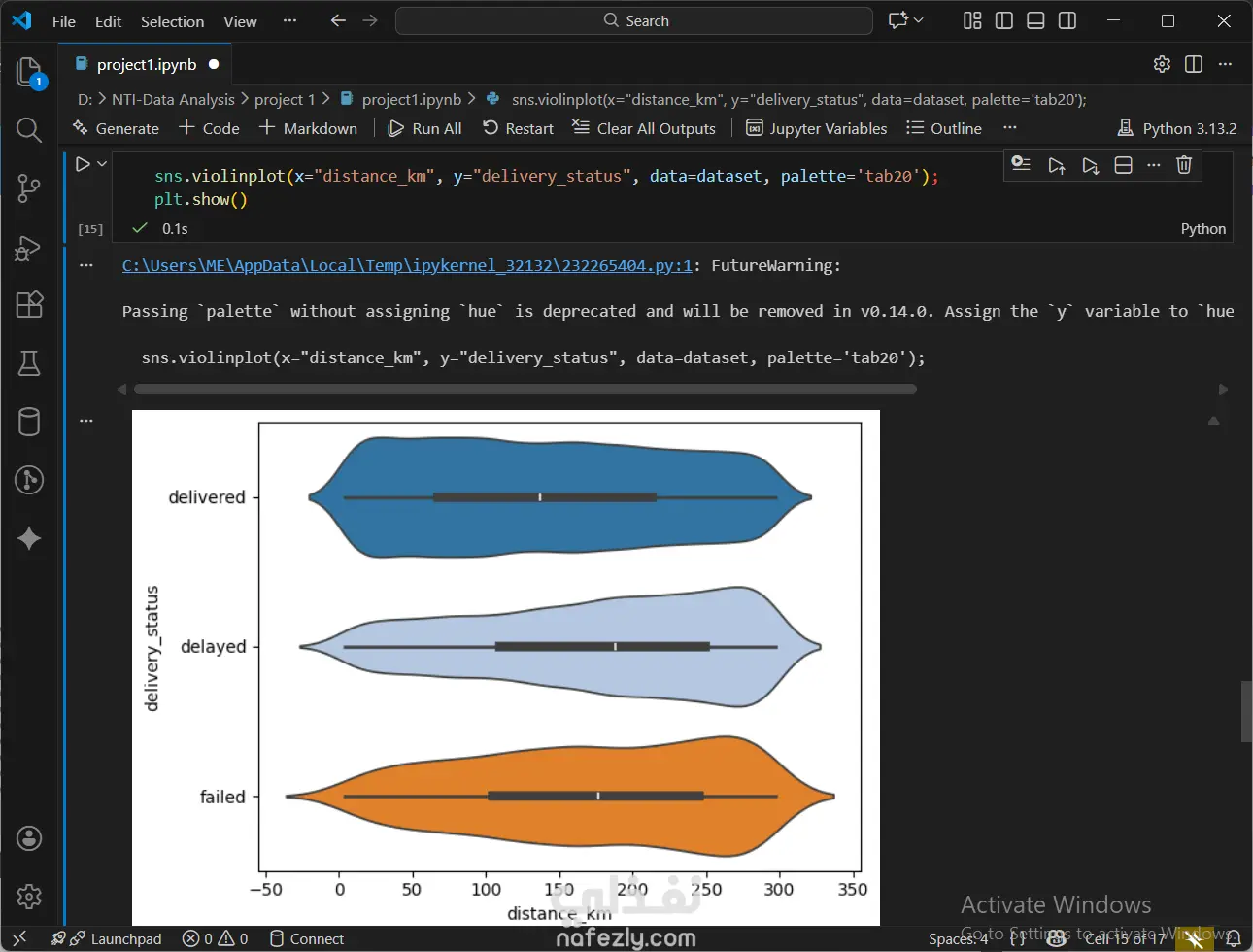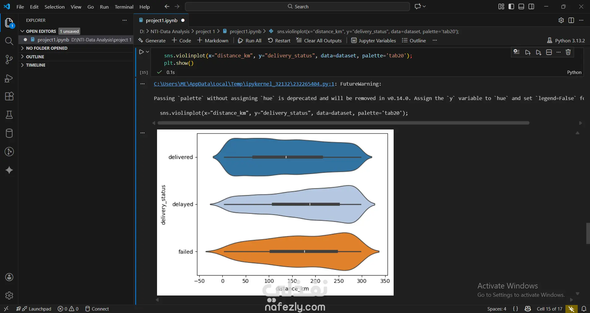 1. إعداد البيئة واستيراد البيانات المكتبات المستخدمة: تبدأ الصور باستيراد المكتبات الأساسية لتحليل البيانات وتصورها مثل pandas للمعالجة، وnumpy للعمليات الحسابية، وmatplotlib وseaborn للرسم البياني. تحميل الملف: يتم قراءة ملف بيانات من نوع CSV باسم Delivery_Logistics.csv يحتوي على 25,000 صف و15 عموداً. 2. استكشاف البيانات (Exploratory Data Analysis) نظرة عامة: تظهر البيانات معلومات حول رقم الشحنة، شريك التوصيل، نوع المركبة، المسافة بالكيلومتر، الوزن، وحالة التوصيل. الإحصاء الوصفي: تم استخدام أمر dataset.describe() لإظهار القيم الإحصائية (المتوسط، الانحراف المعياري، القيم الصغرى والعظمى) للأعمدة الرقمية مثل المسافة والوزن وتكلفة التوصيل. تنظيف البيانات: تم التحقق من وجود صفوف مكررة باستخدام duplicated()، والتأكد من عدم وجود قيم فارغة (Null values) في كافة الأعمدة لضمان جودة البيانات. 3. التصور البياني (Data Visualization) تم إنشاء رسوم بيانية من نوع Scatter Plot (مخطط تشتت) لدراسة العلاقة بين المسافة بالكيلومتر وحالة التوصيل (ناجح، متأخر، فاشل). يظهر من الرسم توزيع نقاط البيانات بشكل خطي أفقي يمثل الحالات الثلاث المختلفة عبر مختلف المسافات. 4. النمذجة والتنبؤ (Machine Learning) بناء النموذج: تم استخدام مكتبة sklearn لاستيراد نموذج الارتباط الخطي (Linear Regression). دالة النتائج: تم كتابة دالة برمجة باسم plot_results تهدف إلى رسم البيانات الحقيقية كنقاط حمراء، ومقارنتها بخط التوقع الخاص بالنموذج باللون الأزرق.