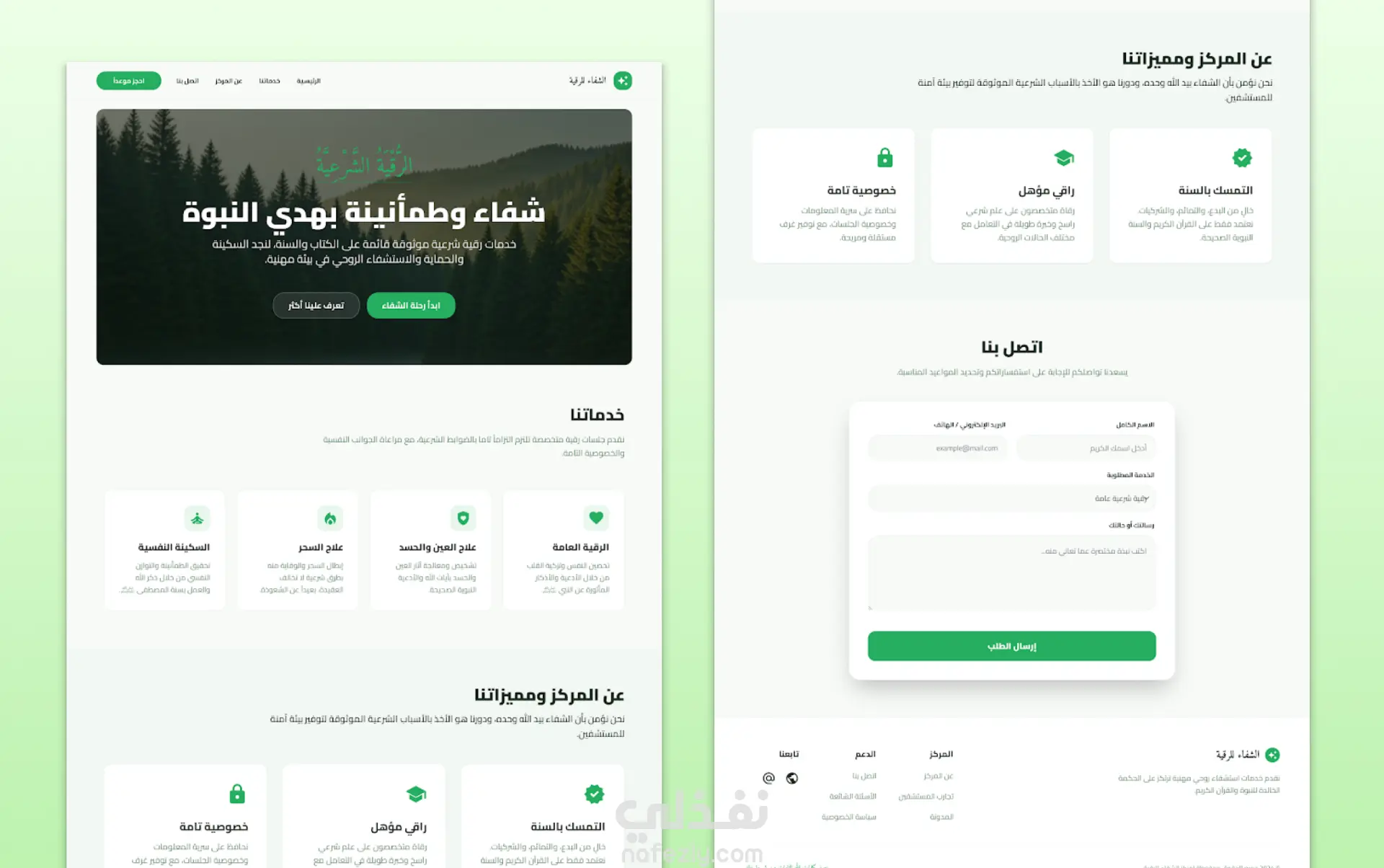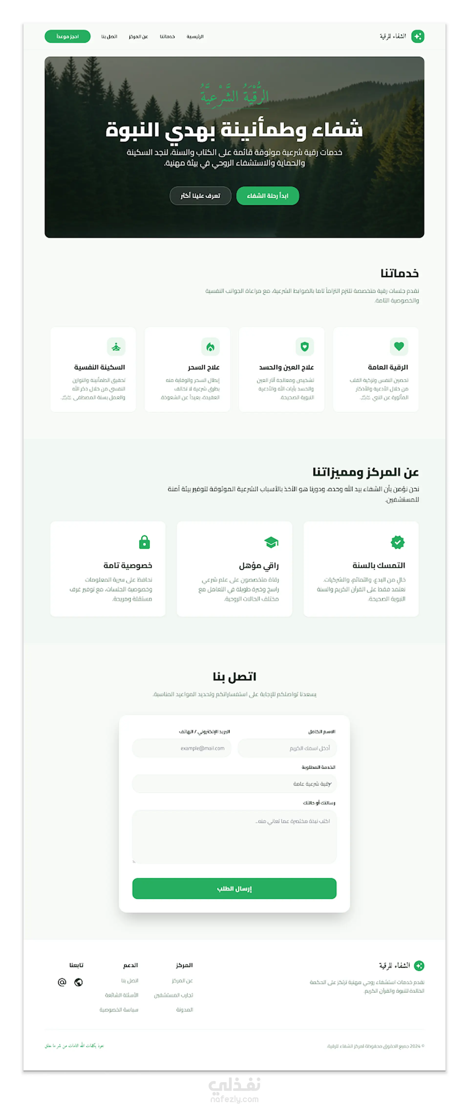 في هذا المشروع قمت بتصميم واجهة موقع إلكتروني عربية للرقيه الشرعيه يركّز على تقديم خدمات بأسلوب بسيط وواضح للمستخدم. الهدف كان إنشاء تجربة استخدام مريحة وموثوقة تعكس الطابع الإنساني والهادئ، وتسهّل على الزائر الوصول للمعلومات والتواصل بسرعة.