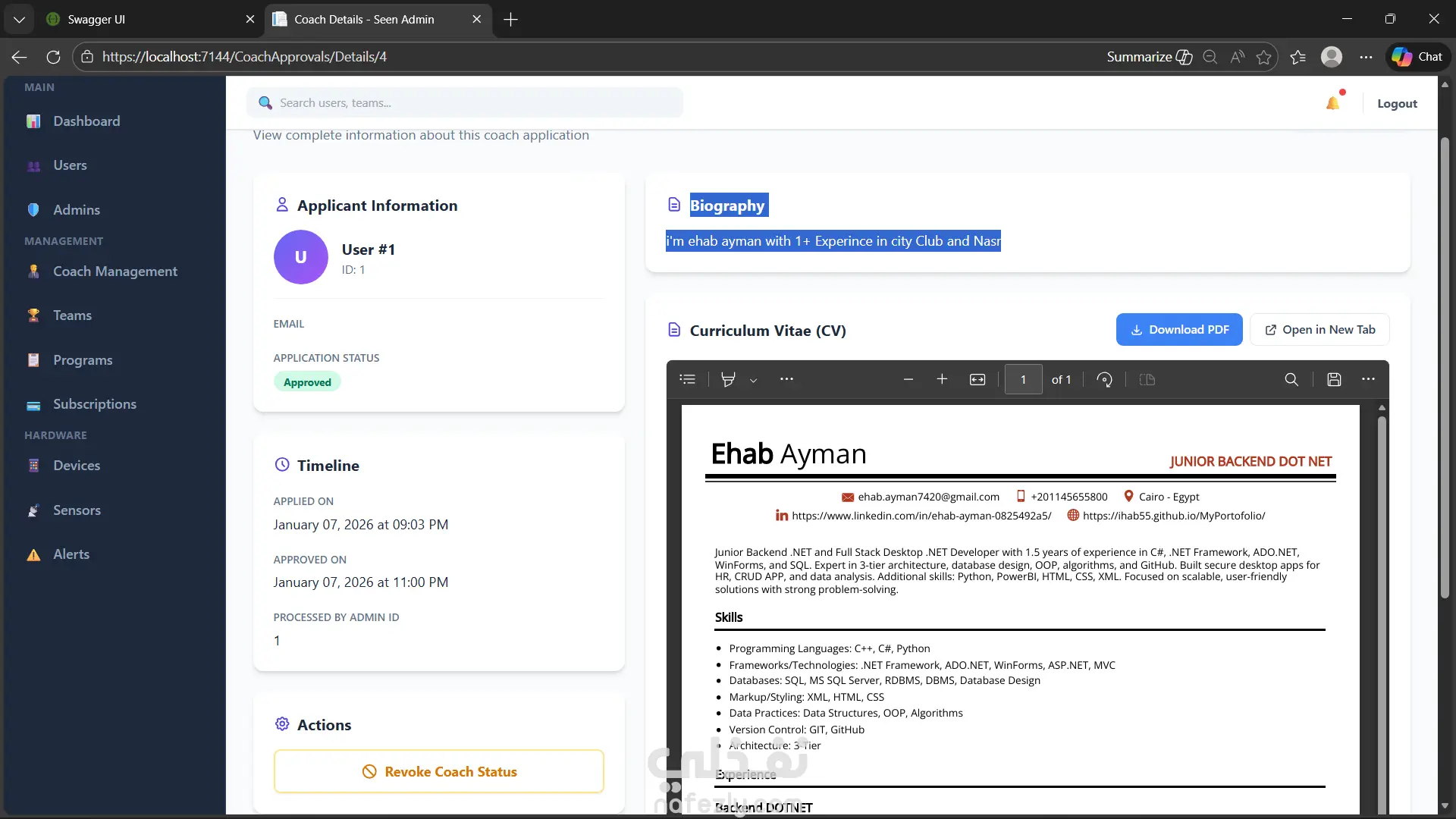 SEEN is a full-stack sports team management system designed to help coaches and players efficiently manage teams, subscriptions, training sessions, and notifications through a scalable and secure platform. The system includes: Mobile Application (Flutter) for Players & Coaches Admin Web Dashboard for system management RESTful API Backend (ASP.NET Core) SQL Server Database The platform was designed using a clean layered architecture to ensure scalability, performance optimization, and maintainability. ?? My Role & Responsibilities Designed the overall System Architecture (Three-Tier Architecture) Developed the Backend using ASP.NET Core Web API Designed and implemented the Database Schema (ERD & Relational Model) Built secure JWT Authentication & Role-Based Authorization Implemented business logic using BLL & DAL separation Developed and optimized Stored Procedures Integrated backend APIs with Flutter Mobile App Built and structured the Admin Web Dashboard Ensured clean code principles and scalable structure ✔ Team & Player Management ✔ Subscription Plans & Expiry Handling ✔ Training Program Management ✔ Role-Based Access (Coach / Player / Admin) ✔ Notification System ✔ Admin Dashboard for full control ✔ Mobile App integrated with secure API