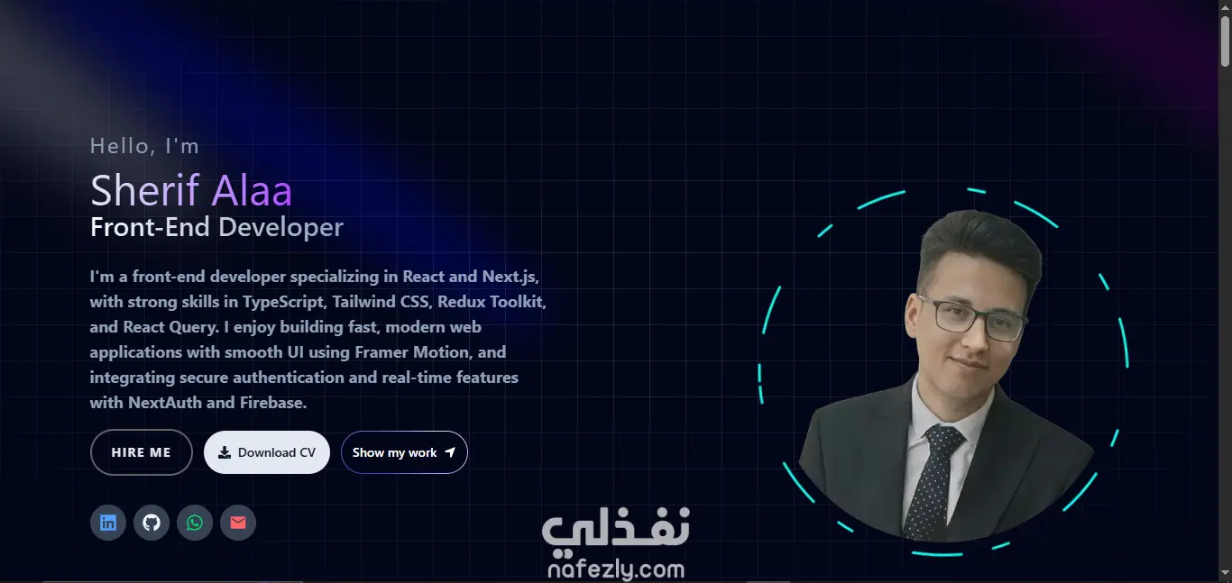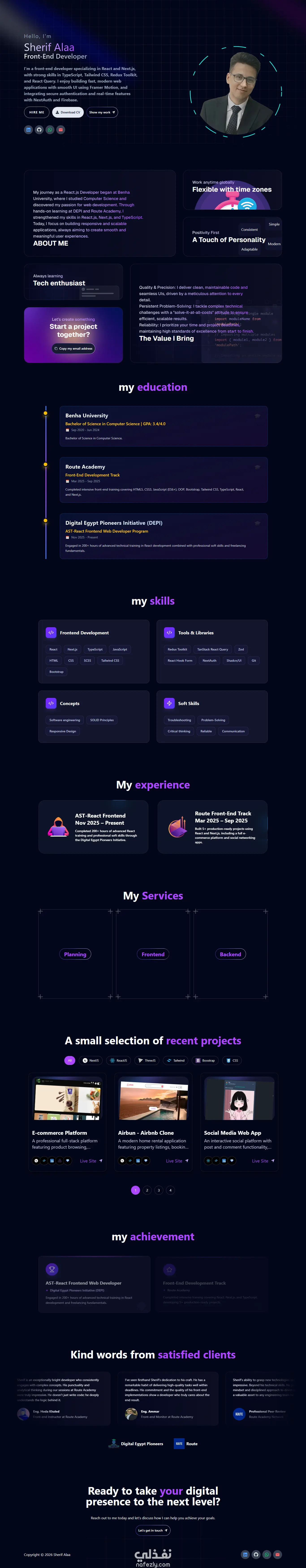 مشروع موقع شخصي (Portfolio) متكامل تم بناؤه ليكون واجهة تعريفية للمهارات والخدمات التقنية. يتميز الموقع بتصميم "Dark Mode" أنيق وواجهة مستخدم (UI) تفاعلية تعتمد على الرسوم المتحركة السلسة. أهم المميزات: 1- عرض المشاريع (Portfolio Section): عرض بطاقات المشاريع السابقة مع روابط المعاينة البرمجية. 2- الرسوم المتحركة التفاعلية: استخدام Framer Motion لإضافة لمسات حركية تجذب انتباه الزوار أثناء التنقل. 3- تصميم متجاوب (Responsive): الموقع متوافق تماماً مع جميع أحجام الشاشات (الهواتف، الأجهزة اللوحية، والحواسيب). 4- نموذج تواصل (Contact Form): مدمج للتحقق من البيانات وضمان سهولة وصول العملاء. طريقة التنفيذ: تم التطوير باستخدام أحدث التقنيات لضمان السرعة وتحسين محركات البحث (SEO): 1- Next.js: لضمان سرعة تحميل الصفحات والأداء العالي. 2- Tailwind CSS: لتنسيق الواجهات بدقة واحترافية. 3- Framer Motion: لإضافة التأثيرات الحركية (Animations). 4- TypeScript: لكتابة كود برمجي متين ومنظم.
