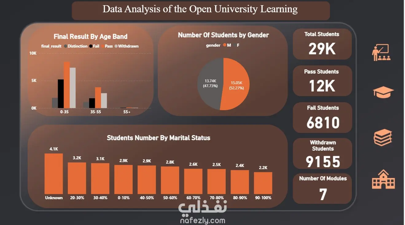 قمت بتصميم Dashboard تحليلية متكاملة لدراسة أداء طلاب الجامعة المفتوحة باستخدام Power BI، بهدف تحليل نتائج الطلاب واكتشاف العوامل المؤثرة في النجاح والرسوب.