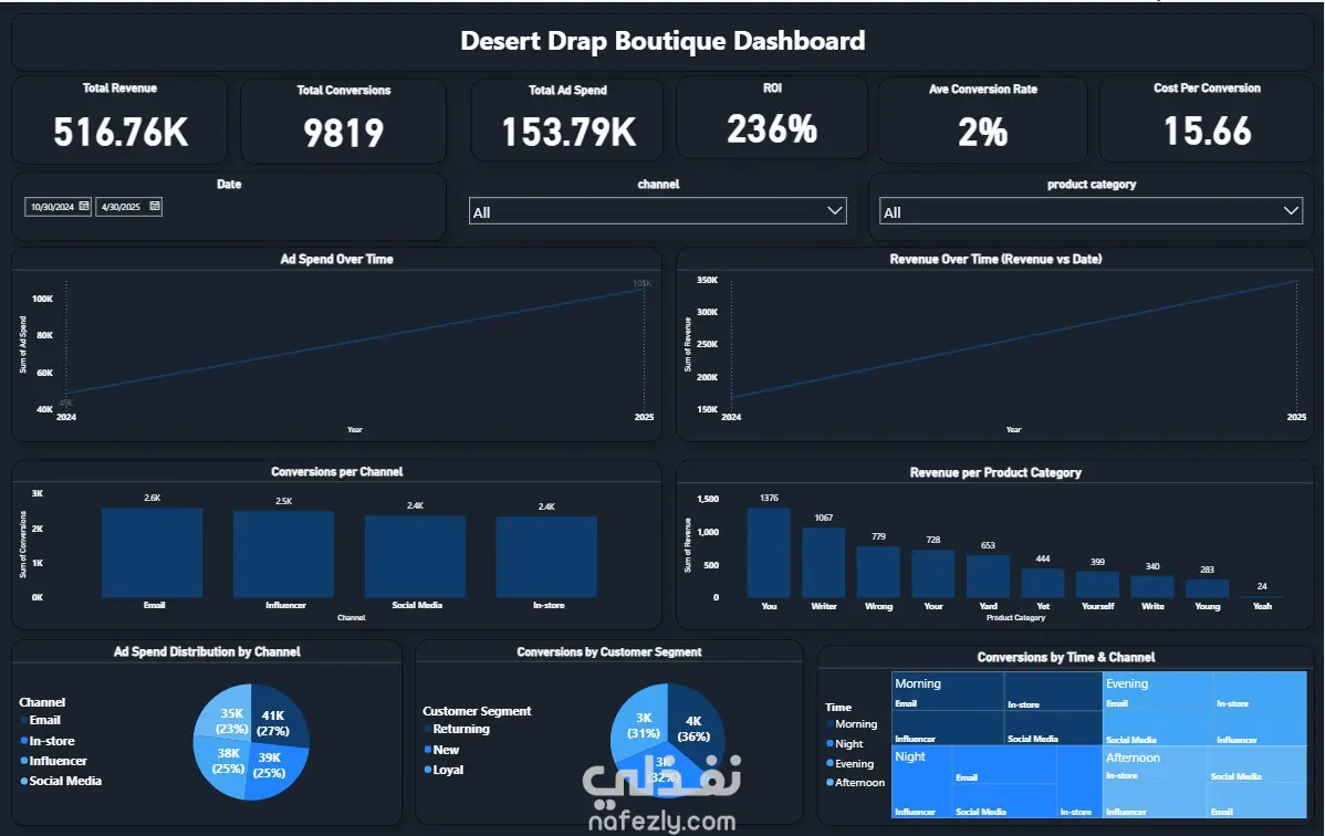 قمت بتصميم Dashboard تحليلية متكاملة لقياس أداء الحملات التسويقية والمبيعات لمتجر إلكتروني، بهدف تحليل العائد على الاستثمار وتحسين كفاءة القنوات التسويقية.