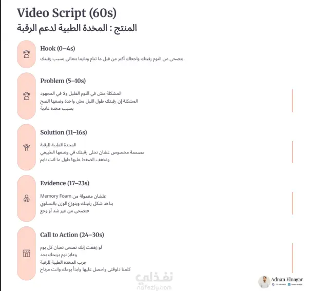 Video Script (60s) المنتج : المخدة الطبيه لدعم الرقبة