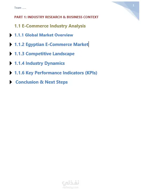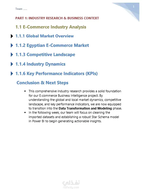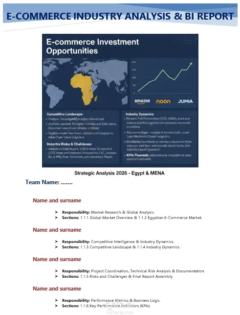 نوع العمل: تقرير تحليل استراتيجي (Strategic Industry Research) متخصص في قطاع التجارة الإلكترونية بمنطقة الشرق الأوسط وشمال أفريقيا، مع التركيز على السوق المصري. مميزات العمل: تحليل السوق (2020-2025): رصد حجم النمو العالمي والمحلي بالاعتماد على بيانات eMarketer وStatista. التحليل التنافسي العميق: دراسة هيكلية للاعبين الكبار (Amazon, Noon, Jumia) وتحليل منصات B2B مثل MaxAB. تطبيق أطر العمل الاستراتيجية: استخدام Porter’s Five Forces لتحليل حدة المنافسة، وValue Chain Analysis لفهم تدفق القيمة. إدارة المخاطر والحلول: تحليل مخاطر الدفع عند الاستلام (COD) والأمن السيبراني وتقديم رؤى تقنية لمواجهتها. بناء منطق الأعمال (Business Logic): إعداد قائمة شاملة بـ 22 مؤشر أداء (KPIs) تشمل الجوانب المالية، التشغيلية، التسويقية، ورضا العملاء، مع صياغة المعادلات الرياضية الدقيقة لكل منها. طريقة التنفيذ: تم تنفيذ العمل بأسلوب البحث المكتبي المتقدم (Secondary Research)، مع هيكلة البيانات لتكون جاهزة لعملية التحول الرقمي (Digital Transformation). تم تصميم البحث ليكون المرحلة التحضيرية لبناء نموذج بيانات (Star Schema) على Power BI لاستخراج رؤى استثمارية (Actionable Insights).