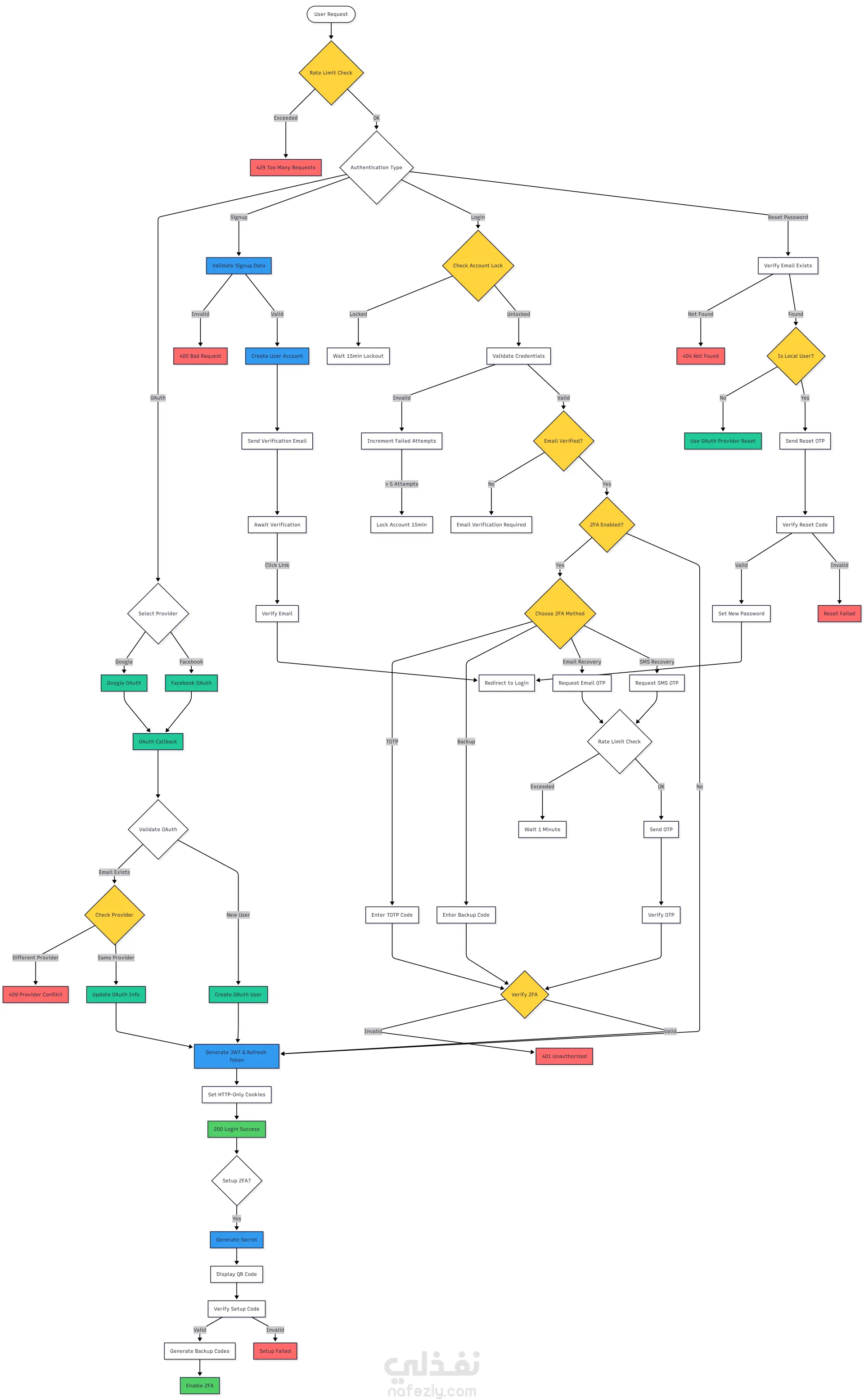 نظام Authentication & Authorization متقدم مبني باستخدام Node.js وExpress وMongoDB، يوفّر حلول أمان قوية تشمل JWT، Refresh Tokens، Two-Factor Authentication (2FA)، وتسجيل الدخول باستخدام حسابات Google وFacebook. تم تصميم المشروع ليكون Reusable Auth Service يمكن دمجه بسهولة مع أي تطبيق (Web أو Mobile)، مع تركيز قوي على الأمان، الحماية من الهجمات، وتجربة مستخدم سلسة. ? Core Authentication تسجيل وتسجيل دخول باستخدام Email / Password تأكيد البريد الإلكتروني استعادة كلمة المرور بشكل آمن التحقق من قوة كلمة المرور JWT + Refresh Token Rotation Secure HTTP-only Cookies ?️ Two-Factor Authentication (2FA) TOTP-based 2FA (متوافق مع Google Authenticator / Authy) إعداد 2FA عبر QR Code Backup Codes استرجاع 2FA عبر: Email SMS (Twilio) Rate limiting لمحاولات الاسترجاع ? Social Login (OAuth) Google OAuth 2.0 Facebook OAuth Automatic account linking حل تعارض الحسابات (Provider Conflict Resolution) ? Security & Protection Account lockout بعد 5 محاولات فاشلة Rate limiting على مستوى API والمستخدم حماية من: XSS NoSQL Injection Brute-force attacks Helmet security headers ⚙️ Tech Stack Node.js / Express MongoDB + Mongoose Passport.js JWT + Refresh Tokens Redis Nodemailer (Emails) Twilio (SMS) speakeasy + qrcode (2FA) RESTful API Architecture Backend-only authentication service designed to be reused across multiple applications.