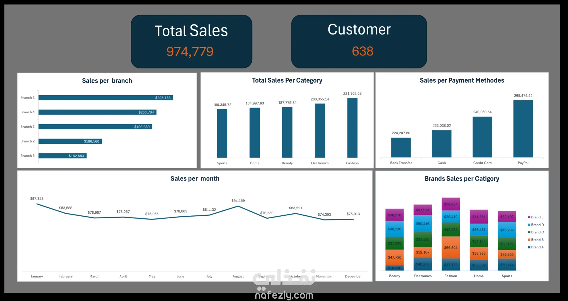 هذا المشروع هو لوحة تحكم شاملة لمبيعات التجزئة تم إنشاؤها باستخدام إكسل، مصممة لتوفير رؤية شاملة لأداء المتاجر. يدمج المشروع مصادر بيانات متعددة لتحليل المبيعات عبر مختلف العلامات التجارية والفئات والفروع، مما يتيح اتخاذ قرارات مستندة إلى البيانات لإدارة المخزون والتسويق. هيكلية البيانات والتكامل تكمن قوة هذا المشروع في قدراته على نمذجة البيانات. باستخدام Power Query، قمت بربط وتحويل 8 مجموعات بيانات منفصلة إلى نموذج واحد: بيانات المبيعات: سجلات المعاملات السنوية (2023 و 2024). البيانات الرئيسية: جداول شاملة للعلامات التجارية والمنتجات والفئات. البيانات التشغيلية: معلومات عن الفروع والعملاء وطرق الدفع.