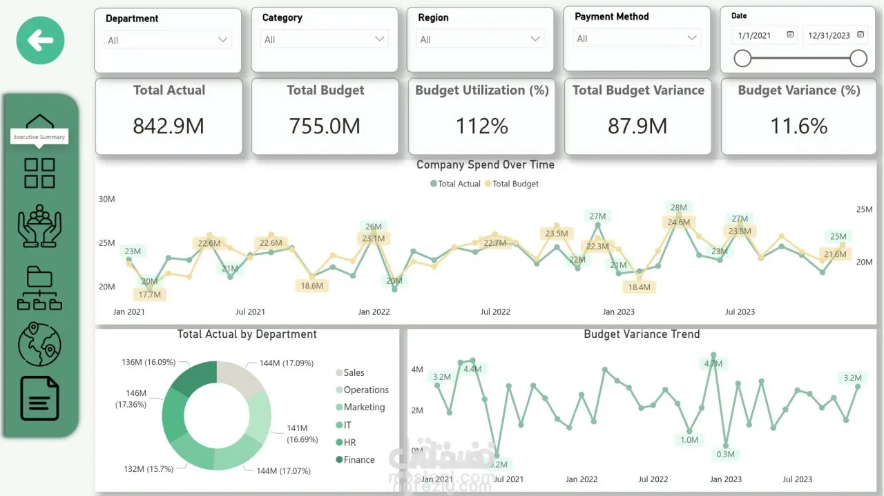 في هذا المشروع، قمت بتصميم وتطوير لوحة تحكم تفاعلية متكاملة باستخدام Microsoft Power BI بهدف تحليل الأداء المالي لمؤسسة كبرى على مدار ثلاث سنوات (2021-2023). كان الهدف الرئيسي هو تحويل أكثر من 9,500 معاملة مالية معقدة عبر 6 أقسام، 6 فئات مصروفات، و5 مناطق جغرافية إلى رؤى استراتيجية واضحة وقابلة للتنفيذ. يهدف المشروع إلى معالجة مشكلة "عشوائية الإنفاق" وتمكين الإدارة العليا من اتخاذ قرارات مبنية على البيانات لتقليل الهدر المالي وتحسين الكفاءة التشغيلية.