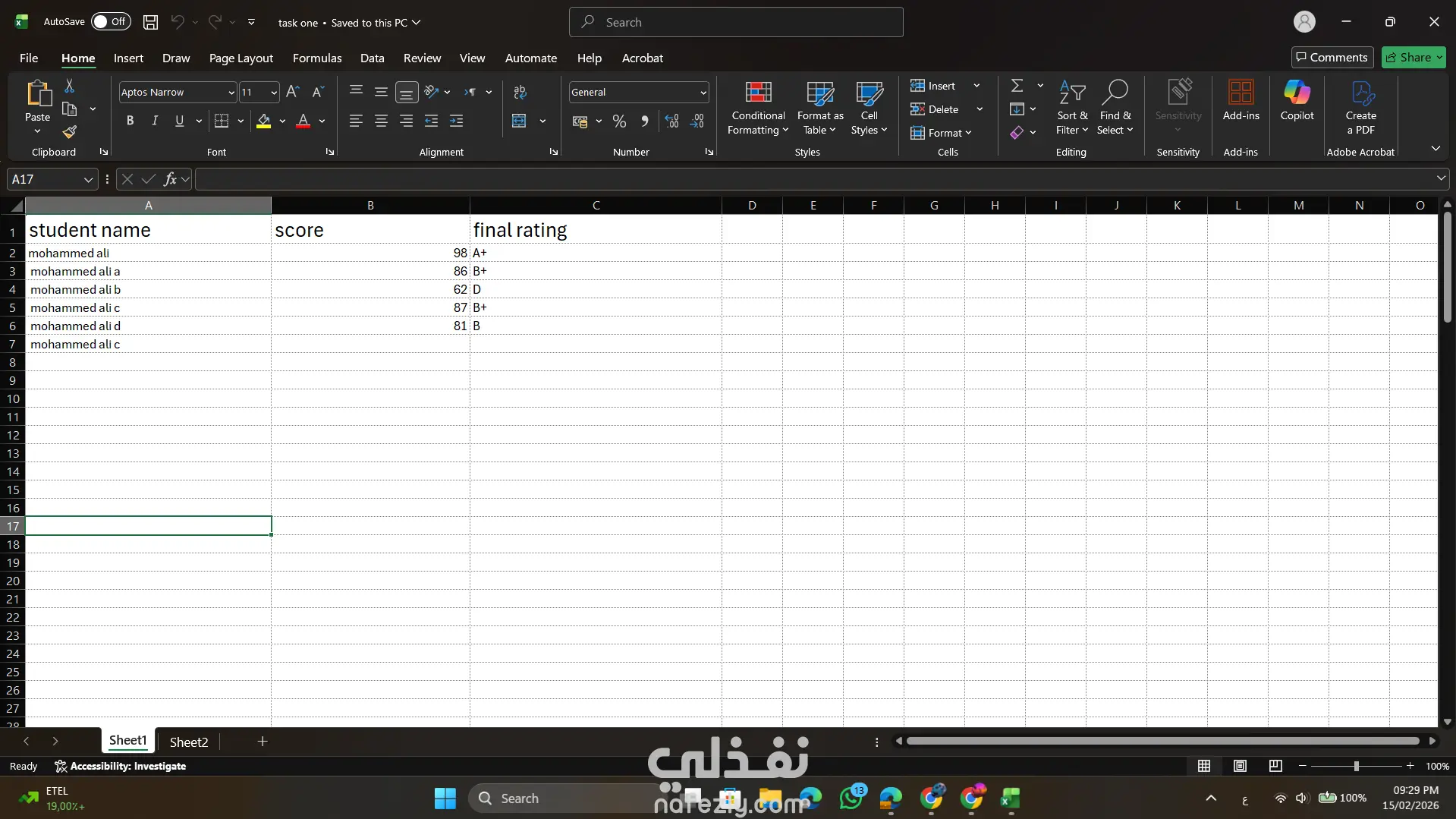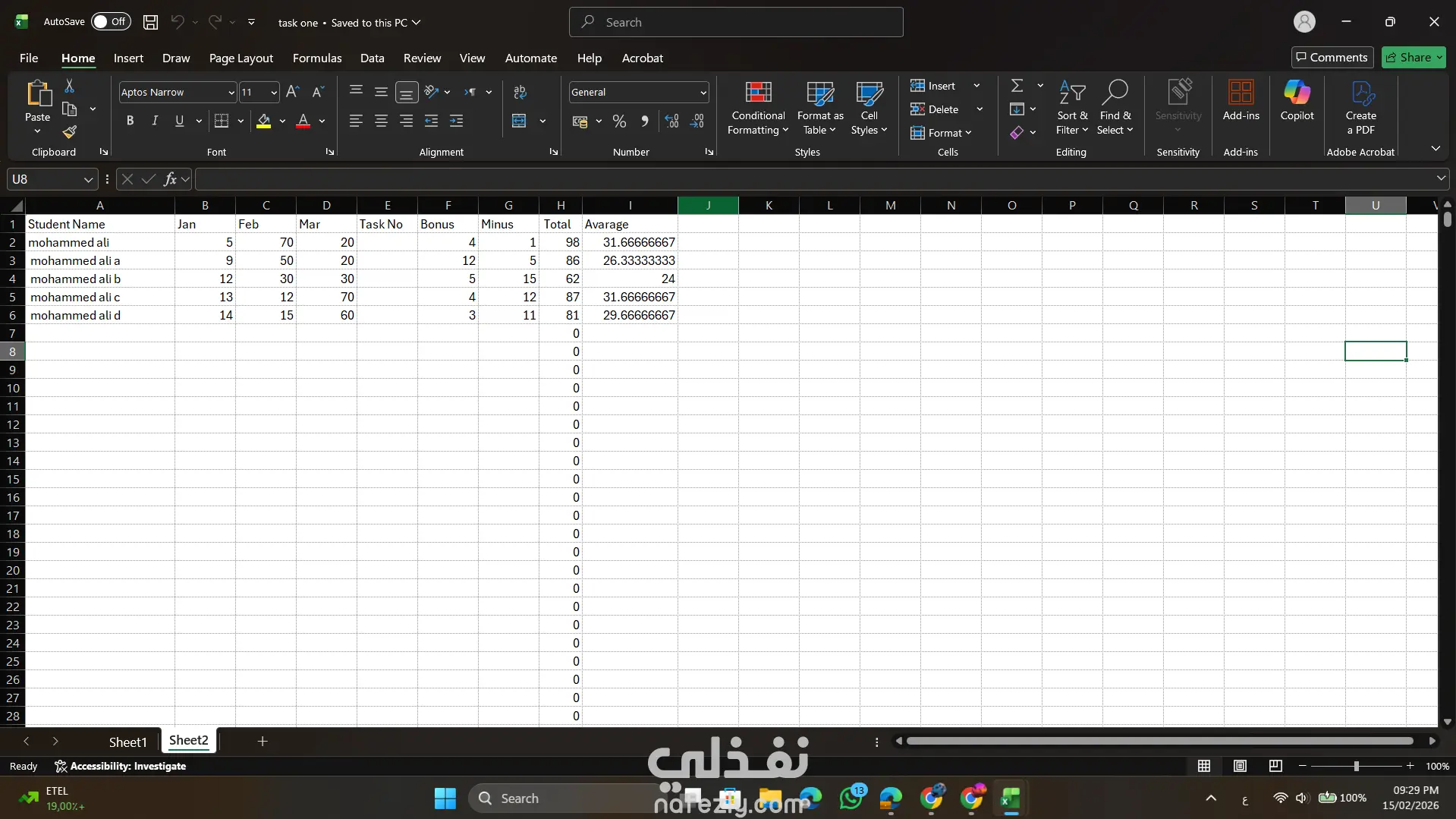 كشف درجات الطلاب لشهري يناير وفبراير ومارس + درجة المهمة (Task) + نقاط البونص والخصم. تم حساب المجموع الكلي والمعدل، ثم تحويل النتيجة إلى التقدير النهائي (A+ إلى D) حسب المعايير المعتمدة. البيانات خاصة بمجموعة الطلاب: محمد علي وفروعه (a, b, c, d).