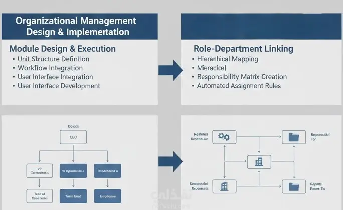 قمتُ بتصميم وتنفيذ هيكل تنظيمي متكامل باستخدام وحدة Organizational Management بما يتوافق مع استراتيجية وأهداف المؤسسة، مع بناء هيكل إداري واضح يحدد الصلاحيات، خطوط التقارير، ومسارات العمل.