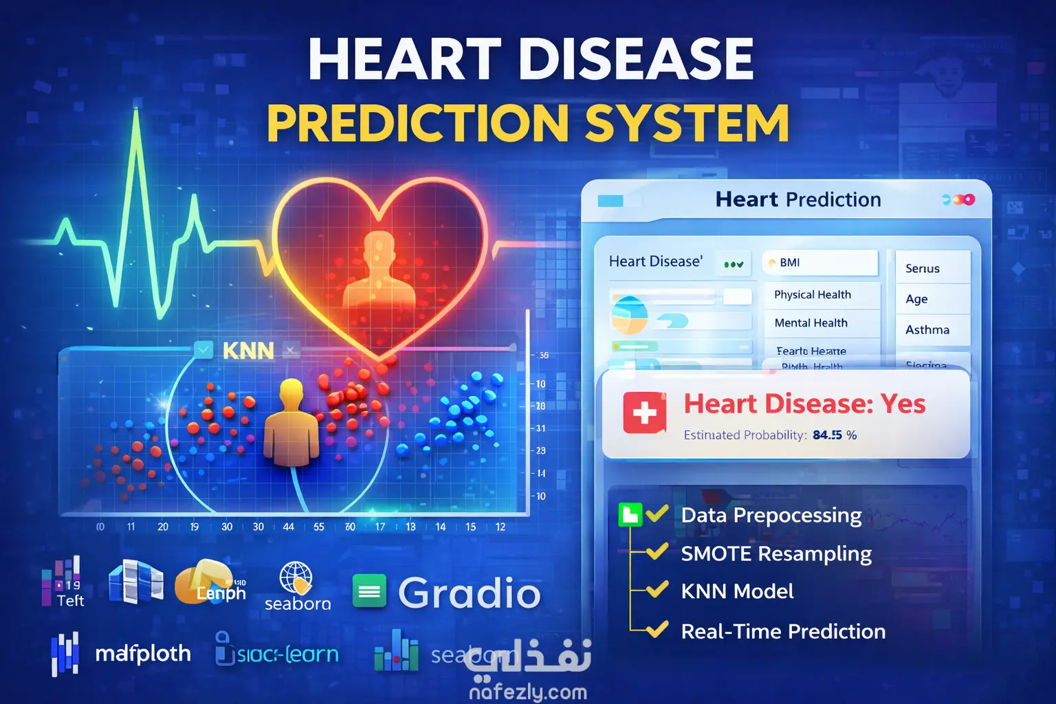 بنيت نظام لتوقع أمراض القلب باستخدام خوارزمية KNN، مع تطبيق معالجة البيانات المسبقة، وSMOTE لموازنة الفئات، وتقييس الميزات (Feature Scaling)، وتقييم أداء النموذج. كما تم نشر تطبيق ويب تفاعلي باستخدام Gradio للتنبؤ في الوقت الفعلي مع إمكانية تقدير الاحتمالات.