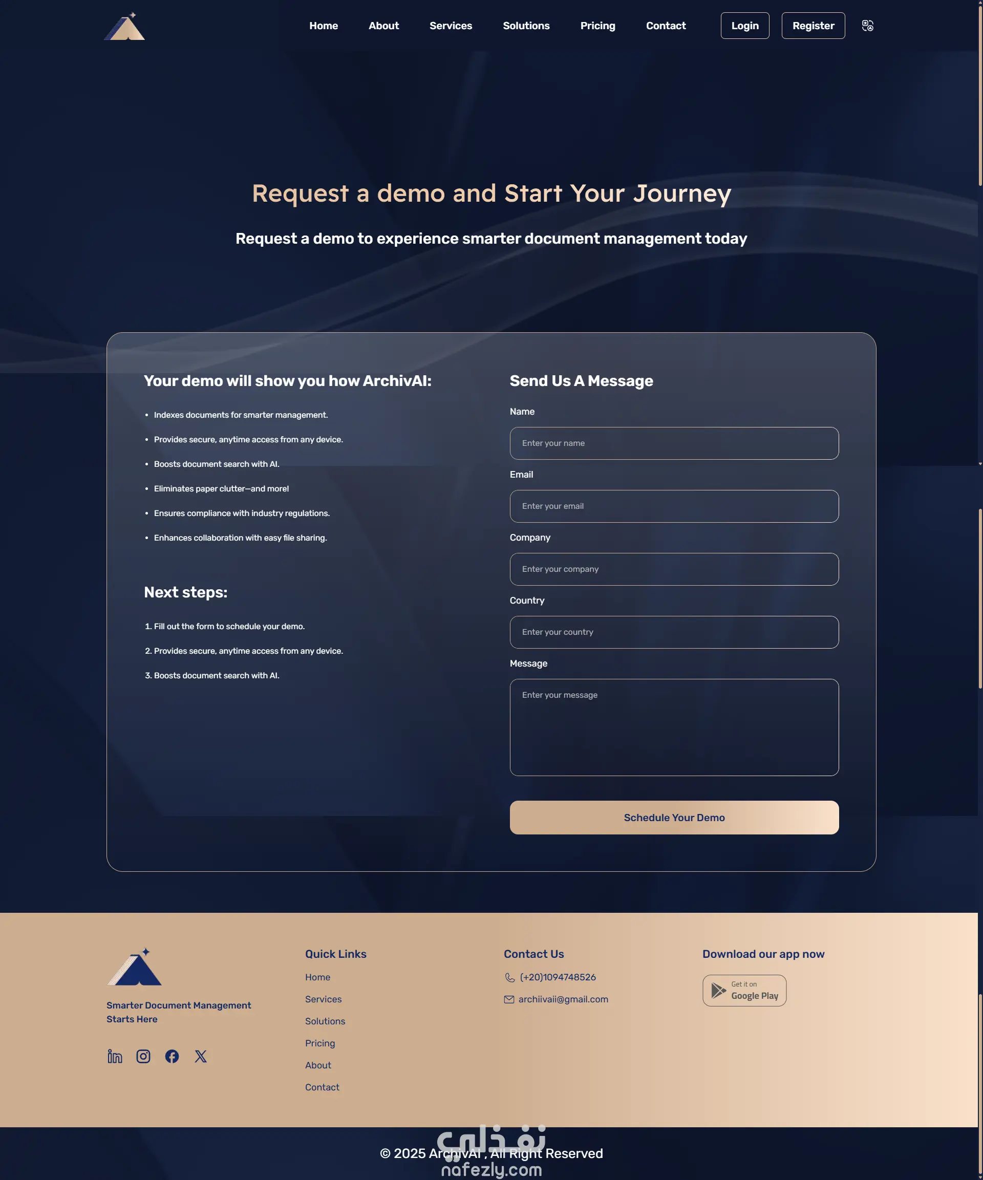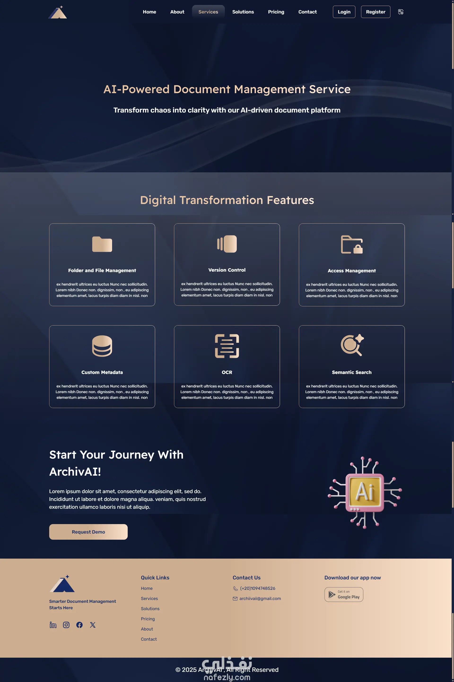 طوّرت ArchivAI، وهو نظام إدارة مستندات بواجهة أمامية تعتمد على React وNext.js وTypeScript. يتميز بتحديثات فورية باستخدام SignalR، ومعاينات للملفات، وواجهة مستخدم مبنية بـ Tailwind CSS، ورسوم متحركة بـ Motion Framer، ودعم التعدد اللغوي، وإشعارات الدفع، وتحسين جلب البيانات باستخدام React Query لتوفير تجربة مستخدم سلسة.