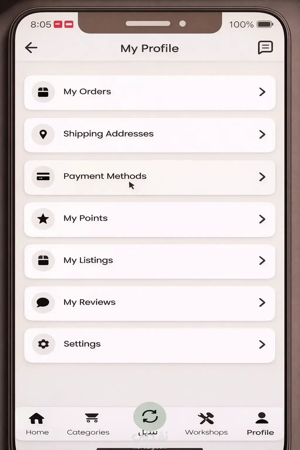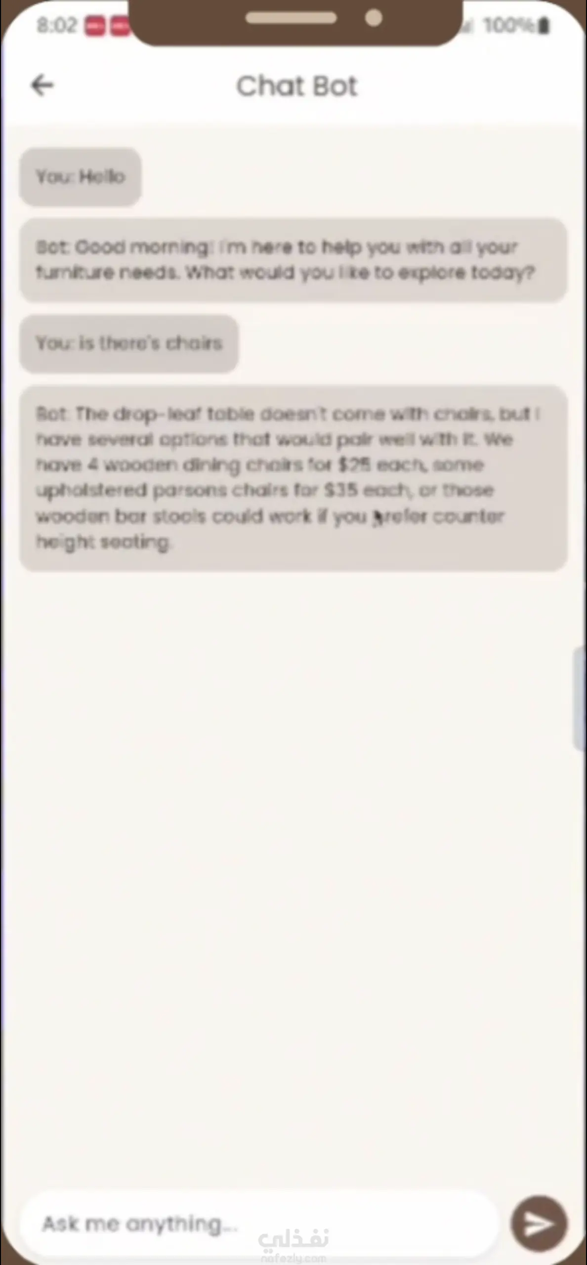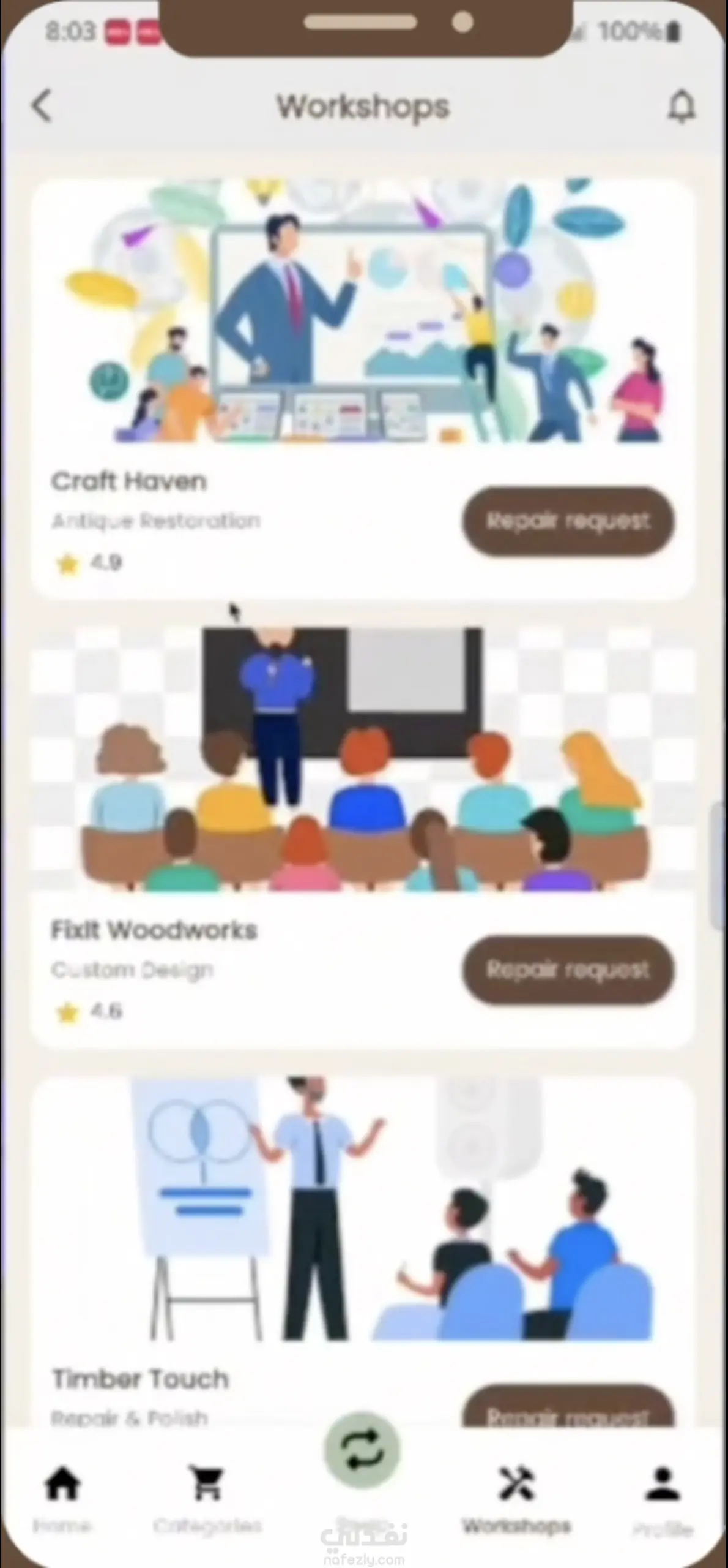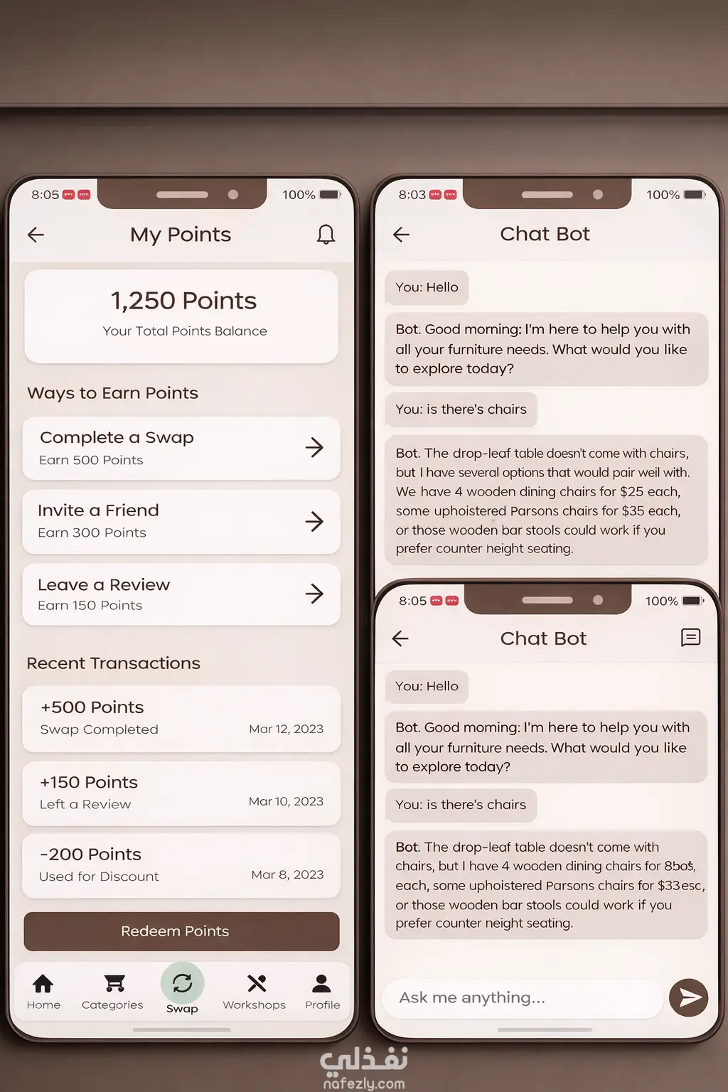 طبيق موبايل يركّز على الاستدامة ويتيح للمستخدمين بيع وتبادل وإصلاح الأثاث المستعمل، حيث يمكن للمستخدمين عرض قطع الأثاث وتصفحها، وإرسال طلبات تبادل، وكذلك إرسال طلبات إصلاح مباشرة إلى الورش من خلال نماذج مدمجة داخل التطبيق. تم بناء الـ Backend باستخدام NestJS و MySQL مع تطبيق أنظمة مصادقة آمنة باستخدام JWT و OAuth2. كما تم تنفيذ نظام محادثة فورية باستخدام Socket.IO لتمكين التواصل المباشر بين المستخدمين، بالإضافة إلى دمج Firebase Cloud Messaging (FCM) لدعم الإشعارات الفورية الخاصة بعروض التبادل وتحديثات الإصلاح ونشاط العناصر داخل التطبيق.