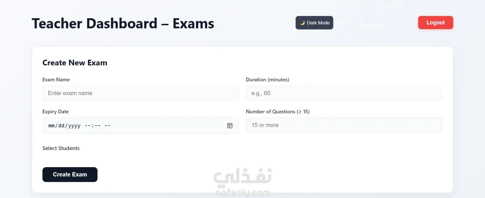 إنشاء موقع اختبارات يمكن استخدامه في المنصات التعليمية، مواقع التدريب، أو الشركات التي ترغب في تقييم المستخدمين أو المتدربين بطريقة سهلة وسريعة، مع توفير تجربة استخدام واضحة ونتائج فورية.