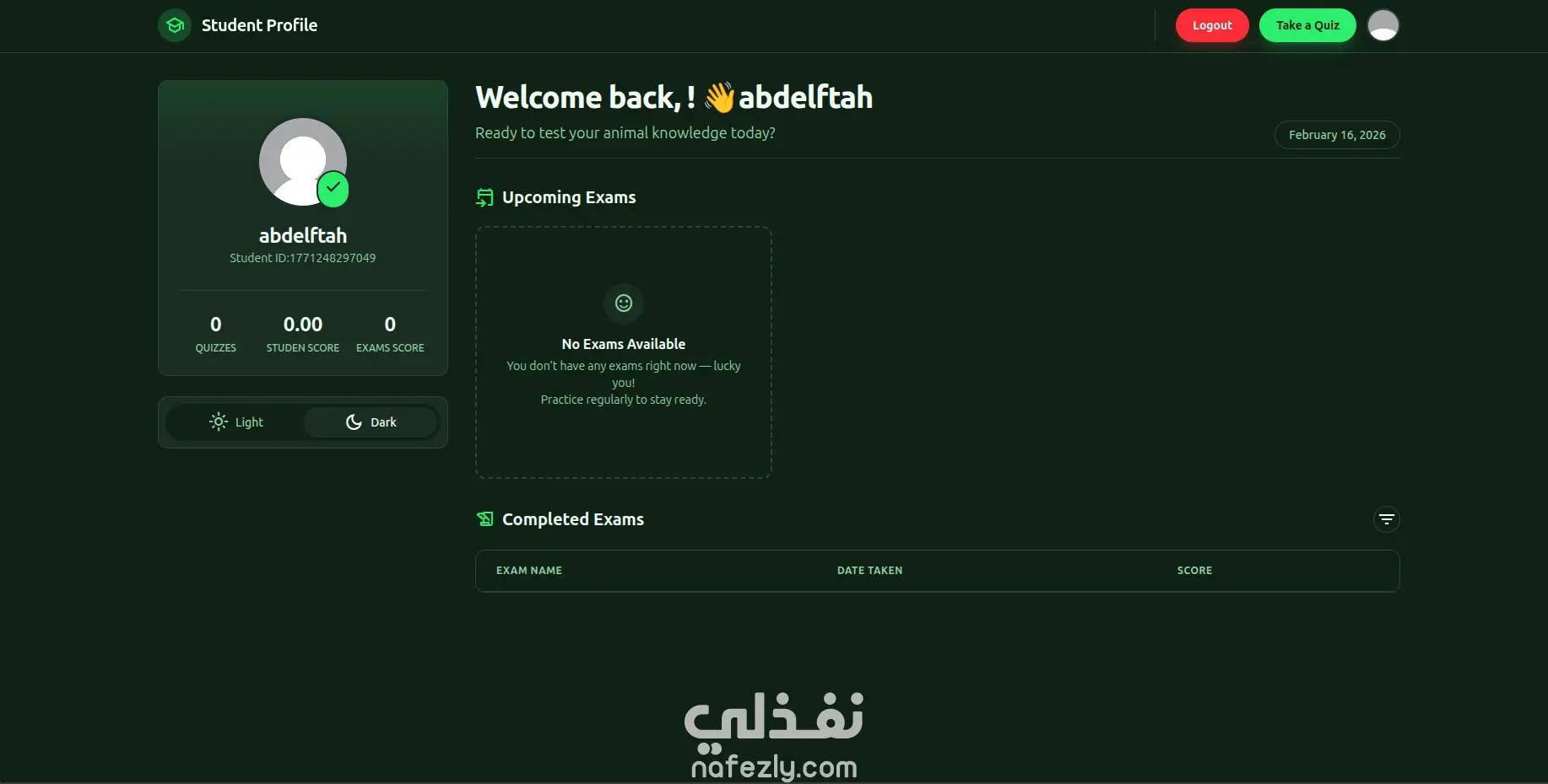 لوحة تحكم للطالب لحل الكويزات ومراجعة النتائج