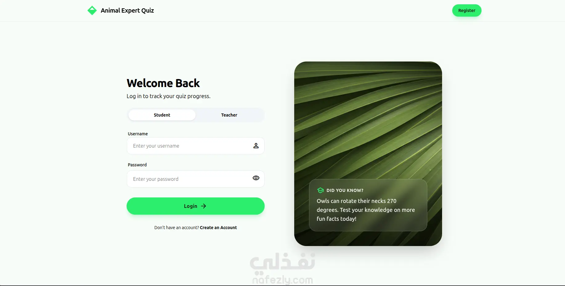 تطبيق ويب تفاعلي يتيح إنشاء وإجراء اختبارات تعليمية حول عالم الحيوانات من خلال واجهات منفصلة للطلاب والمعلمين. يوفر التطبيق نظام تسجيل حساب وتسجيل دخول يعمل على مستوى الواجهة الأمامية، بالإضافة إلى لوحات تحكم لإدارة الاختبارات، حل الكويزات، وعرض النتائج بشكل ديناميكي. يعتمد المشروع على LocalStorage والبيانات التجريبية لإدارة المحتوى بدون الحاجة إلى Back-End.