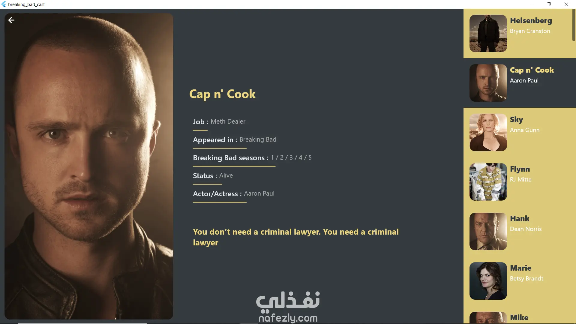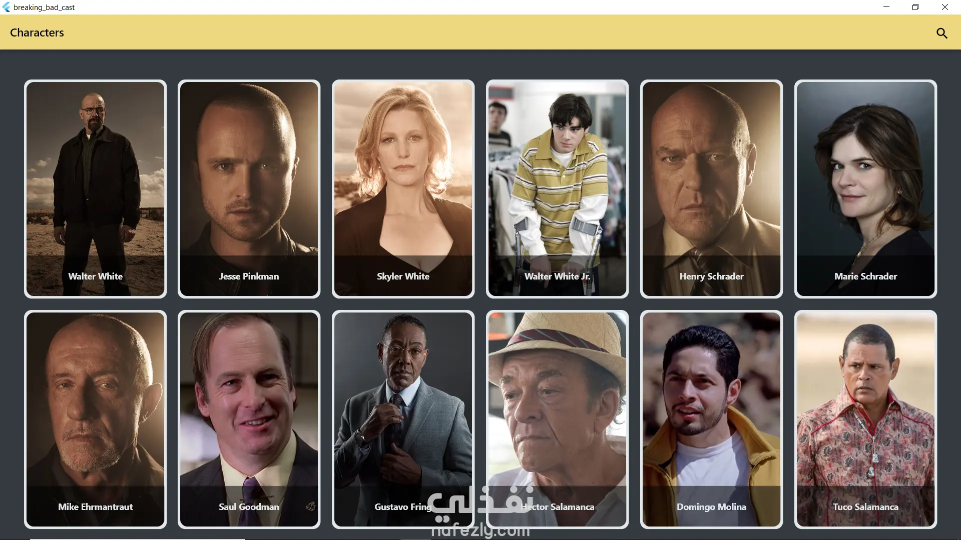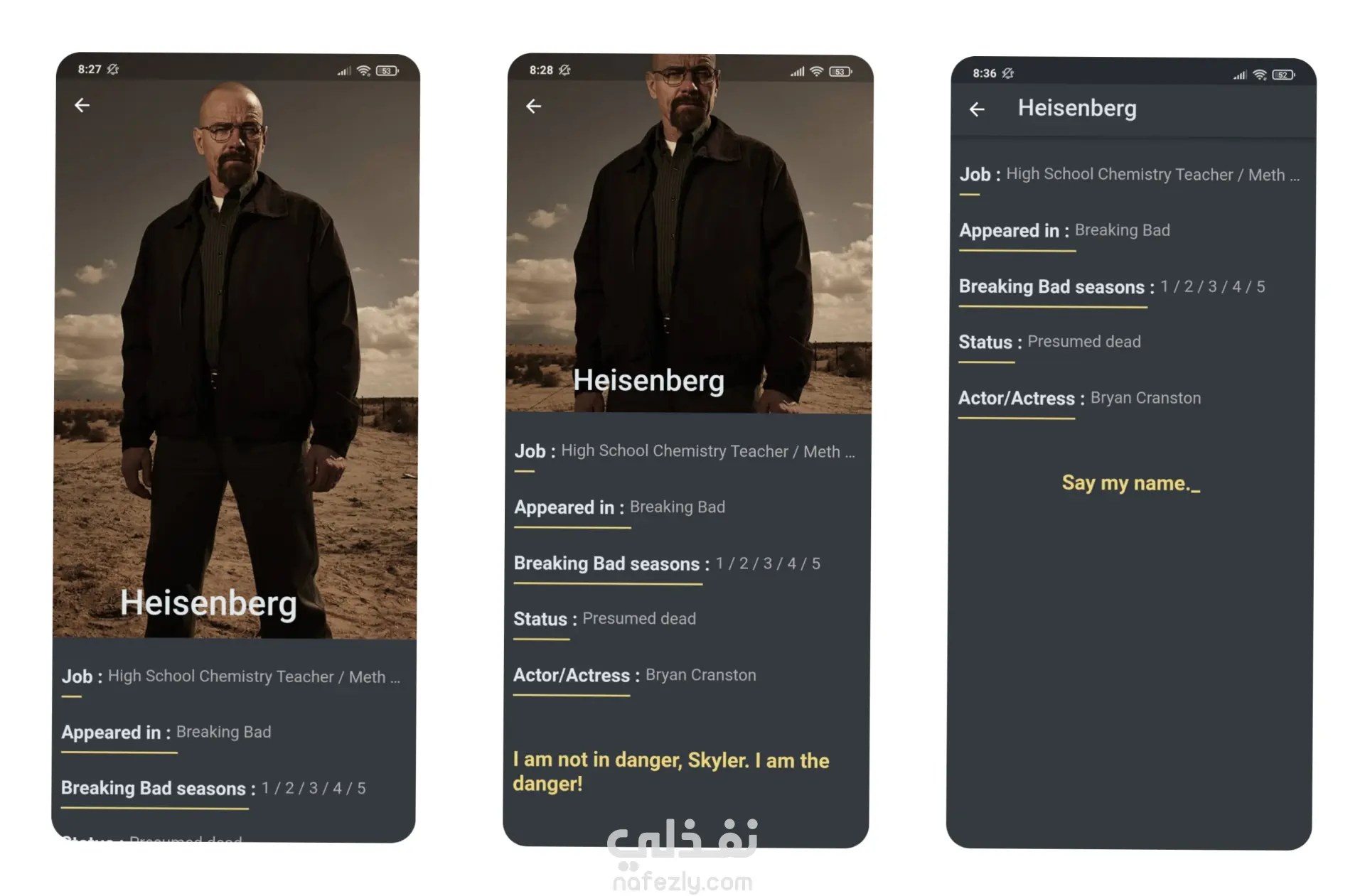 اللغات والأدوات المستخدمة: Dart، Flutter، Bloc، RESTful API تطبيق متجاوب (Responsive) ومتوافق مع مختلف أحجام الشاشات (Adaptive) لعرض تفاصيل طاقم عمل مسلسل Breaking Bad. يوفر التطبيق عرض معلومات الشخصيات بشكل منظم وجذاب، بالإضافة إلى عرض اقتباسات عشوائية للشخصيات مع تأثيرات نصية متحركة (Animated Text). كما يتضمن التطبيق: التحقق من حالة الاتصال بالإنترنت. جلب البيانات من خلال RESTful APIs. إدارة الحالة باستخدام Bloc لضمان أداء منظم واحترافي. التطبيق مصمم بواجهة مستخدم سلسة وتجربة استخدام مميزة تناسب مختلف الأجهزة.