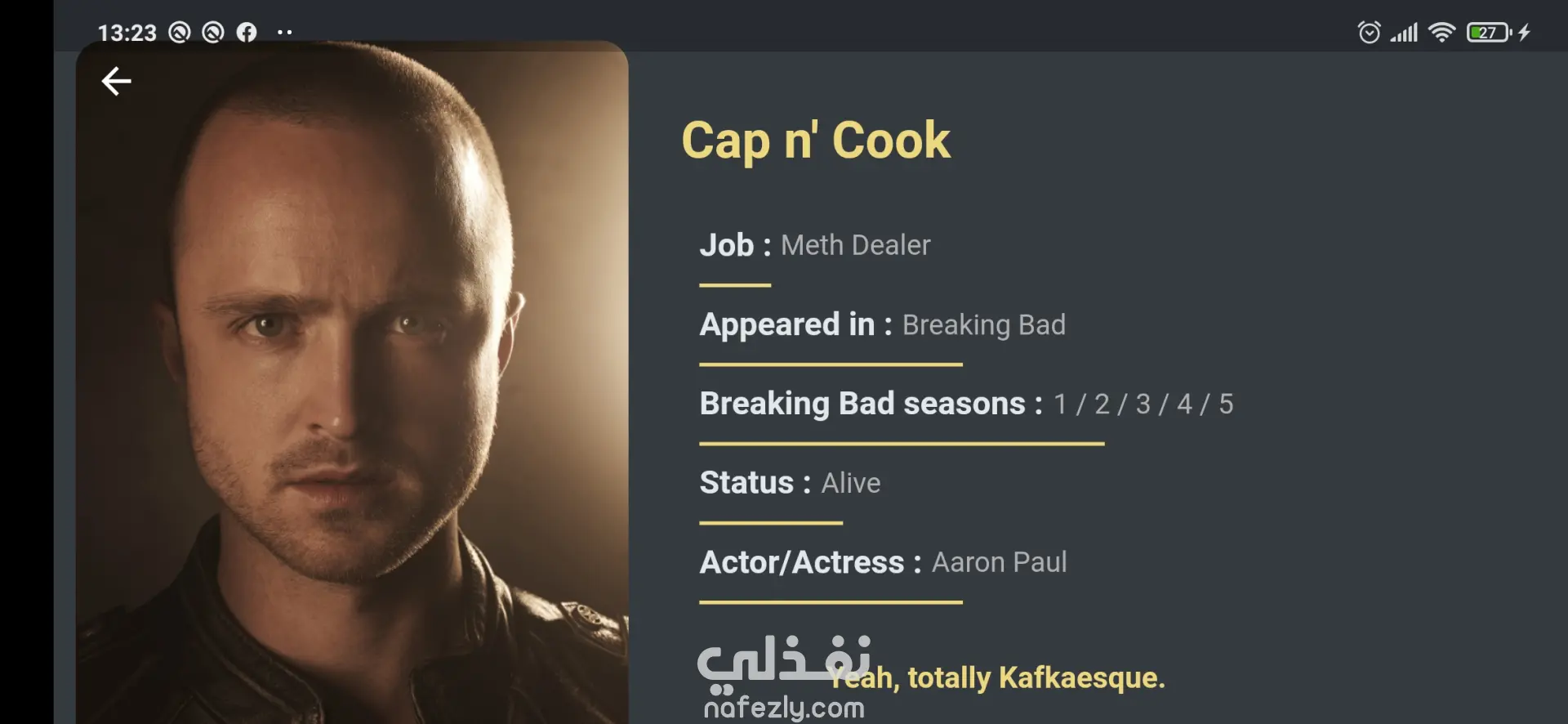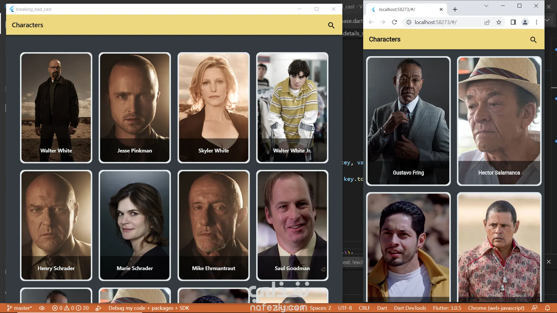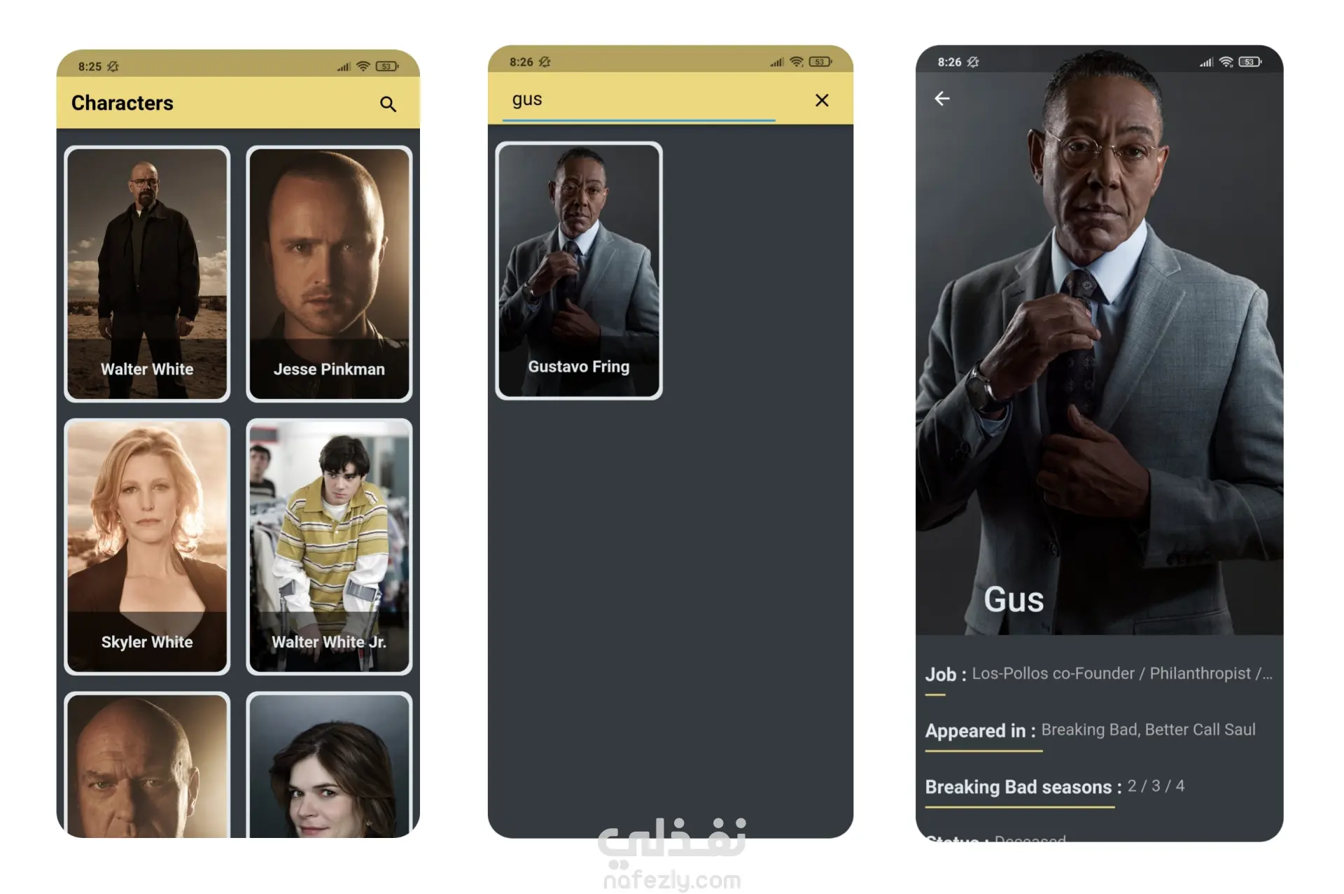 اللغات والأدوات المستخدمة: Dart، Flutter، Bloc، RESTful API تطبيق متجاوب (Responsive) ومتوافق مع مختلف أحجام الشاشات (Adaptive) لعرض تفاصيل طاقم عمل مسلسل Breaking Bad. يوفر التطبيق عرض معلومات الشخصيات بشكل منظم وجذاب، بالإضافة إلى عرض اقتباسات عشوائية للشخصيات مع تأثيرات نصية متحركة (Animated Text). كما يتضمن التطبيق: التحقق من حالة الاتصال بالإنترنت. جلب البيانات من خلال RESTful APIs. إدارة الحالة باستخدام Bloc لضمان أداء منظم واحترافي. التطبيق مصمم بواجهة مستخدم سلسة وتجربة استخدام مميزة تناسب مختلف الأجهزة.