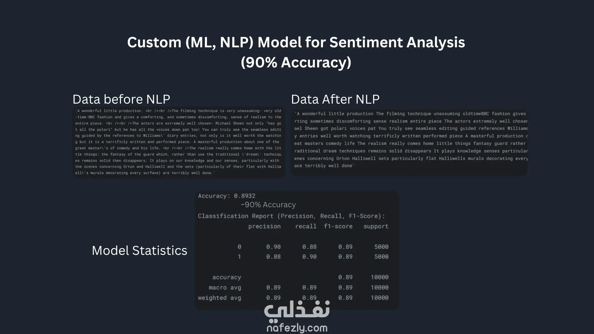 قمت بتطوير نموذج لتحليل مشاعر تقييمات الأفلام (Sentiment Analysis) باستخدام مجموعة بيانات IMDB Movie Reviews، حيث يقوم النموذج بتصنيف المراجعات النصية إلى إيجابية أو سلبية اعتمادًا على تقنيات معالجة اللغة الطبيعية (NLP). يعتمد المشروع على تجهيز ومعالجة النصوص بشكل كامل، بدءًا من تنظيف البيانات، إزالة الضوضاء، واستخراج السمات النصية باستخدام TF-IDF، ثم تدريب نموذج Logistic Regression لتحقيق أداء قوي وسريع في التصنيف. المشروع يبرز قدرتي على بناء نماذج NLP فعّالة وقابلة للتطبيق العملي، مع إمكانية تحسين الأداء من خلال Fine-Tuning وFeature Engineering حسب طبيعة البيانات.