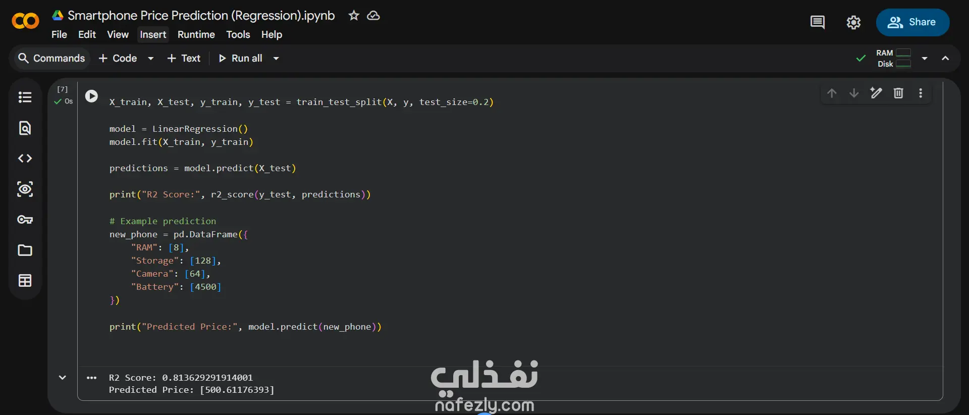 تم استخدام خوارزمية Scikit-learn وتطبيق نموذج Linear Regression بعد تقسيم البيانات إلى بيانات تدريب واختبار، مع تقييم أداء النموذج باستخدام معامل التحديد (R² Score).