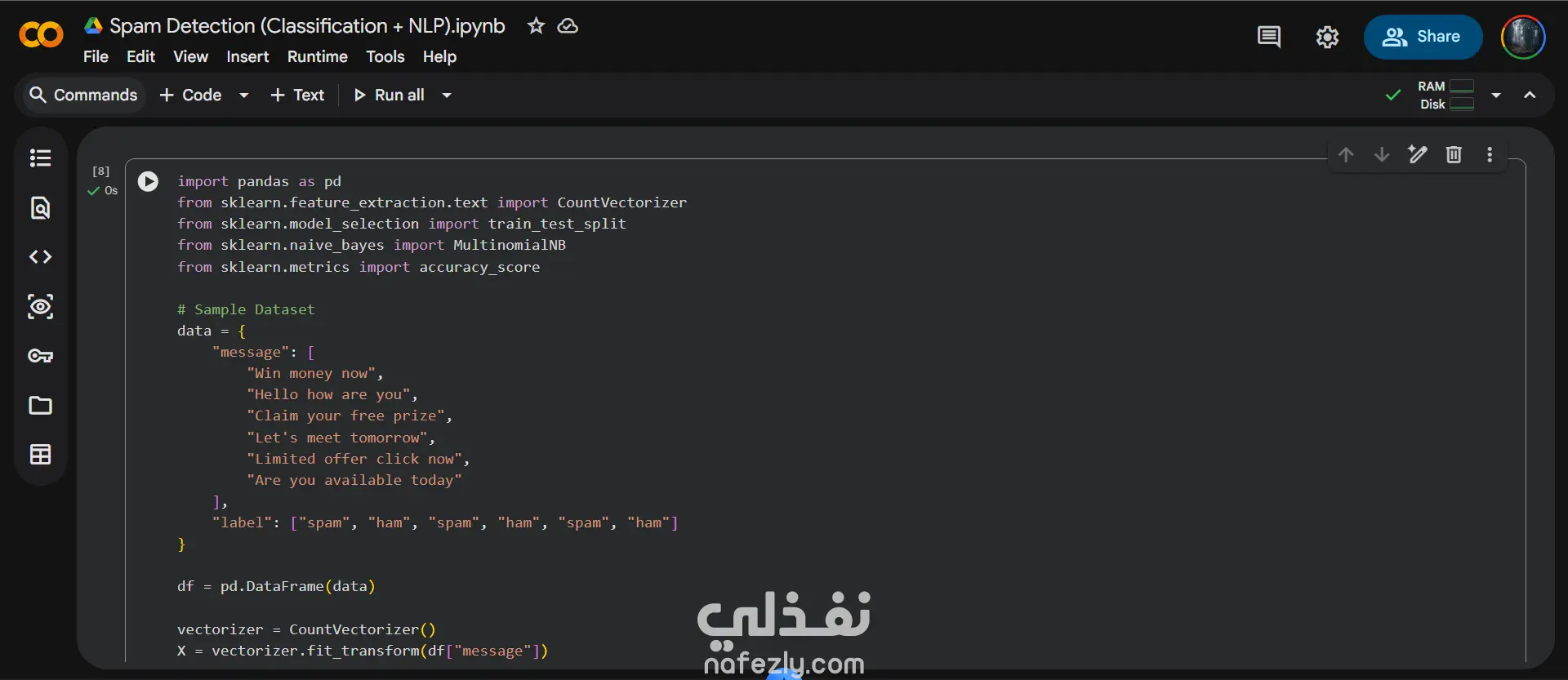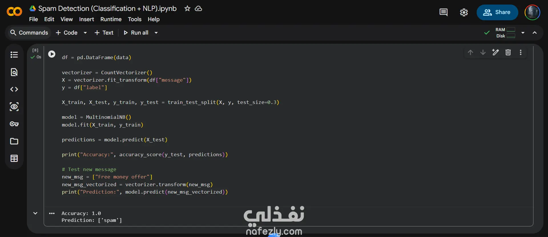 تم تطبيق تقنيات المعالجة الأولية للنصوص (NLP) باستخدام CountVectorizer، ثم تدريب نموذج تصنيف باستخدام خوارزمية Naive Bayes من مكتبة Scikit-learn.
