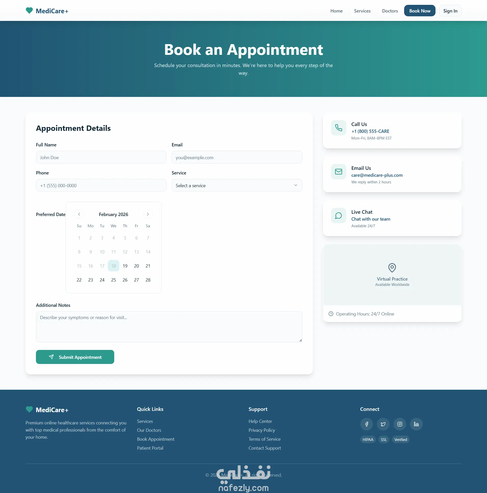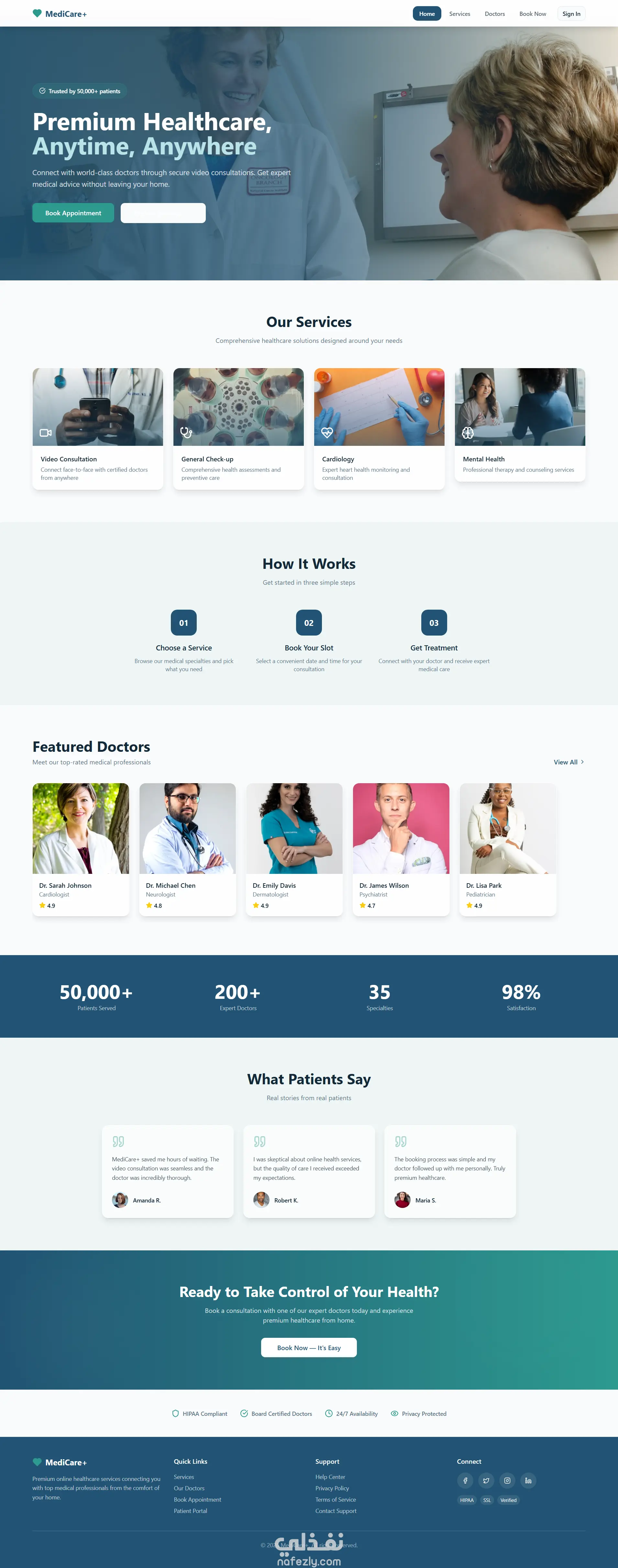 قمت بتصميم وتطوير موقع خدمات طبية أونلاين حديث واحترافي، يتميز بتجربة مستخدم قوية وواجهة جذابة، مع اعتماد كامل على الصور الواقعية للأطباء والمرضى، وليس الأيقونات.