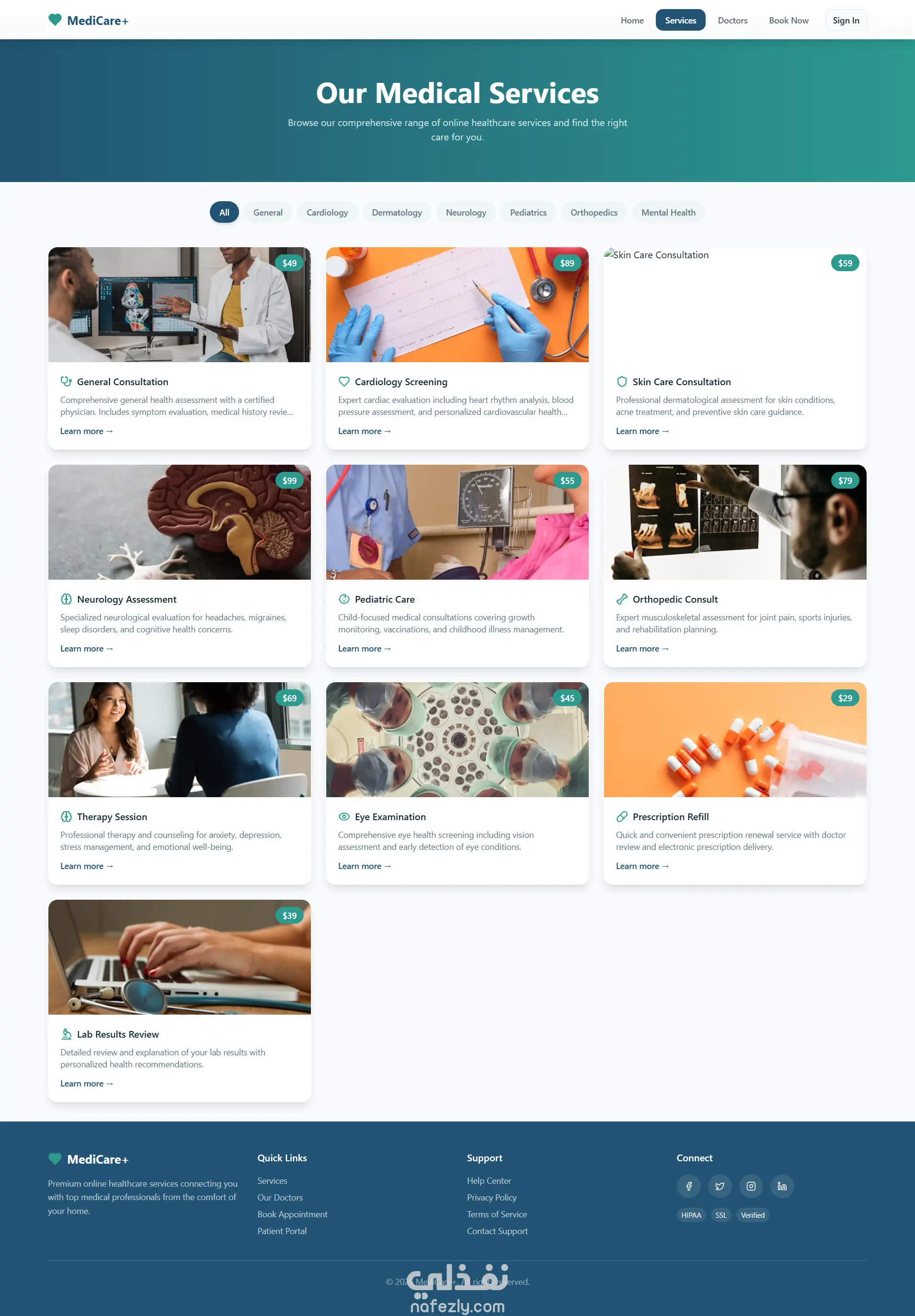 Services Page: عرض شبكة الخدمات الطبية بأيقونات وصور واقعية، مع تفاصيل كل خدمة في نافذة منبثقة أو لوحة متحركة، وأدوات تصفية حسب الفئات.