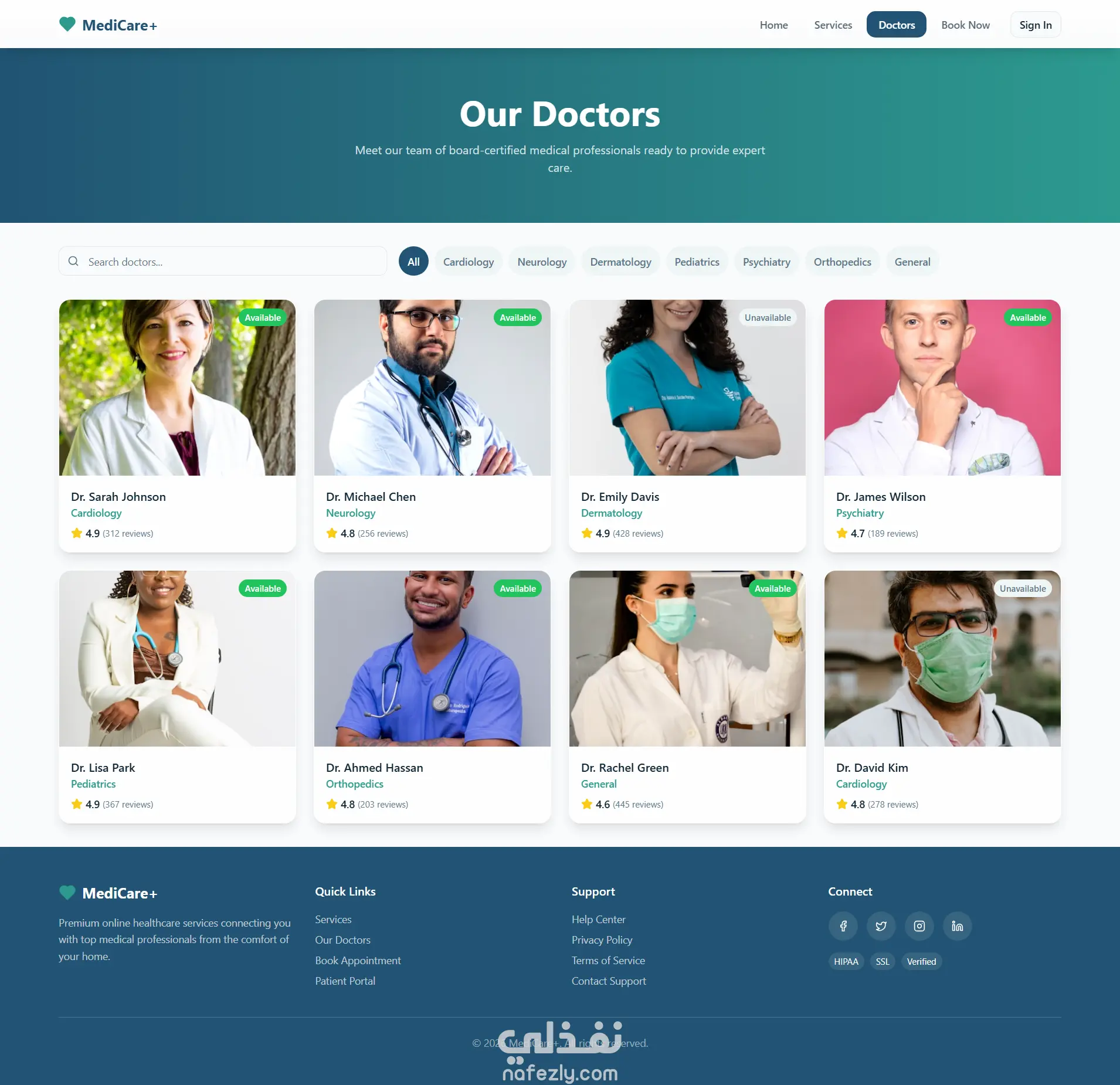 Doctors / Providers Page: ملفات تعريف الأطباء مع صور، تخصصات، تقييمات، وحالة التوفر، مع أزرار حجز ومعاينة سريعة وhover effects متحركة.