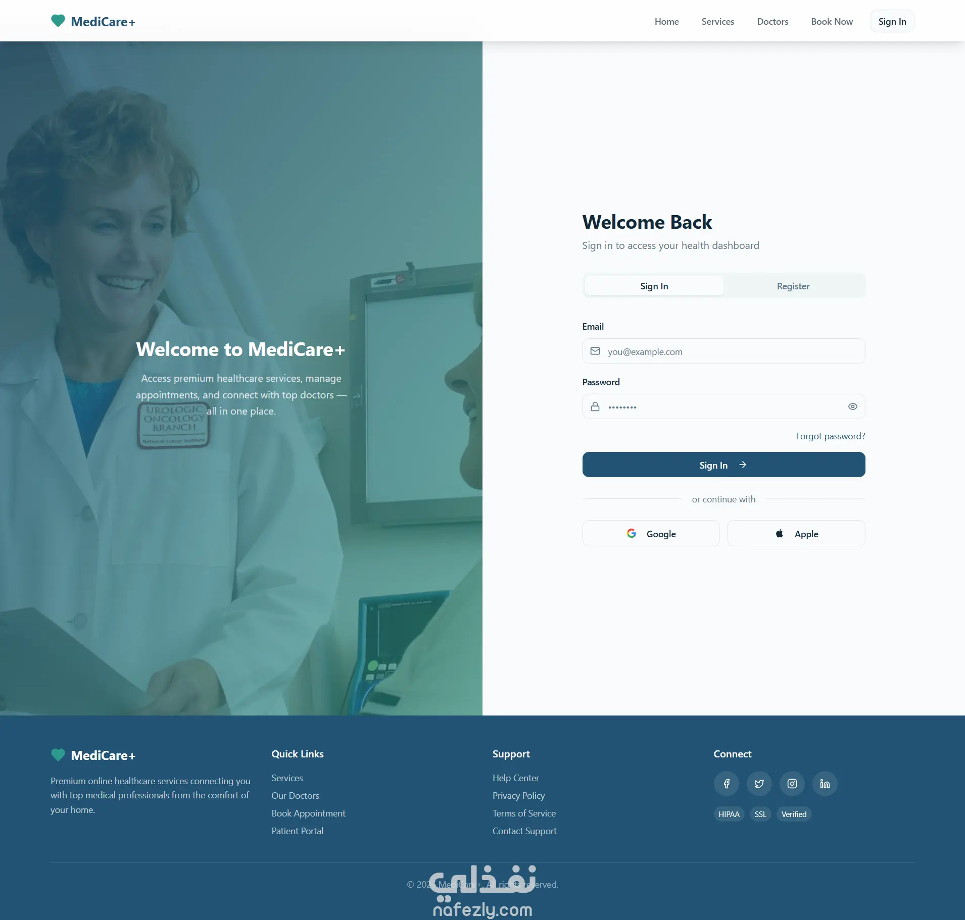 Login / Sign Up Page: تصميم منقسم مع رسومات طبية متحركة ونماذج تسجيل دخول / تسجيل جديدة، مع دعم تسجيل عبر الشبكات الاجتماعية وإعادة تعيين كلمة المرور.