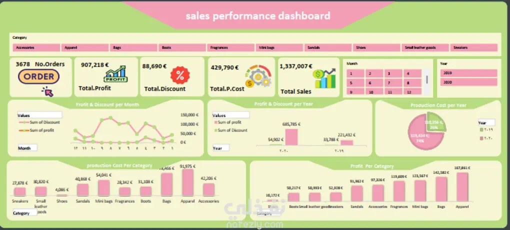 . التحدي (The Challenge) المشكلة الأساسية اللي كانت بتواجه الإدارة هي تشتت البيانات وعدم القدرة على ربط المبيعات بالتكاليف والخصومات بشكل لحظي. التحديات كانت: تداخل البيانات: صعوبة معرفة أي الفئات (Categories) هي الأكثر ربحية فعلياً بعد خصم تكاليف الإنتاج. مراقبة الخصومات: الحاجة لمتابعة "إجمالي الخصومات" (88,690€) والتأكد من أنها لا تأكل هامش الربح. تحليل التغير الزمني: المقارنة بين أداء سنتي 2019 و2020 وتحديد المواسم التي ينخفض فيها الربح (كما هو واضح في الرسم البياني المتذبذب). 2. الأدوات المستخدمة (Tools & Features) بناءً على تصميم اللوحة، تم استخدام أدوات احترافية (غالباً Excel أو Power BI) تشمل: Slicers (المقسمات): الموجودة في الأعلى لاختيار الفئة (Apparel, Bags, etc.) وفي الجانب لاختيار السنة والشهر، مما يجعل التقرير تفاعلياً. KPI Cards (بطاقات الأداء): لعرض الأرقام الضخمة بشكل سريع (Total Sales, Total Profit, No. Orders). Combo Charts: الرسم البياني في المنتصف الذي يجمع بين "الربح" و "الخصم" لمقارنة العلاقة بينهما شهرياً. Donut/Pie Charts: لتوضيح نسبة تكاليف الإنتاج وتوزيعها. Bar Charts: لترتيب الفئات حسب الربحية (Profit Per Category) من الأقل للأعلى. 3. النتائج المستخلصة (Key Insights) من خلال نظرة سريعة على الأرقام، نقدر نطلع بالنتائج دي: الأداء العام: إجمالي المبيعات وصل لـ 1,337,007€ بصافي ربح 907,218€، وده مؤشر ربحية ممتاز. الفئة الرائدة: ملابس (Apparel) هي الحصان الرابح بأعلى صافي ربح (167,861€). الفئة الأضعف: الأحذية (Shoes) هي الأقل ربحية (10,172€) رغم أنها قد تستهلك تكاليف إنتاج، مما يستوجب إعادة النظر في استمرارها أو تغيير استراتيجيتها. كفاءة التكاليف: تكلفة الإنتاج الكلية تمثل جزءاً محسوباً بدقة مقارنة بالمبيعات، واللوحة بتسمح للمدير المالي بالتحكم في الـ Production Cost لكل فئة على حدة.