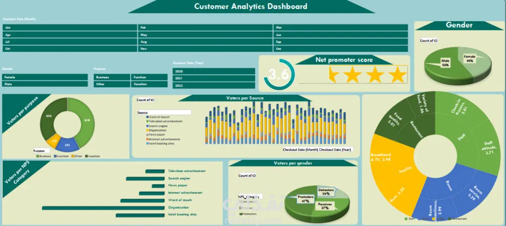 1. التحدي (The Challenge) التحدي الرئيسي كان قياس الرضا النوعي وتحويل آراء العملاء إلى أرقام يمكن اتخاذ قرار بناءً عليها: تحديد نقاط الضعف: معرفة أي الخدمات (الغرف، المطعم، الصالة الرياضية) تحتاج لتحسين فوري. فهم سلوك العميل: الربط بين غرض الزيارة (عمل، إجازة) وبين مستوى الرضا. قياس الولاء: حساب الـ (NPS) بدقة لتصنيف العملاء إلى (مروجين، محايدين، أو منتقدين). 2. الأدوات المستخدمة (Tools & Features) اللوحة مصممة لتكون "مركز استماع" للعملاء باستخدام: NPS Gauge & Stars: وسيلة بصرية سريعة لعرض متوسط التقييم (3.6 نجوم) ونسبة صافي الترويج. Sunburst/Doughnut Chart: الرسم الدائري الكبير على اليمين يحلل الخدمات التفصيلية (Staff, Room, Facility) مع تقييم فرعي لكل نقطة (مثل: نظافة الغرف 2.99). Stacked Bar Chart: في قسم (Voters per Source) لمقارنة القنوات التي يأتي منها العملاء (مثل: Word of mouth أو وسائل التواصل) وتأثيرها على حجم التصويت. Demographic Slicers: فلاتر لتقسيم البيانات حسب النوع (ذكر/أنثى) وحسب سنة الحجز (2020، 2021، 2022). 3. النتائج المستخلصة (Key Insights) تحليل الفئات (NPS): النسبة الأكبر من العملاء هم "مروجون" (Promoters) بنسبة 47%، لكن هناك نسبة "منتقدين" (Detractors) تصل لـ 26%، وهي نسبة تحتاج لتدخل سريع. أداء الخدمات: الموظفون (Staff) حصلوا على أعلى تقييم (3.81 للتعامل و 3.71 للسلوك)، بينما تعتبر "نظافة الغرف" (2.99) و"تنوع الطعام" (1.86) من أقل النقاط تقييماً. الجمهور المستهدف: يتضح أن 56% من المصوتين هم من الذكور، وأن الغرض الأساسي لمعظم الزيارات هو "الإجازة" (Vacation) بواقع 828 صوتاً. مصدر الزيارات: "مواقع حجز الفنادق" (Hotel booking sites) هي المصدر الأكبر لجلب العملاء مقارنة بالوسائل التقليدية.