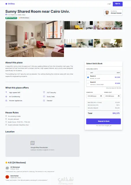 الهدف من المشروع: توفير بديل تقني وعملي يغني عن التعامل مع الوسطاء، ويوفر تجربة مستخدم سلسة وآمنة للبحث عن السكن الجامعي أو السكن للمغتربين.