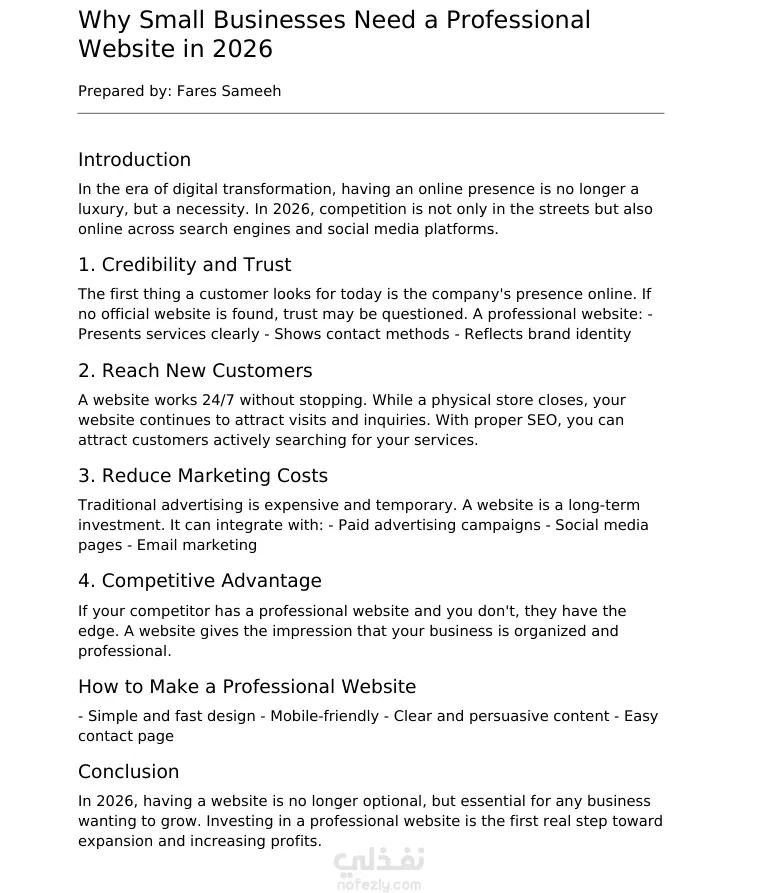 "لماذا تحتاج الشركات الصغيرة إلى موقع إلكتروني احترافي في 2026"