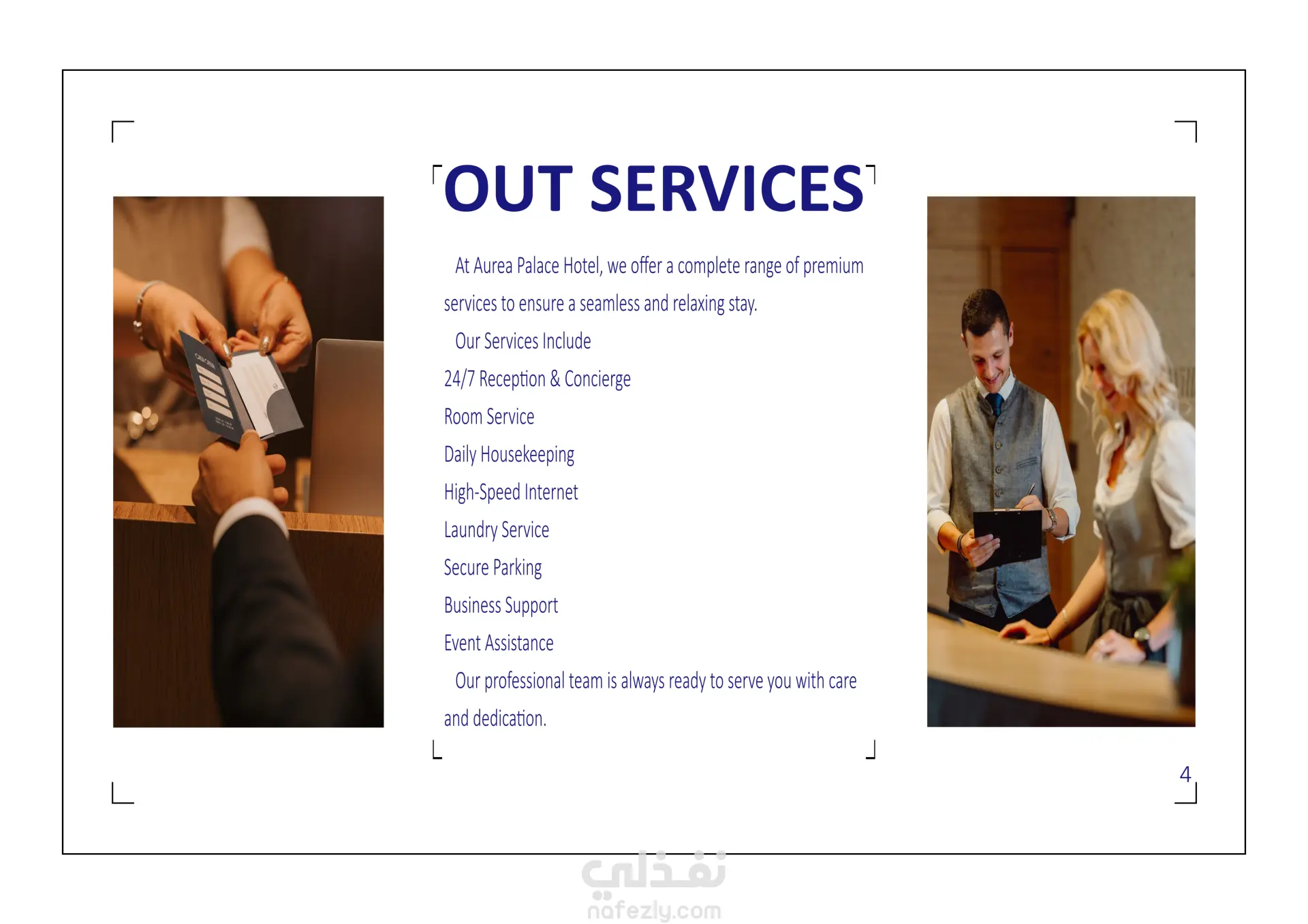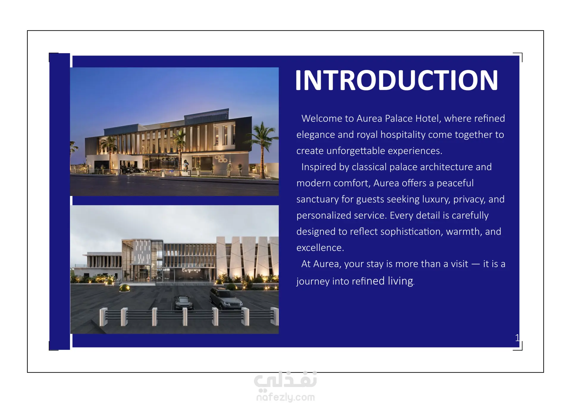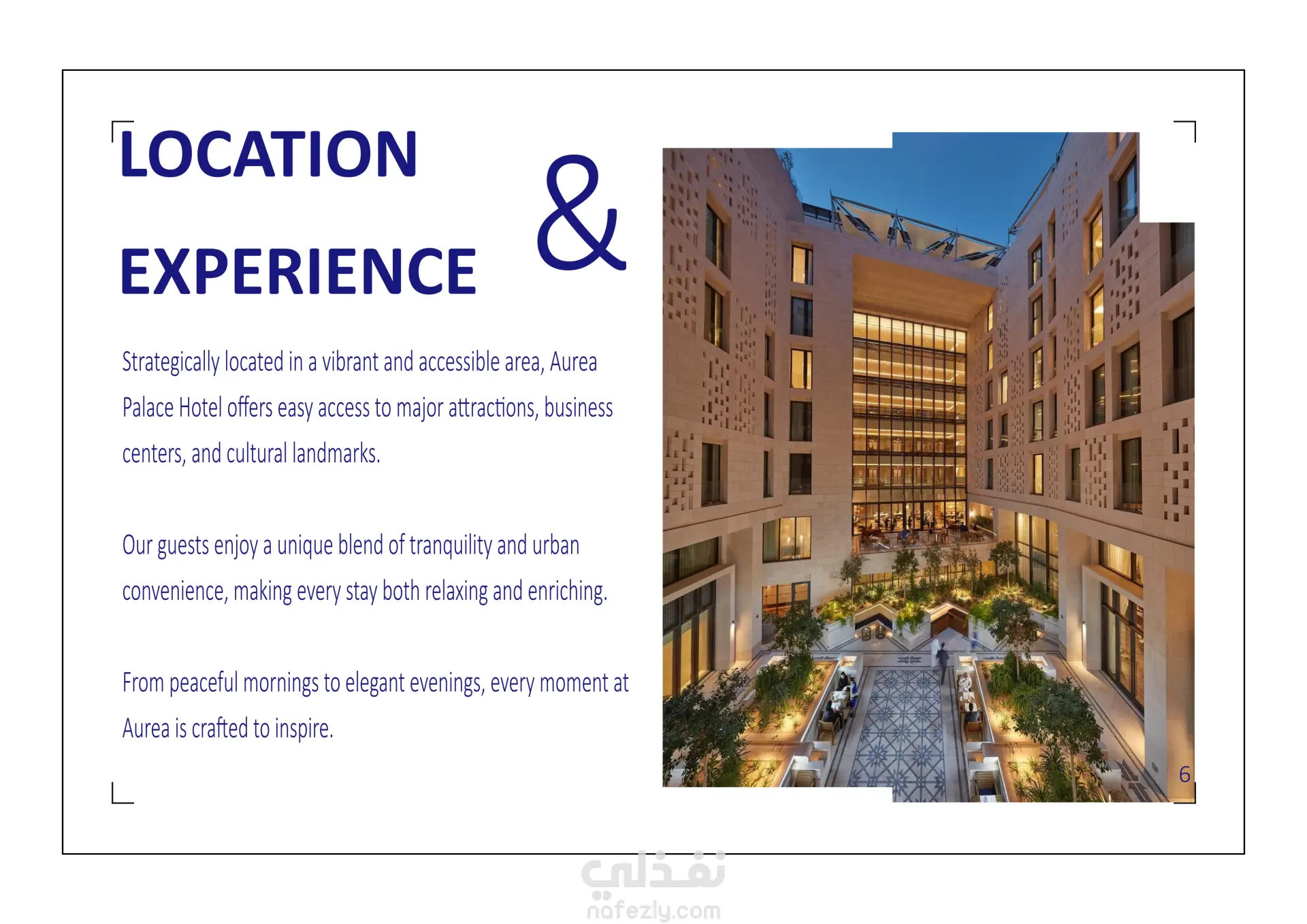 الكتيب التعريفي لفندق Aurea Palace Hotel عبارة عن تعريف شامل للفندق من حيث كل معلوماتهم الداخلية بداية من التعريف بالفندق الى الخدمات وصولا الى أدوات التواصل