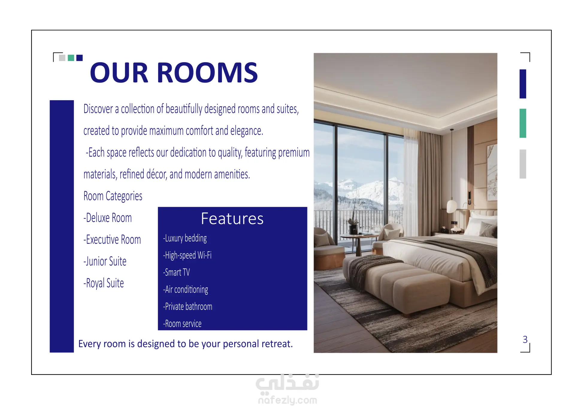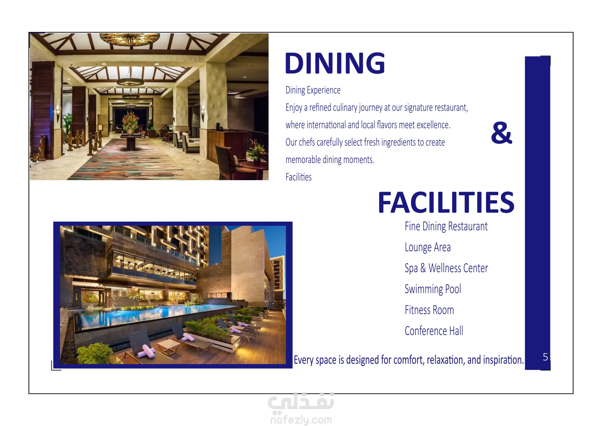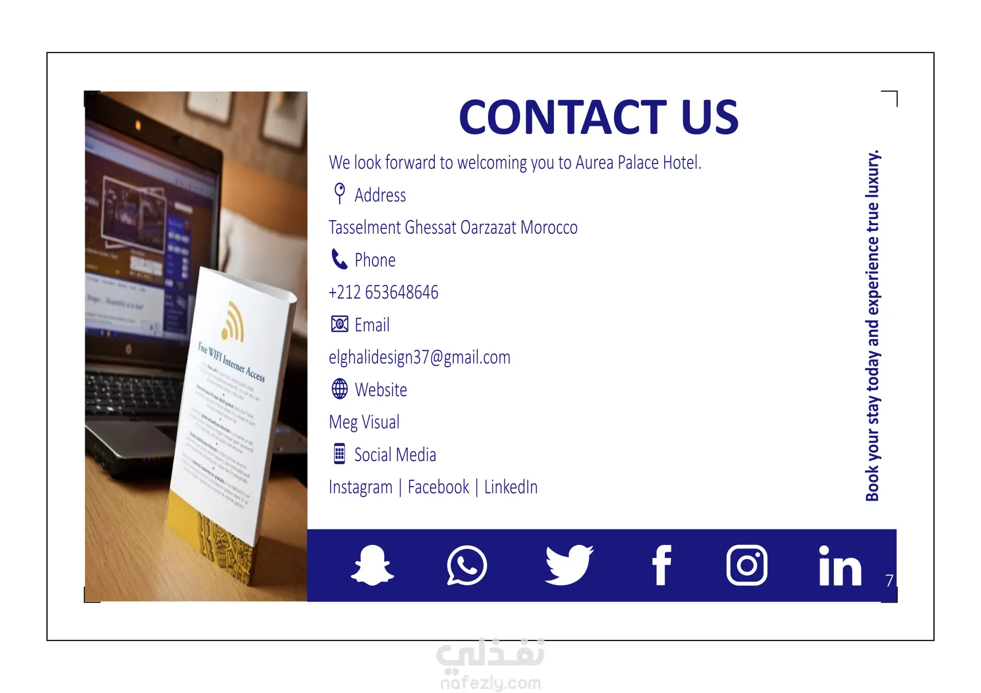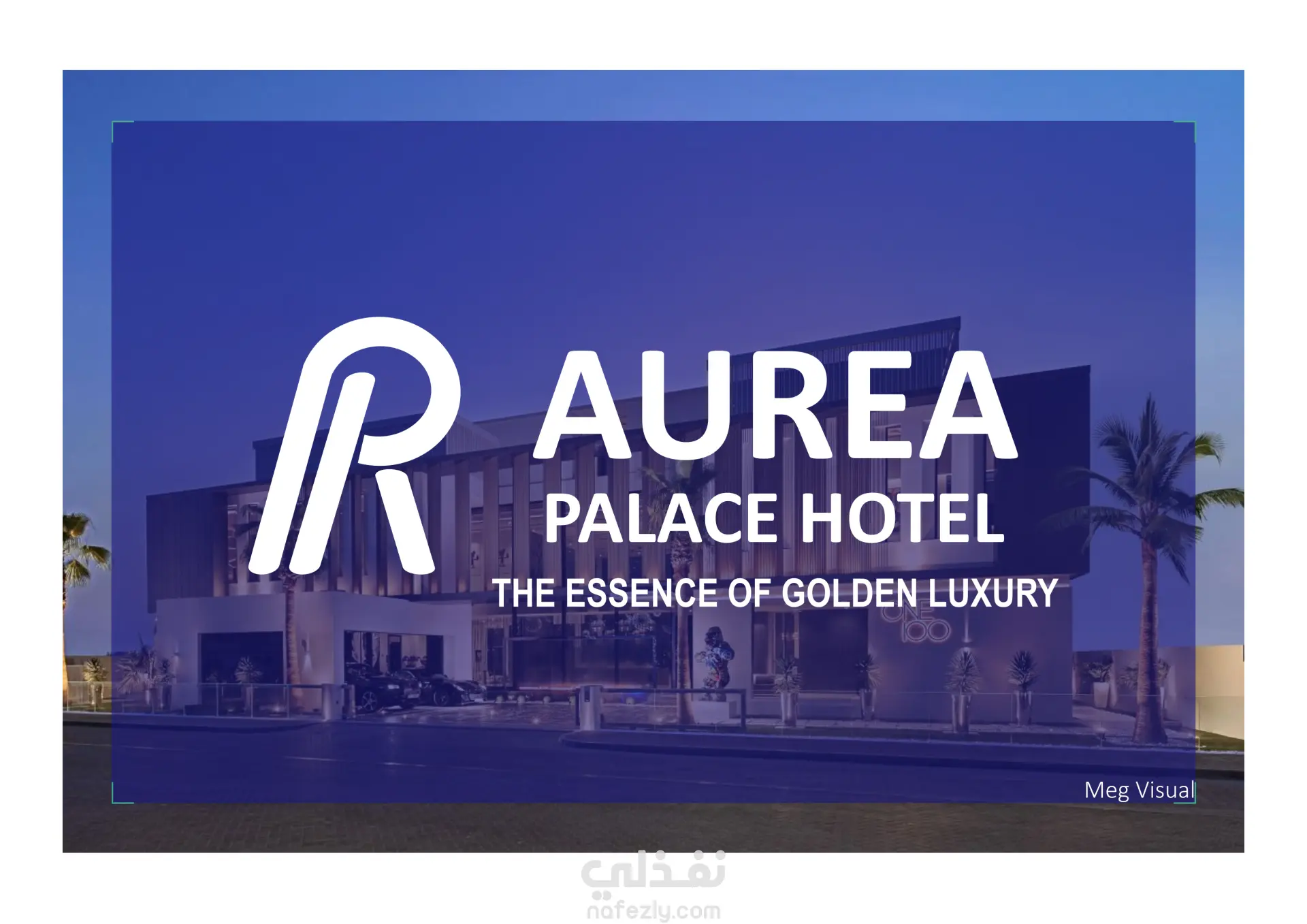 و في التصميم تم اعتماد اشكال مندرجة من هوية الفندق كأيقونات التأطير و الشكل الأزرق الثابت من أصل الهوية