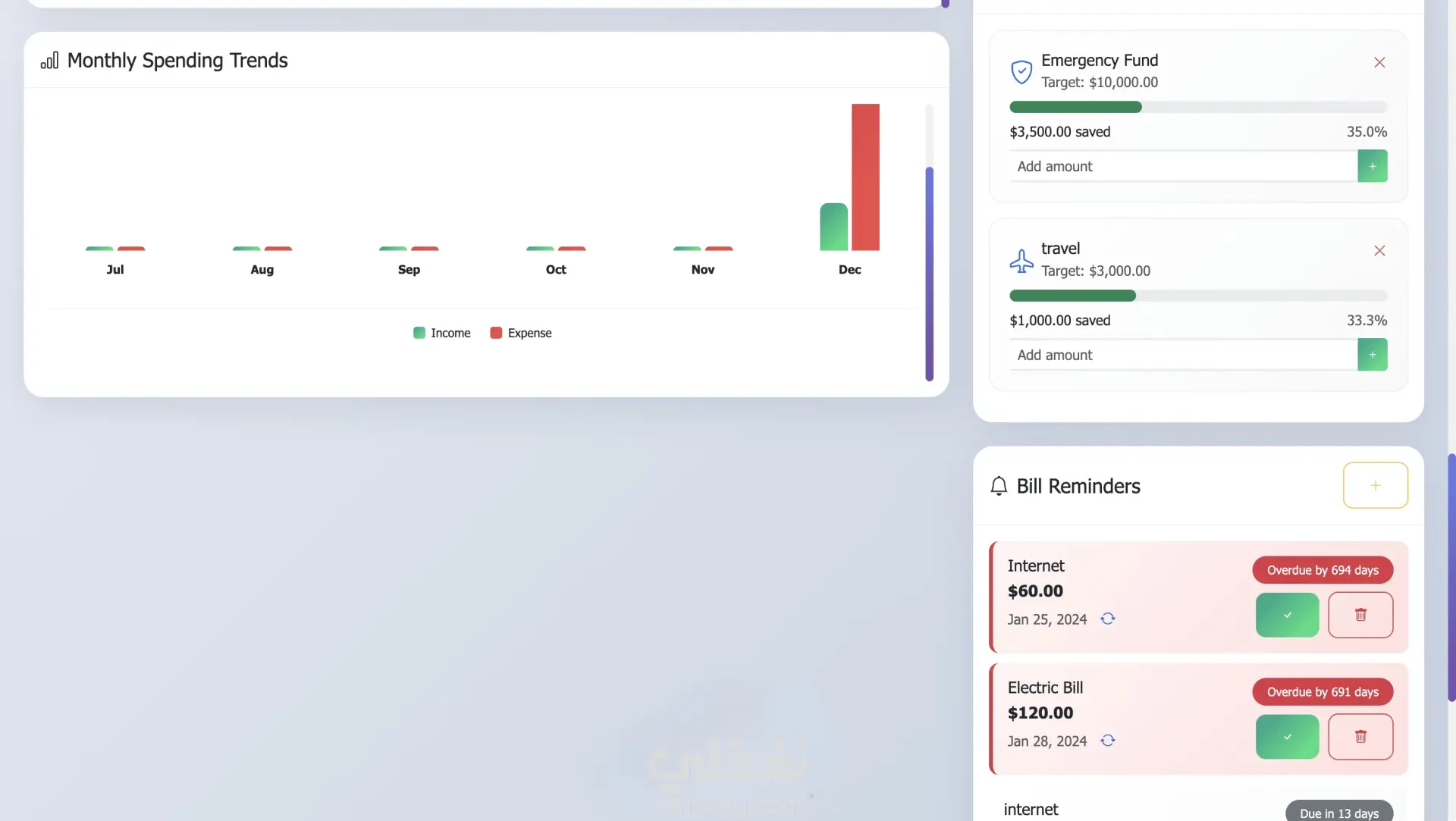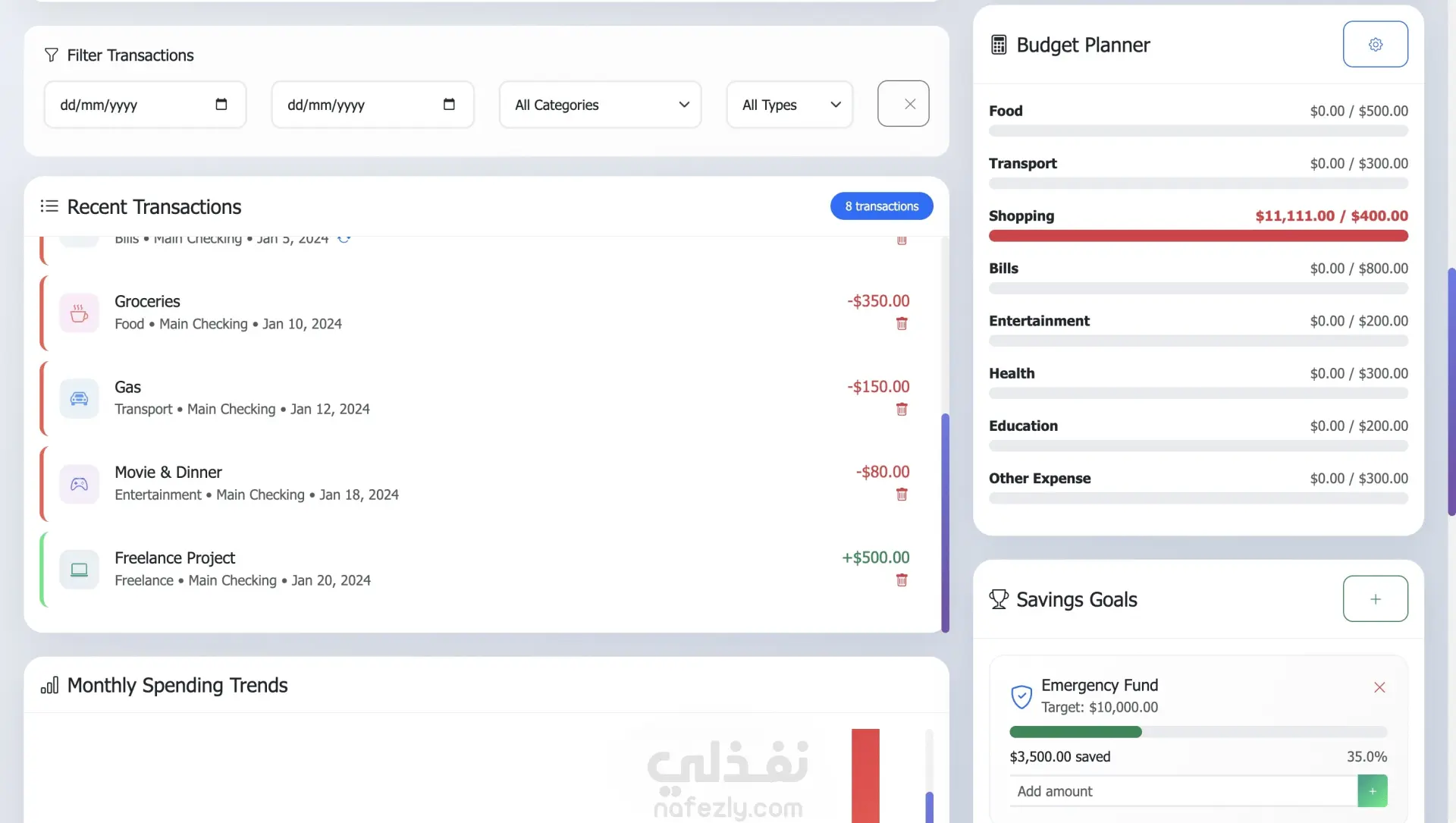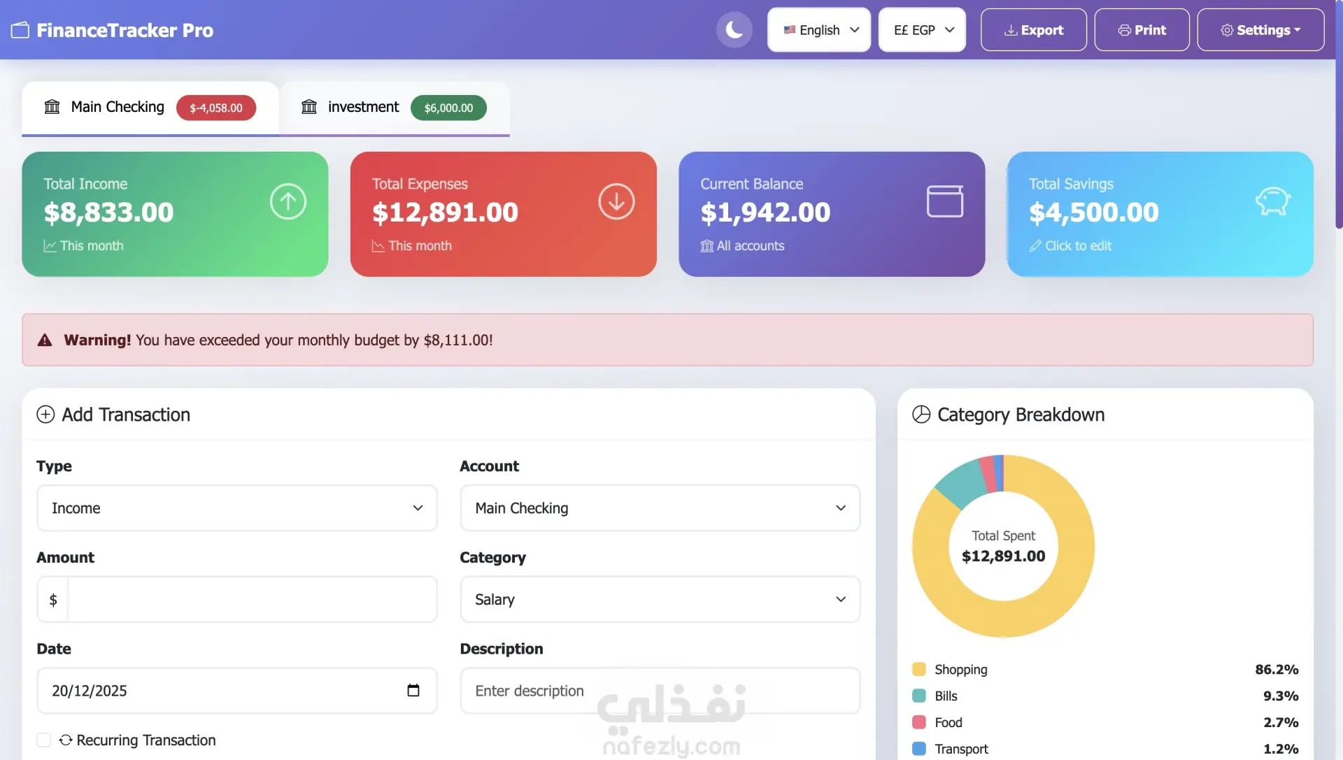 هل تريد طريقة بسيطة ومنظمة لمتابعة دخلك ومصروفاتك؟ أقدّم لك تصميم Personal Finance Tracker Dashboard احترافي مميزات اللوحة: - إضافة دخل ومصروفات - عرض الرصيد الحالي - تصنيف المصروفات - Category Breakdown (Charts) رسم بياني للمصروفات - Spending Trends - Budget Status مع تنبيهات - Dark Mode - دعم العملة المصرية و الامريكية -دعم اللغة العربية والانجليزية - تصدير التقرير المالي - طباعة كشف حساب - تصميم Responsive يعمل على الموبايل -حفظ البيانات في LocalStorage -استرجاعها بعد غلق الصفحة -فلترة حسب: التاريخ ، النوع ، التصنيف الكود منظم ومقسم (HTML / CSS / JS)