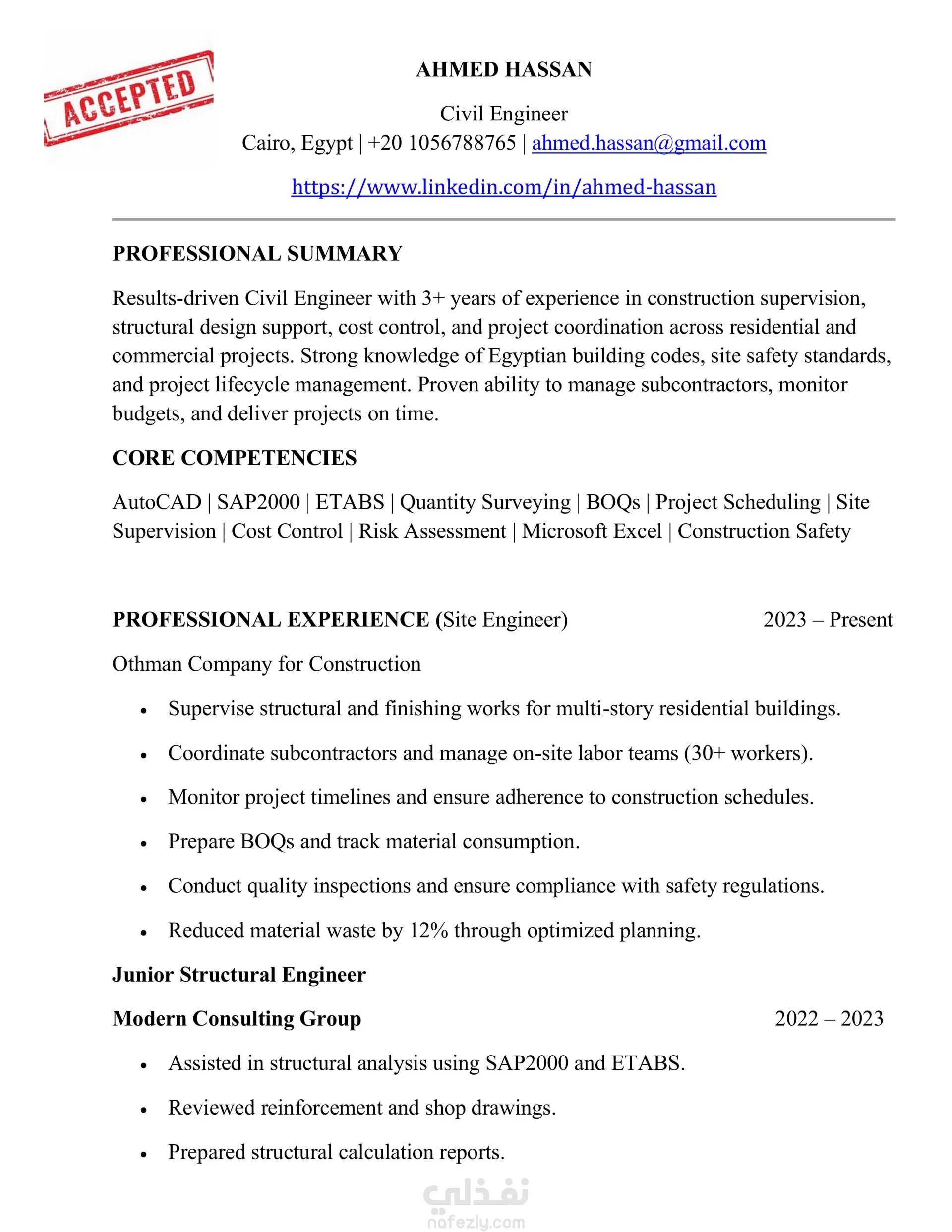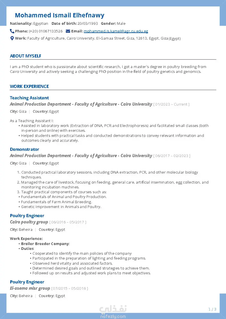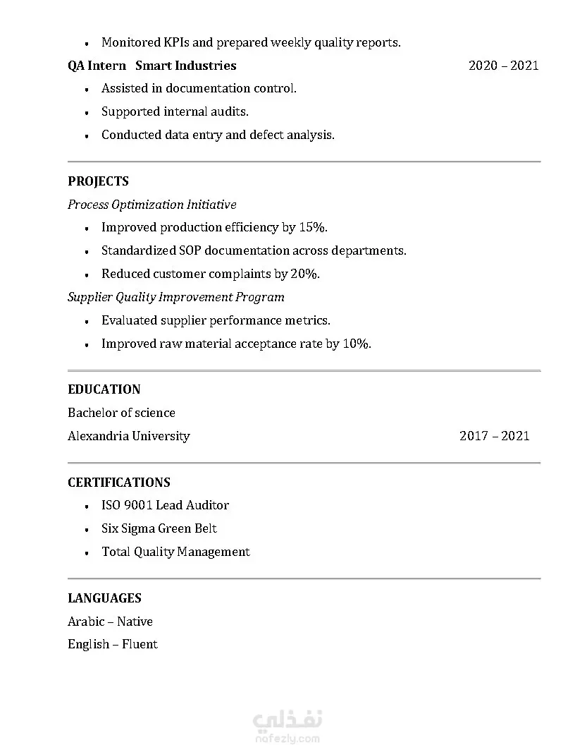 هل تعلم أن أغلب السير الذاتية تُرفض قبل أن يقرأها مسؤول التوظيف؟ ليس بسبب ضعف الخبرة… بل بسبب طريقة العرض. قد تمتلك مهارات قوية وخبرات حقيقية، لكن بدون صياغة احترافية وتنسيق صحيح، لن تحصل على فرصة المقابلة. هنا يأتي دوري. سأقوم بإعداد سيرة ذاتية احترافية مخصصة لك، تعكس قيمتك الحقيقية وتُبرز نقاط قوتك بأسلوب مقنع ومتوافق مع أنظمة الفرز الإلكتروني (ATS). ماذا تشمل الخدمة؟ كتابة سيرة ذاتية احترافية مخصصة بالكامل إعادة صياغة الخبرات والمهارات بأسلوب قوي ومؤثر تنسيق عصري منظم وسهل القراءة صفحة واحدة أو صفحتين حسب مستوى خبرتك اللغة العربية أو الإنجليزية توافق كامل مع أنظمة ATS هذه الخدمة مناسبة لـ: حديثي التخرج الباحثين عن أول وظيفة الراغبين في تغيير مجالهم أصحاب الخبرات الذين يريدون تطوير سيرتهم لماذا تختارني؟ كتابة موجهة لسوق العمل الحقيقي فهم دقيق لمتطلبات التوظيف الحديثة التزام كامل بالموعد تواصل سريع واحترافي تعديلات حتى رضاك التام النتيجة النهائية سيرة ذاتية قوية تجعلك: تتجاوز أنظمة الفرز الإلكتروني تترك انطباعًا احترافيًا من أول نظرة تزيد فرصك في الحصول على مقابلات عمل