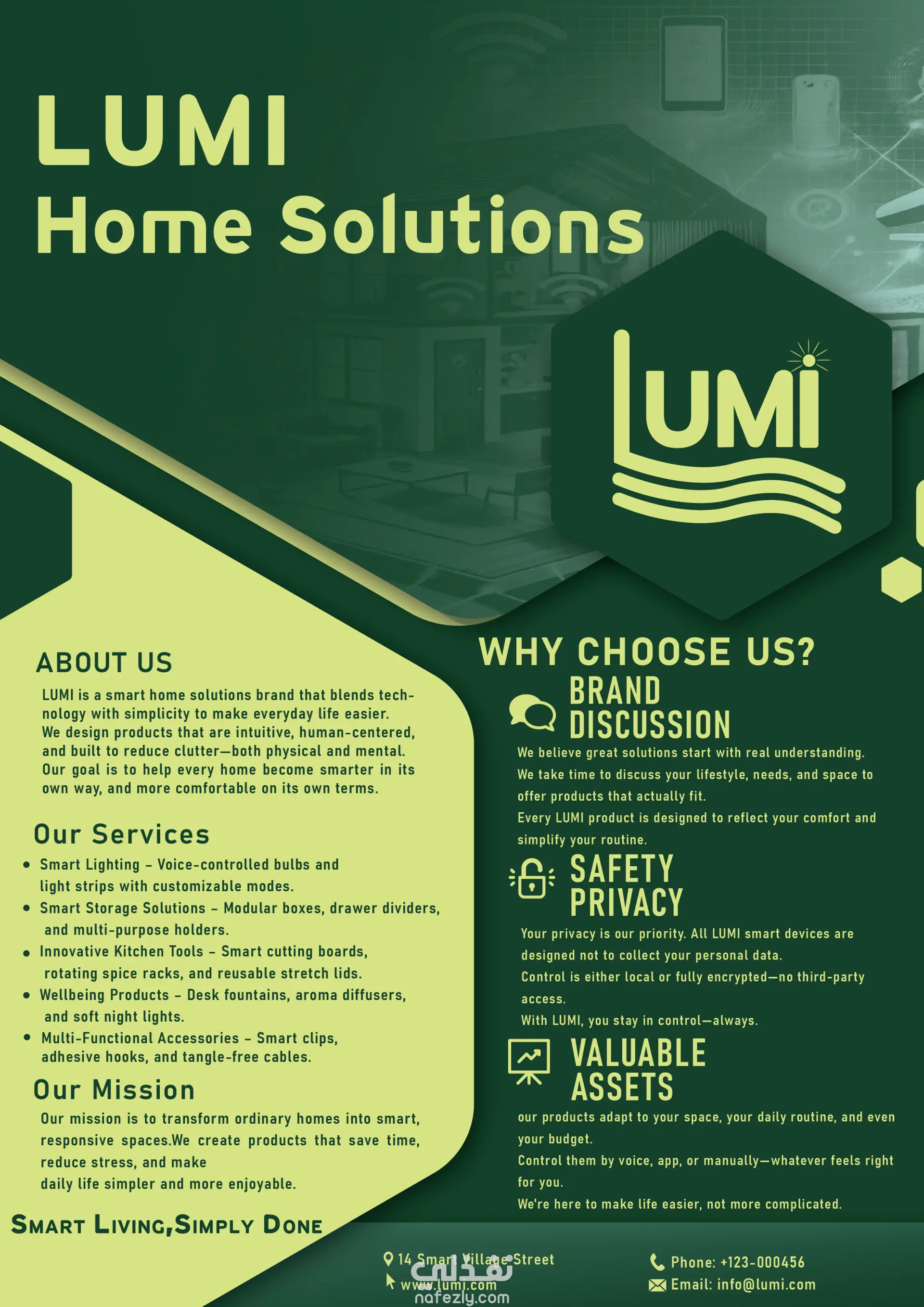 تم تصميم هوية بصرية متكاملة لشركة Lumi المتخصصة في تقديم الحلول الذكية للمنازل، بهدف إنشاء طابع بصري يعكس الابتكار والتكنولوجيا الحديثة. شملت الهوية تصميم الشعار، كارت الأعمال، والفلاير، مع اختيار ألوان عصرية وخطوط متناسقة تعبر عن الذكاء، البساطة، والاحترافية. تم التركيز على تحقيق اتساق بصري قوي يعزز من تميز العلامة التجارية ويساعدها على الظهور بشكل احترافي عبر مختلف المنصات الرقمية والمطبوعات.