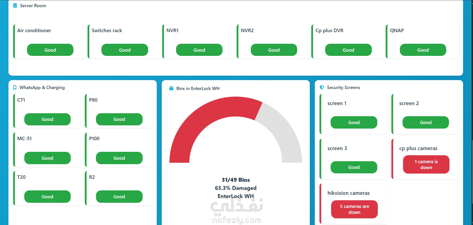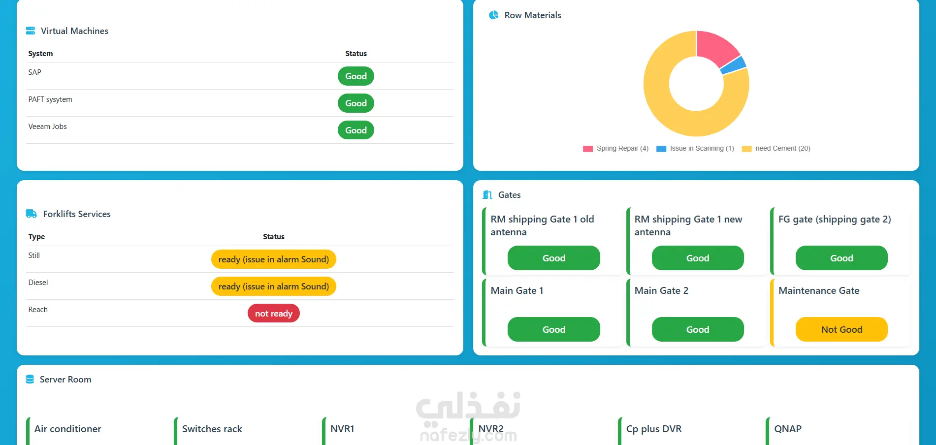 حالة غرفة السيرفر (Server Room): مراقبة حالة الأجهزة (Air conditioner, Switches rack, NVR1, NVR2, Cp plus DVR, QNAP).