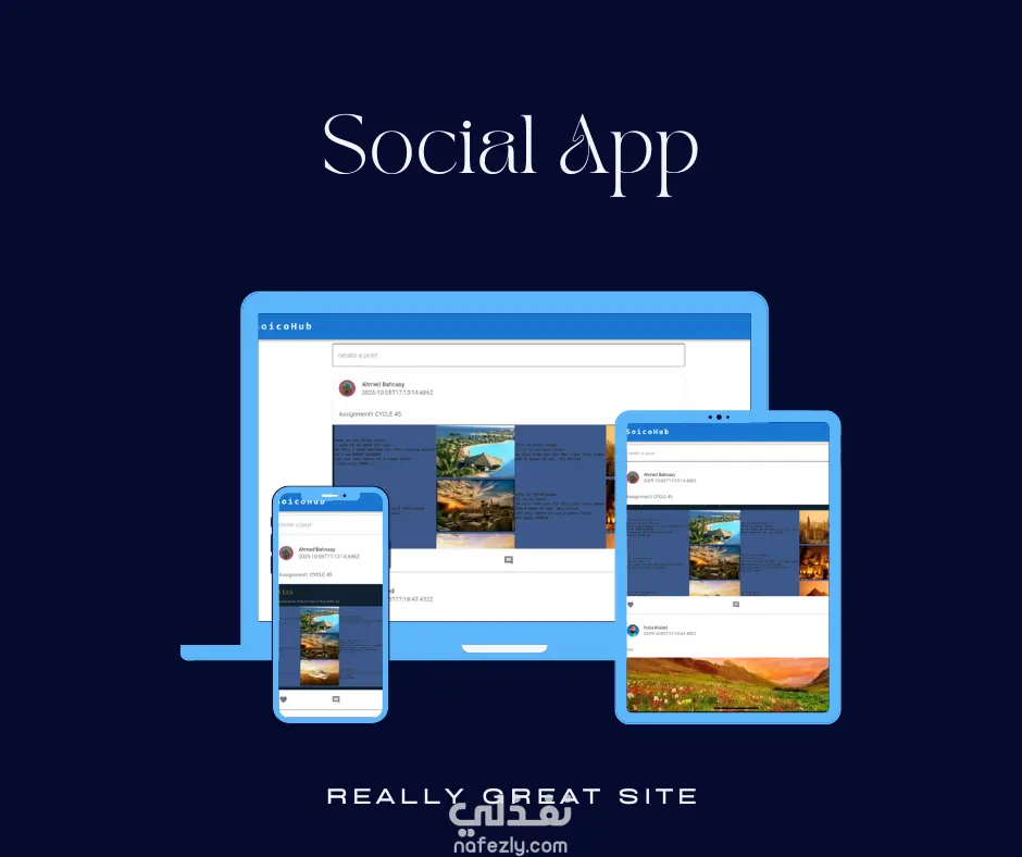 أقدم لك تطبيق ويب حديث للتواصل الاجتماعي، يتيح للمستخدمين إنشاء حسابات، تسجيل الدخول، نشر منشورات، التعليق على منشورات الآخرين، وإدارة ملفاتهم الشخصية بسهولة وسلاسة. تفاصيل التطبيق: تسجيل الدخول والتسجيل: واجهة سهلة لإنشاء حساب جديد أو تسجيل الدخول، مع التحقق من صحة البيانات لضمان معلومات صحيحة لكل مستخدم. الصفحة الرئيسية: عرض جميع المنشورات من المستخدمين، مع إمكانية إنشاء منشور جديد بسرعة وسهولة. صفحة الملف الشخصي: عرض بيانات المستخدم الشخصية، تعديل المعلومات، تغيير صورة الملف الشخصي، عرض المنشورات الخاصة بالمستخدم، وإضافة منشورات جديدة. تعديل المنشورات: إمكانية تعديل أي منشور من منشوراتك بسهولة دون الحاجة لإنشاء منشور جديد. التعليقات: يمكن إضافة التعليقات على أي منشور، سواء كان لك أو لمستخدم آخر، لتشجيع التفاعل والمناقشة. إدارة البيانات: جميع البيانات يتم جلبها ومعالجتها على الخادم لضمان سرعة وسلاسة في الأداء، مع تنظيم واضح للتنقل بين الصفحات. التطبيق يوفر تجربة مستخدم واضحة وسهلة، مع واجهة نظيفة ومتجاوبة تناسب جميع الأجهزة، لتسهيل التفاعل والمشاركة بين المستخدمين.
