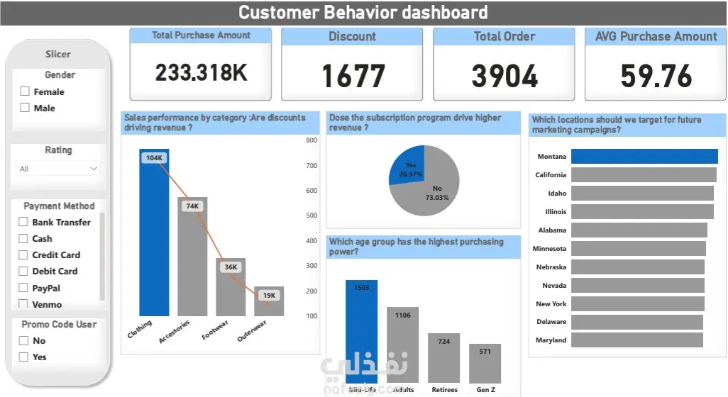تحليل سلوك العملاء: (مثل الموجود في الصورة) معرفة أكثر الفئات شراءً، افضل منتج يدخلك ربح، ونسبة الخصومات وتأثيرها.
