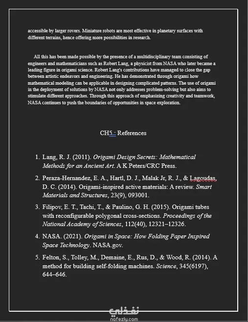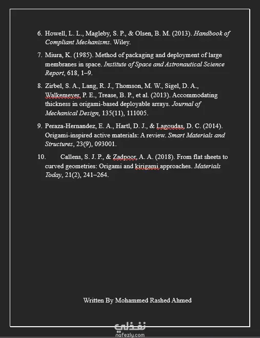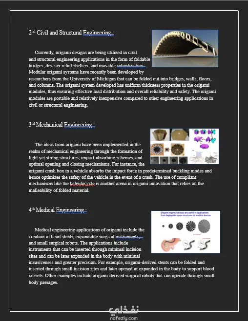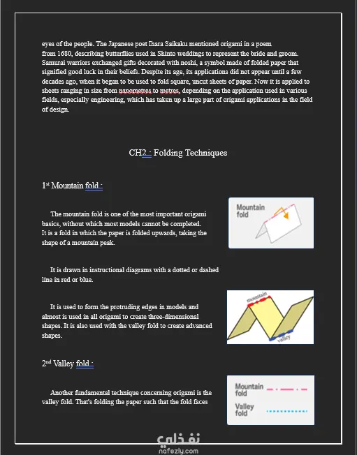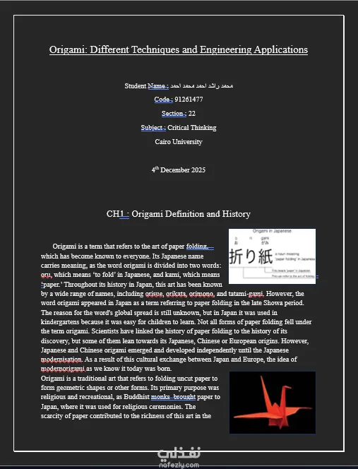 قمت بكتابة تقرير طلب مني في الكلية عن فن الاوريغامي و قمت بجمع كامل المعلومات من مختلف المصادر و انشاته بطريقة احترافية حيث نال واسع التقدير من دكتور المادة و احرزت على الدرجة الكاملة في التقرير