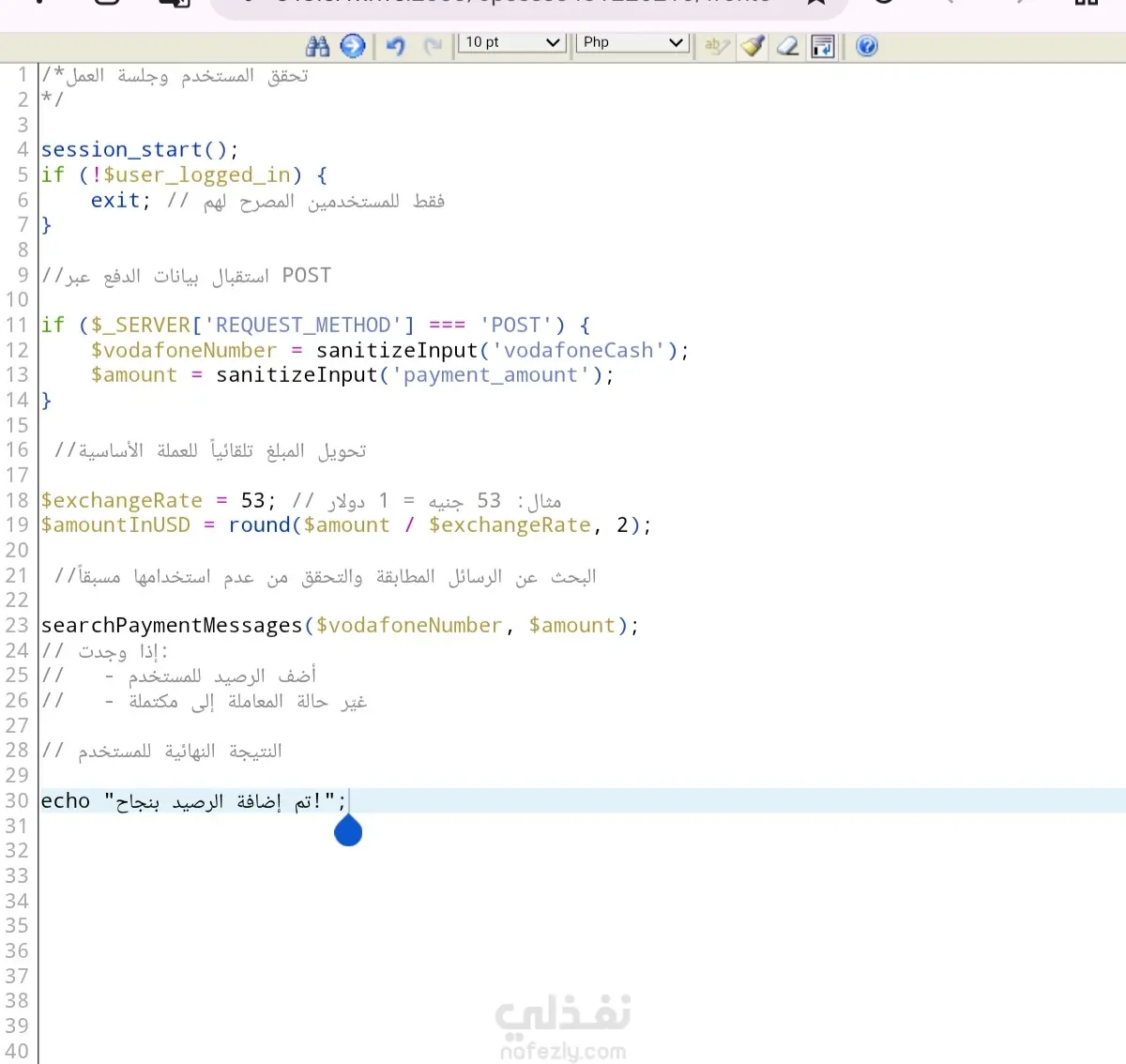 نظام بلغة php يقوم باستقبال رسائل دفع فودافون كاش من تطبيق على جهاز صاحب المحفظة يحلل الرسائل ويستخرج البيانات المهمة مثل رقم المرسل والمبلغ ورقم العملية والرصيد والتاريخ يحفظها في قاعدة بيانات mysql وعند إدخال المستخدم لبيانات الدفع يقوم السكربت بالبحث عن الرسالة المطابقة ويضيف الرصيد تلقائيا ويغير حالة المعاملة لتأكيد استخدامها النظام جميل جدا وذو تكلفة صفر دولار لأن فودافون كاش لا توفر api او مكتبة رسمية ولجأنا لحلول مبتكرة بدون دفع عمولات مثل ماي موب او خدمات اخرى حل غير مكلف ومبدع يوضح المشروع مهارات التعامل مع php pdo prepared statements json regex api وادارة البيانات والامن