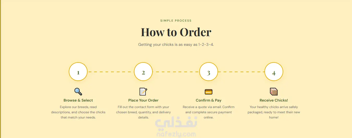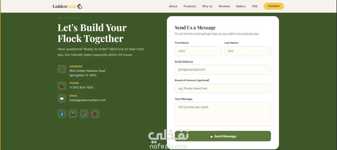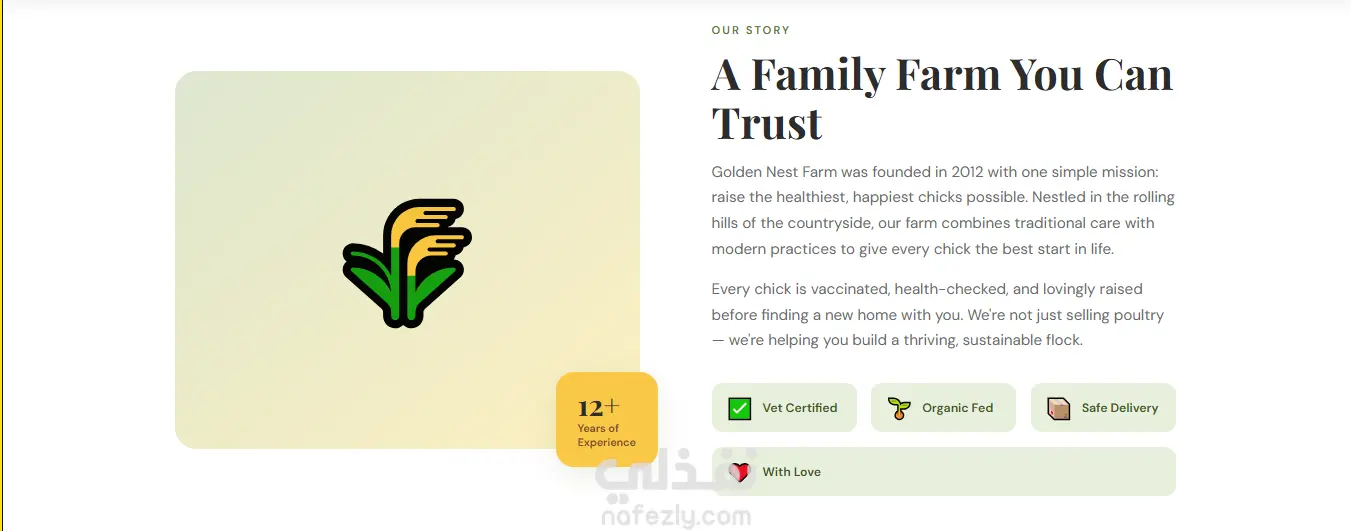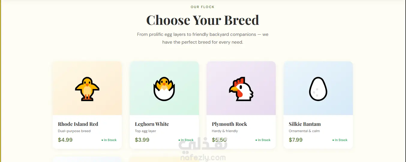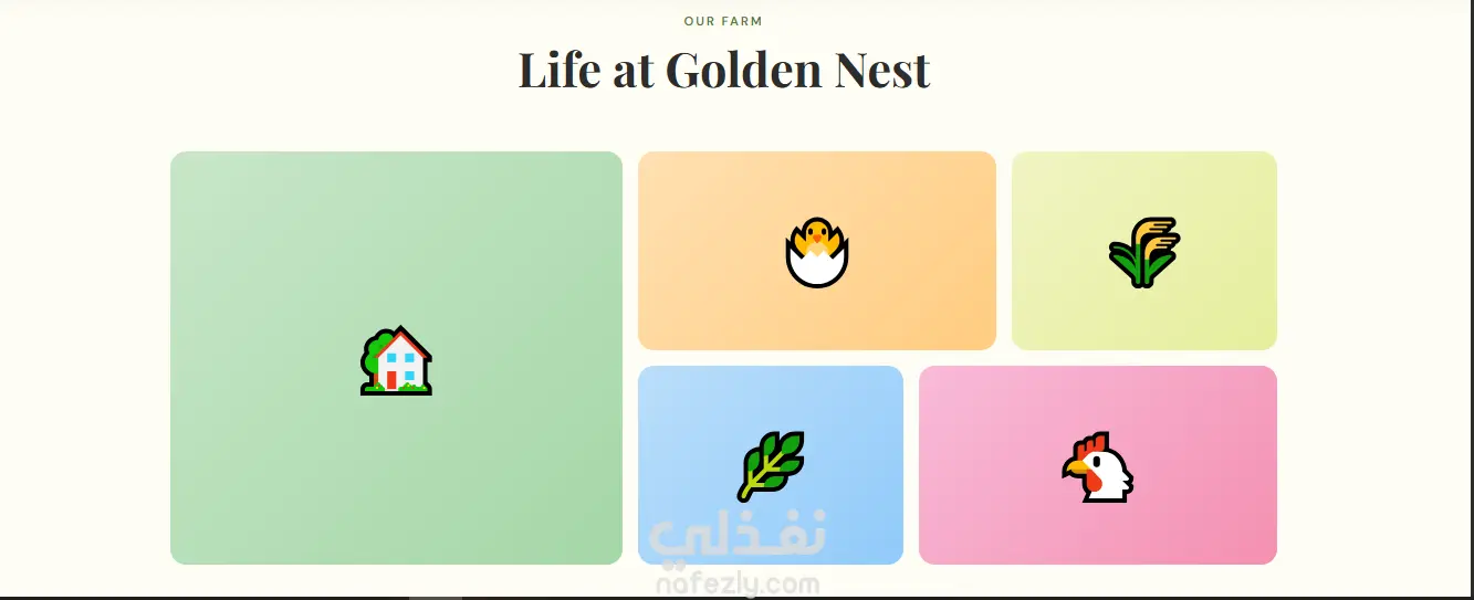 يعد مشروع "GoldenNest" نموذجاً عصرياً لصفحة هبوط احترافية تم تصميمها لتعكس هوية مزرعة دواجن بأسلوب تقني وجذاب. يتميز التصميم بتناسق بصري عالٍ يعتمد على ألوان هادئة ومريحة للعين، مع التركيز على تنظيم المحتوى من خلال بطاقات عرض المنتجات التي توضح أنواع السلالات ومميزاتها وأسعارها بدقة. يتضمن الموقع واجهة ملاحة سلسة تتيح للمستخدم الوصول السريع لمختلف الأقسام، بالإضافة إلى أزرار تفاعلية واضحة تهدف لتعزيز تجربة المستخدم وتسهيل اتخاذ قرار الشراء، مما يبرز الدمج بين البساطة والفعالية في تقديم الخدمات التجارية عبر الإنترنت.
