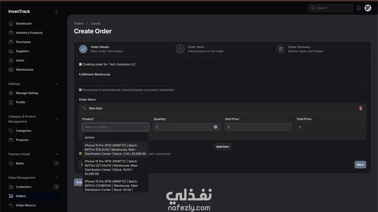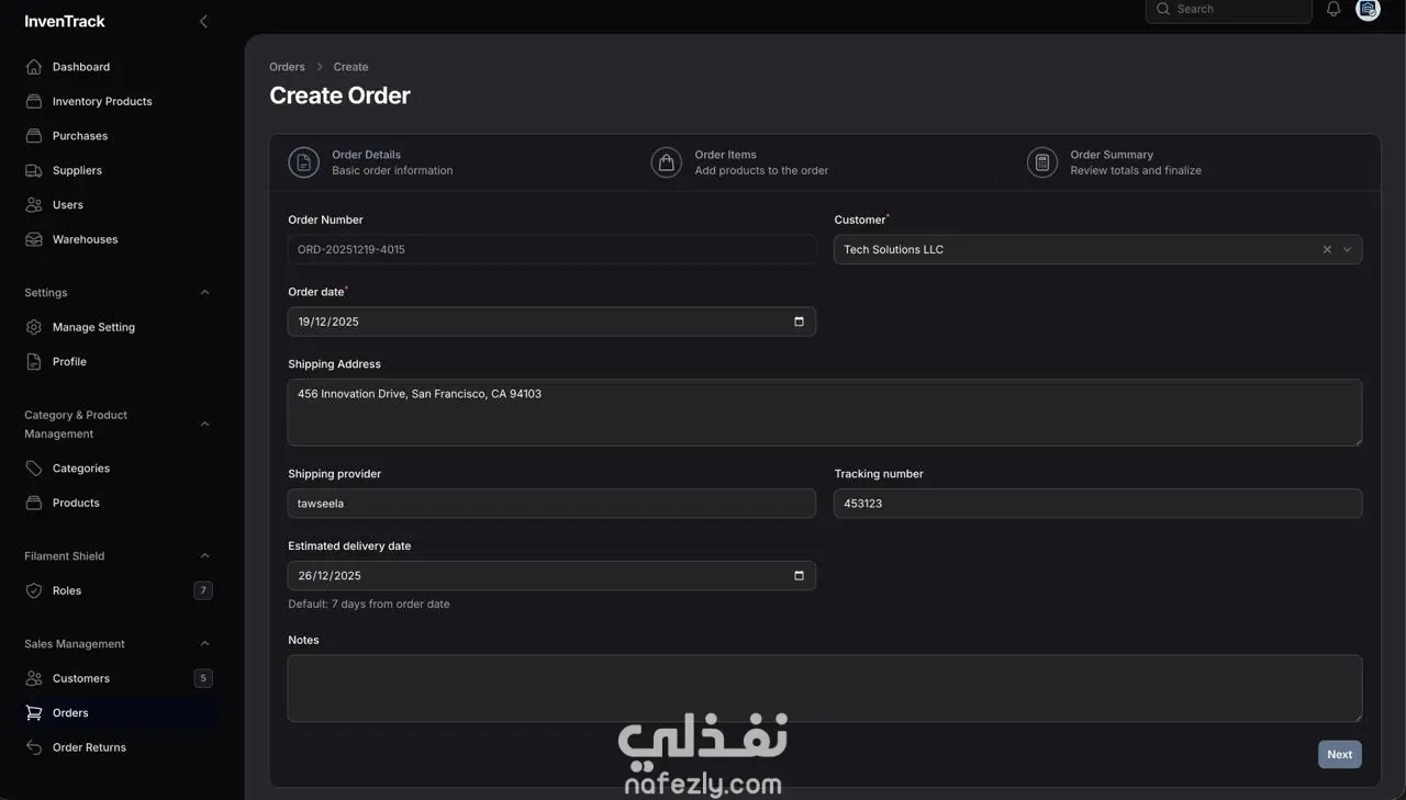 اقدم لك InvenTrack النظام المتطور المصمم خصيصا ليحول إدارة شركتك من العمليات اليدوية المعقدة إلى الأتمتة الكاملة بذكاء واحترافية. لقد صممنا هذا النظام ليكون الشريك التقني الأول لأصحاب الأعمال الذين يتطلعون للنمو والسيطرة الكاملة على موارد شركتهم. لماذا تختار نظام InventTrack لإدارة أعمالك؟ 1- إدارة ذكية للمخزون: تتبع منتجاتك بكل سهولة، من SKU وحتى تفاصيل الشراء، مع نظام تنبيهات دقيق للكميات وتوزيع آلي على المستودعات. 2- دورة مشتريات احترافية: وثق فواتيرك مع الموردين، تابع تواريخ التسليم المتوقعة، وحالات الدفع (مدفوع، معلق) بضغطة زر واحدة لضمان تدفق نقدي سليم. 3- تجربة إنشاء طلبات (Orders) سلسة: واجهة مستخدم عصرية (Dark Mode) تتيح لك إنشاء طلبات المبيعات في خطوات بسيطة، مع حساب تلقائي للضرائب والخصومات، وربط مباشر مع شركات الشحن وتتبع الطرود. 4- دعم المستودعات المتعددة: سواء كان لديك مستودع واحد أو سلسلة مخازن، InventTrack يمنحك نظرة شاملة وتفصيلية لكل موقع على حدة. 5- إدارة الصلاحيات والأدوار: تحكم كامل فيمن يرى ماذا! نظام متطور للأدوار (Roles) يضمن أمان بياناتك وخصوصية أقسام شركتك. 6- تقارير لحظية ودقيقة: واجهة داشبورد تعرض لك أهم الأرقام التي تحتاجها لاتخاذ قرارات تجارية ذكية ومبنية على بيانات حقيقية. ما الذي ستحصل عليه؟ عند شراء هذه الخدمة، لن تحصل فقط على برمجة، بل ستحصل على منظومة عمل متكاملة تتميز بواجهة مستخدم (UI) عصرية ومريحة للعين، وسرعة فائقة في الأداء، ودعم فني مستمر لضمان سير عملك دون توقف. اجعل شركتك تدار باحترافية الشركات الكبرى، اطلب الخدمة الآن وانقل عملك لمستوى جديد من الكفاءة.