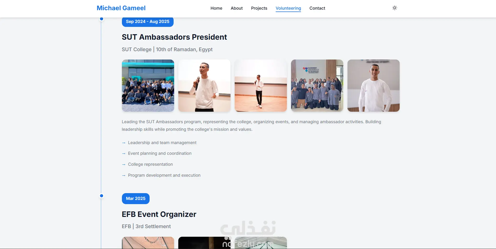 - بدلا من السرد التقليدي، اعتمدت نظام "الجدول الزمني" (Timeline) لعرض الخبرات التطوعية والعملية، مما يعطي انطباعاً بالنمو والاستمرارية.